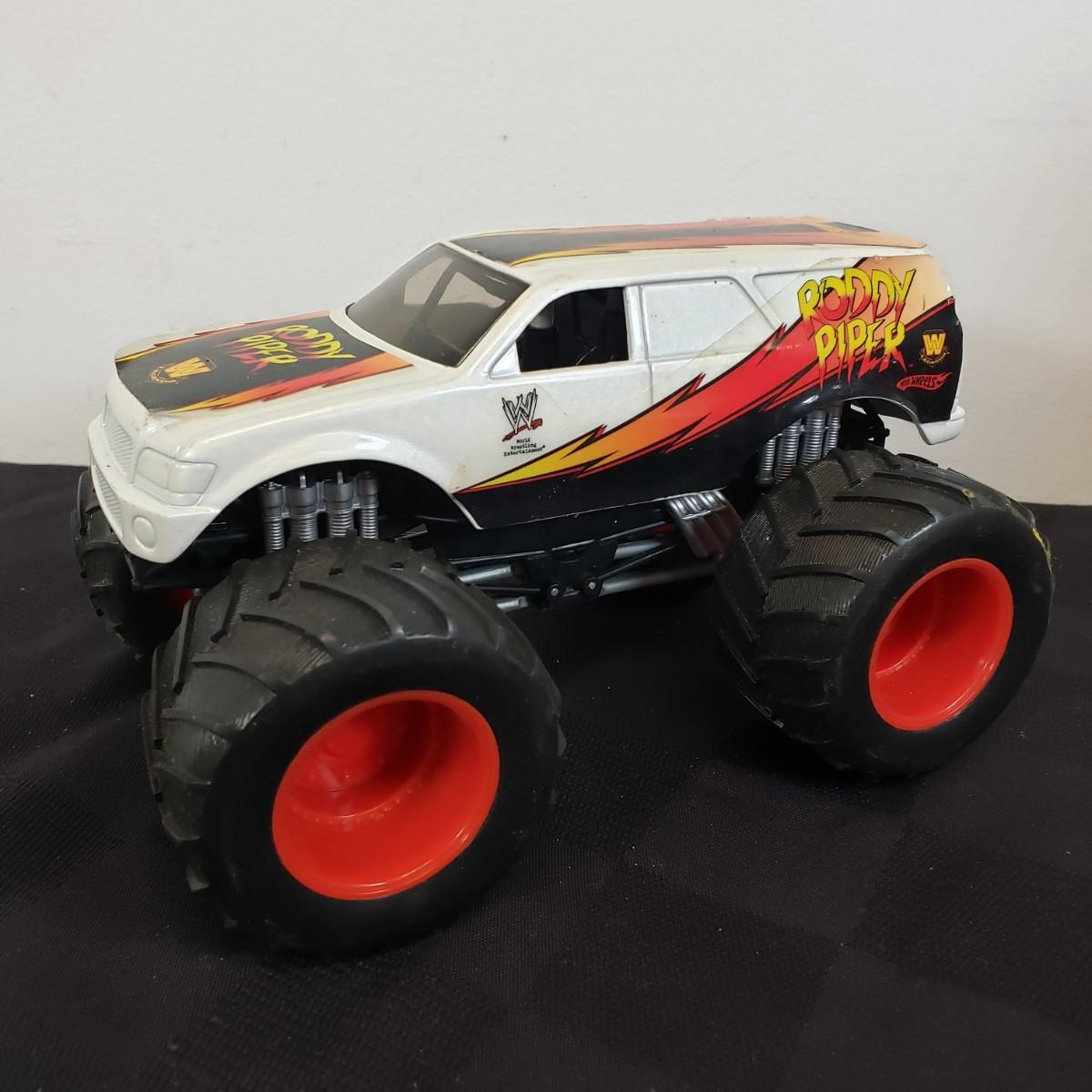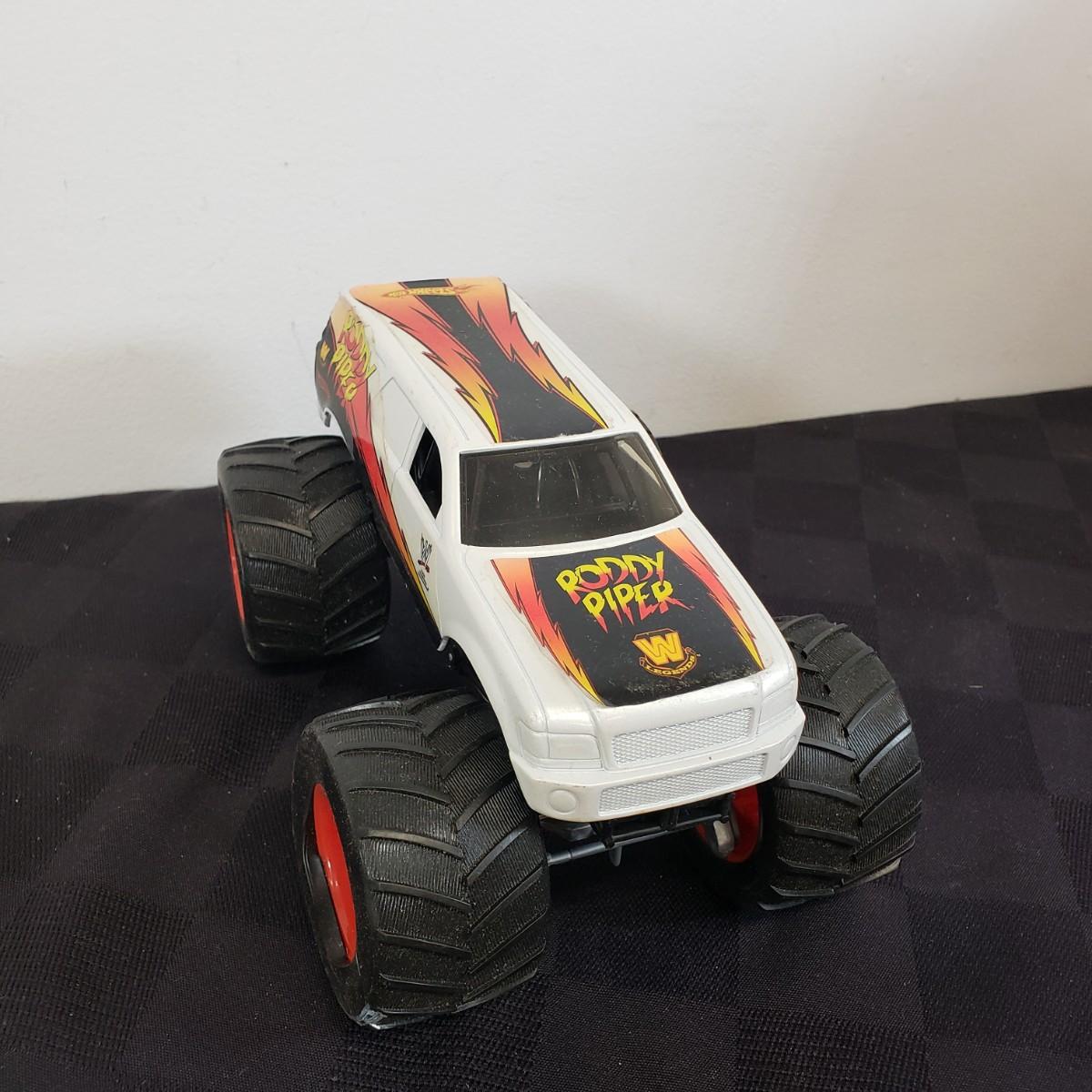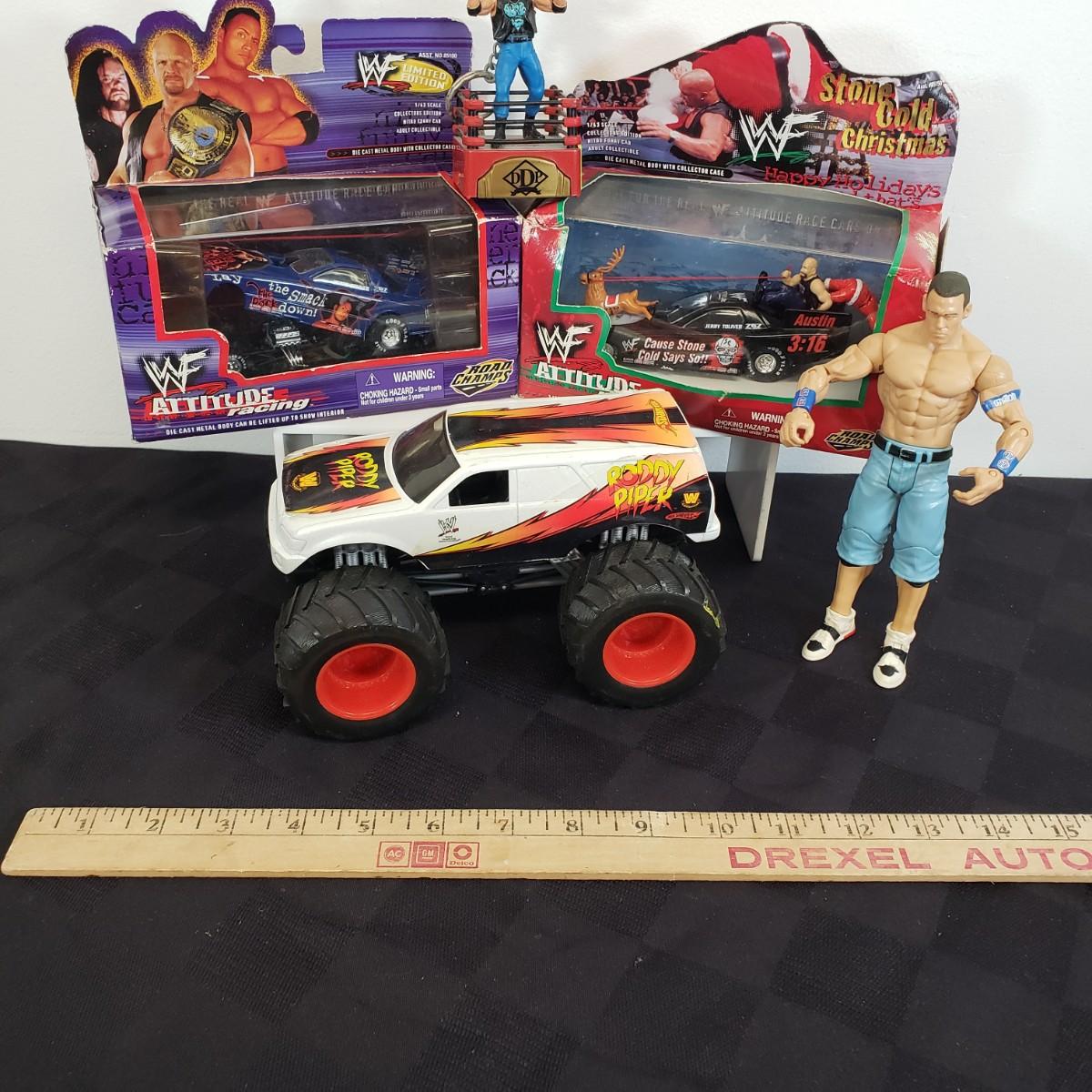 LOT 147: Vintage WWF Road Champs Cars, Roddy Piper Monster Truck, WCW Diamond Dallas Page Keychain & John Cena Action Figure
