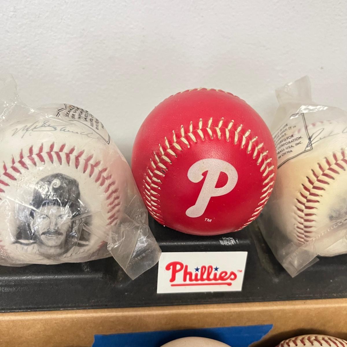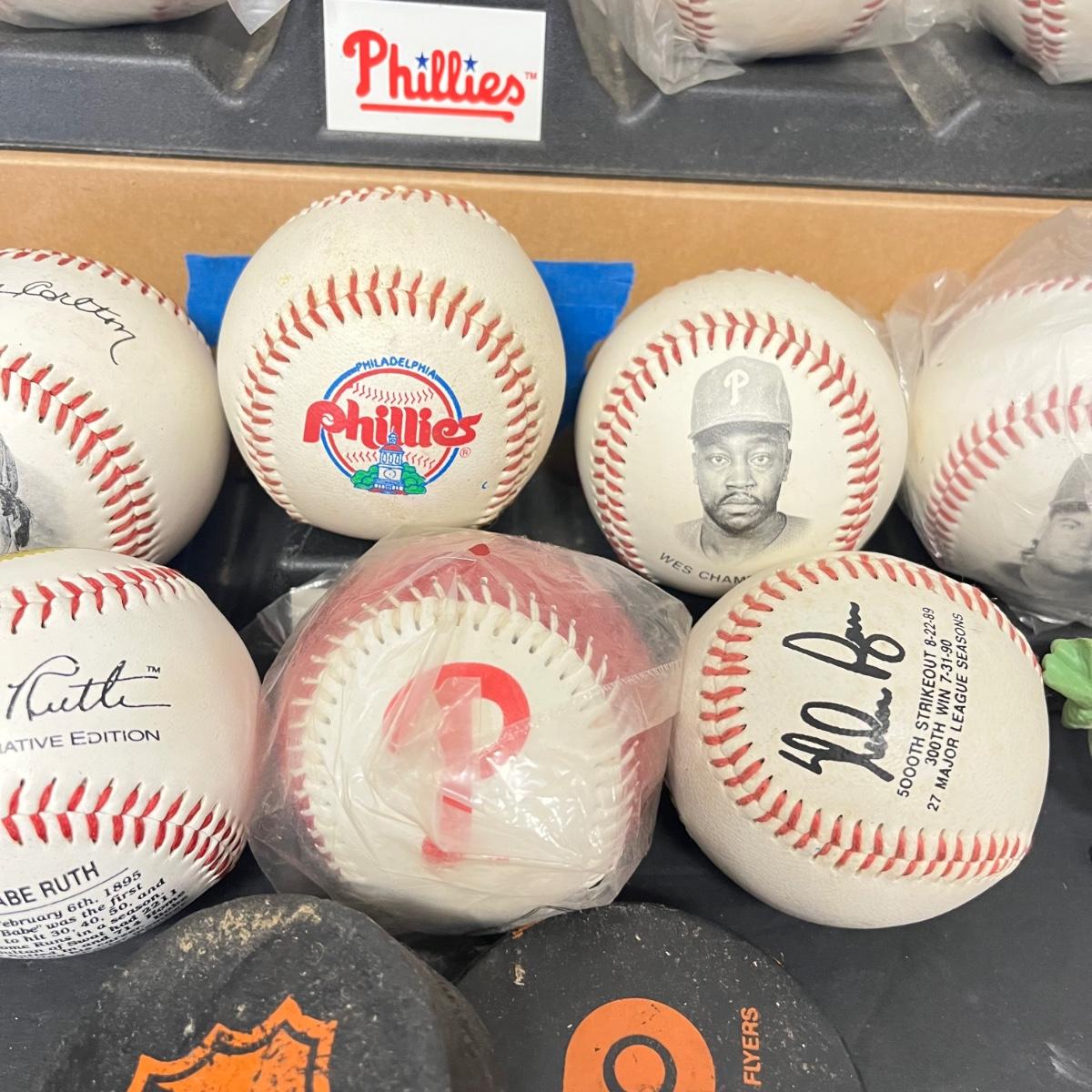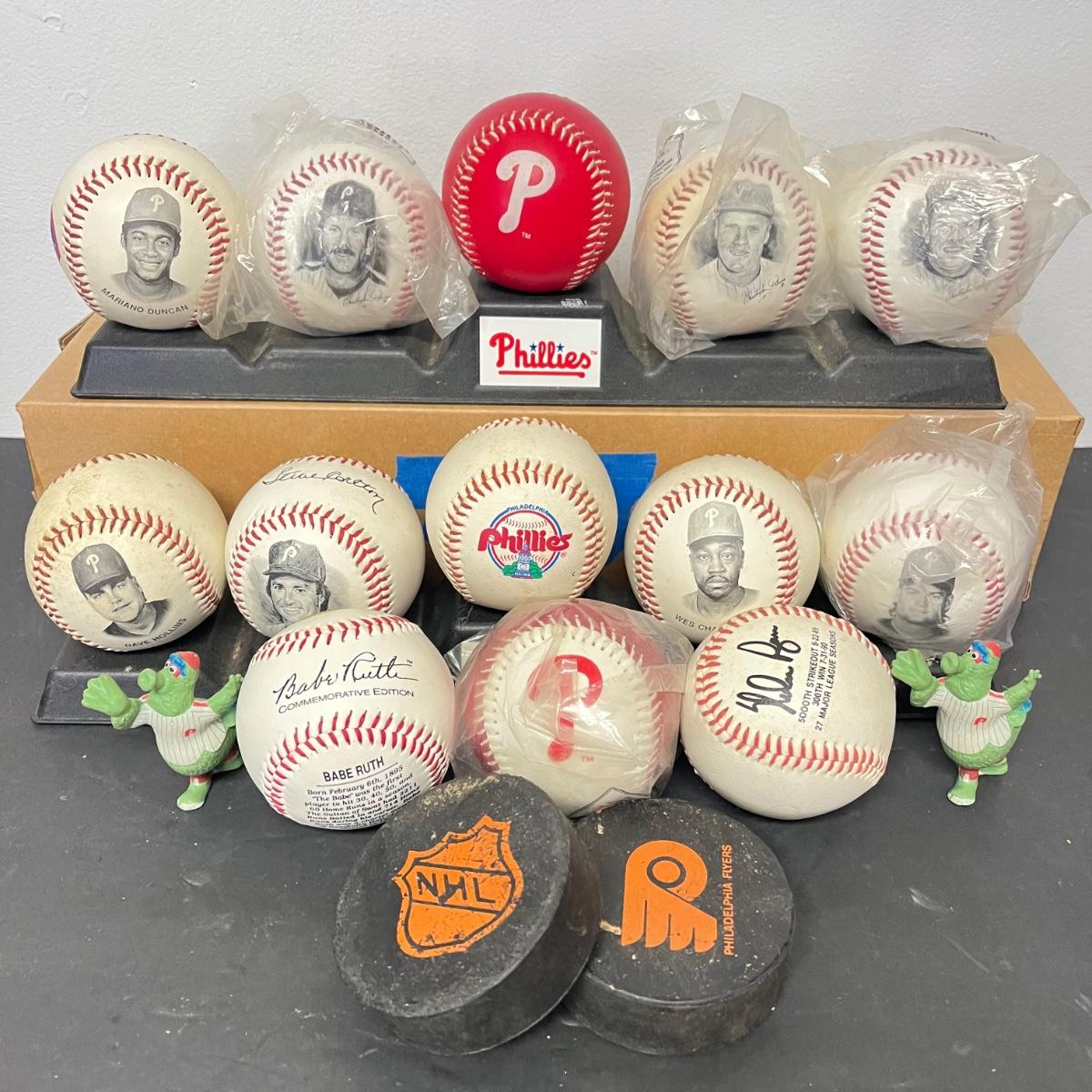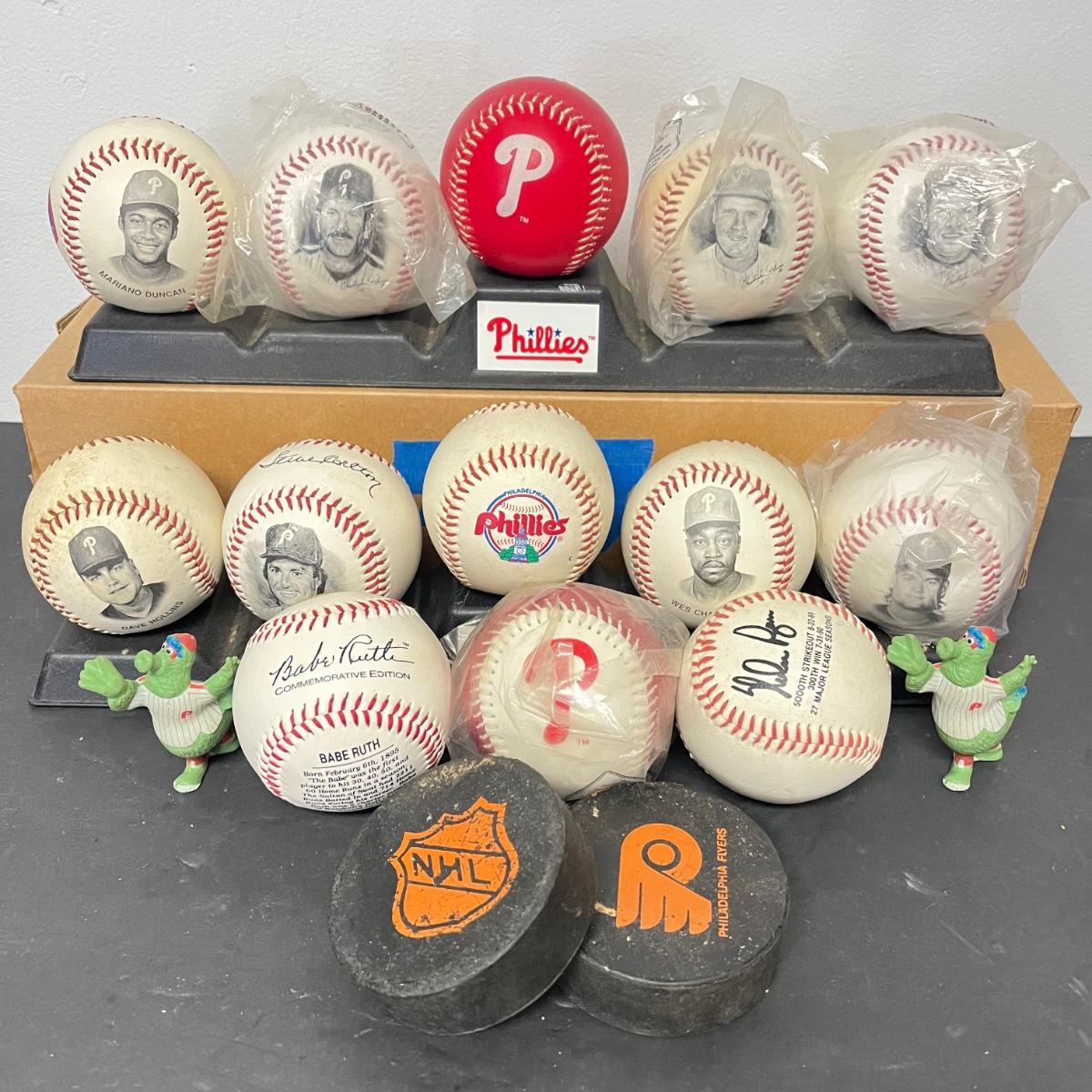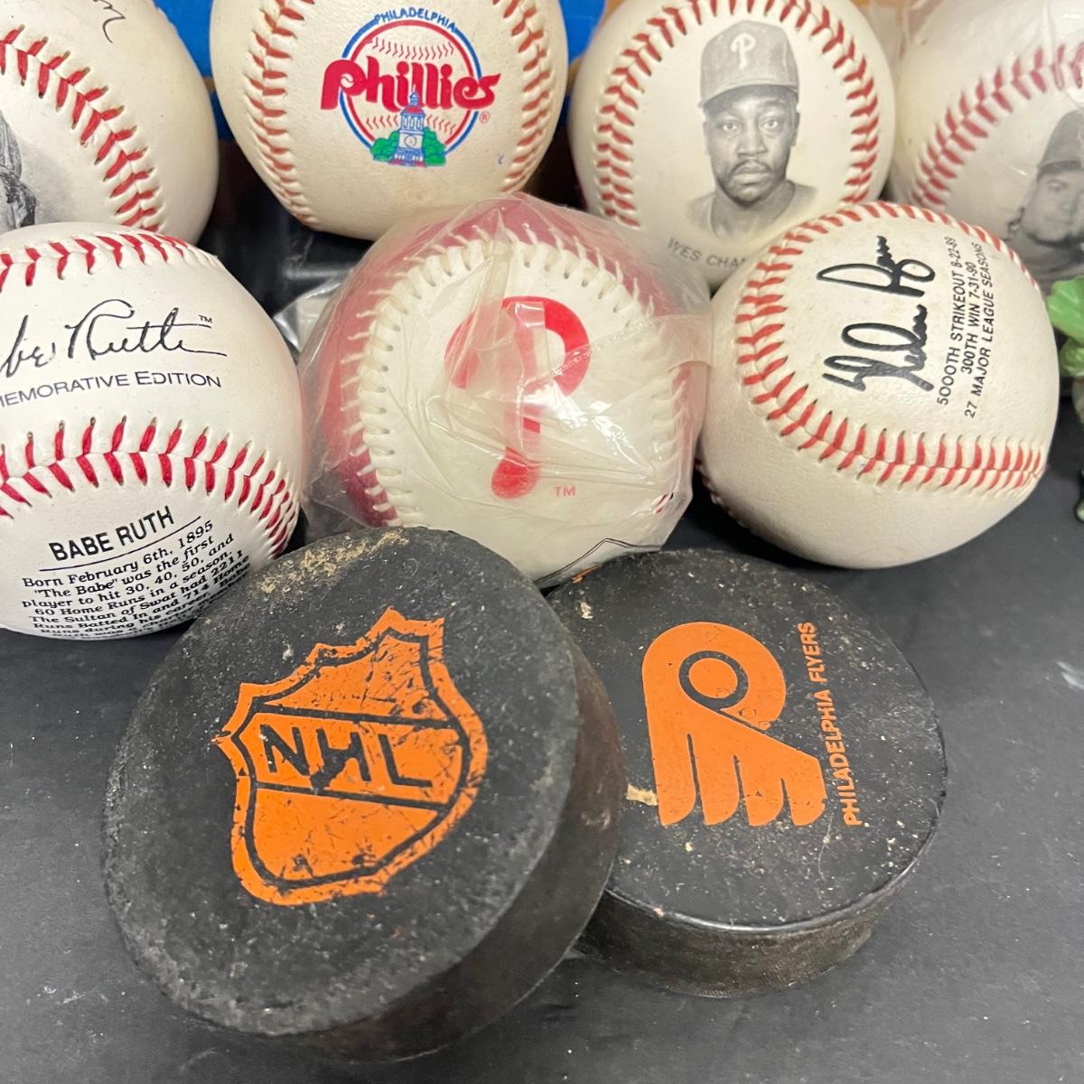 LOT 183: Philadelphia Sports Collection - Phillies Baseballs, Flyers Hockey Pucks