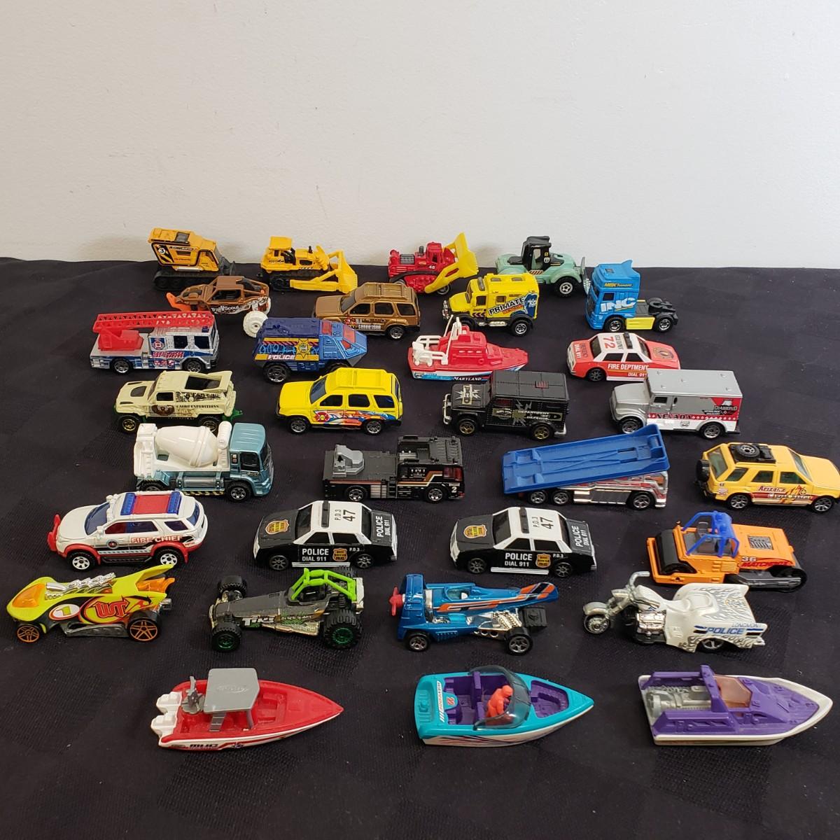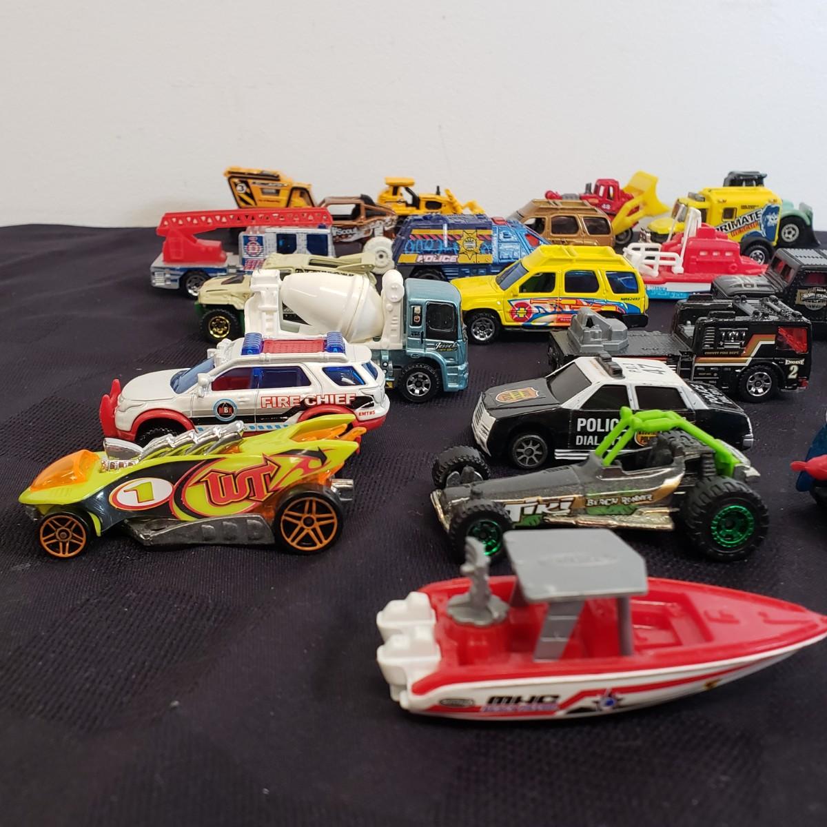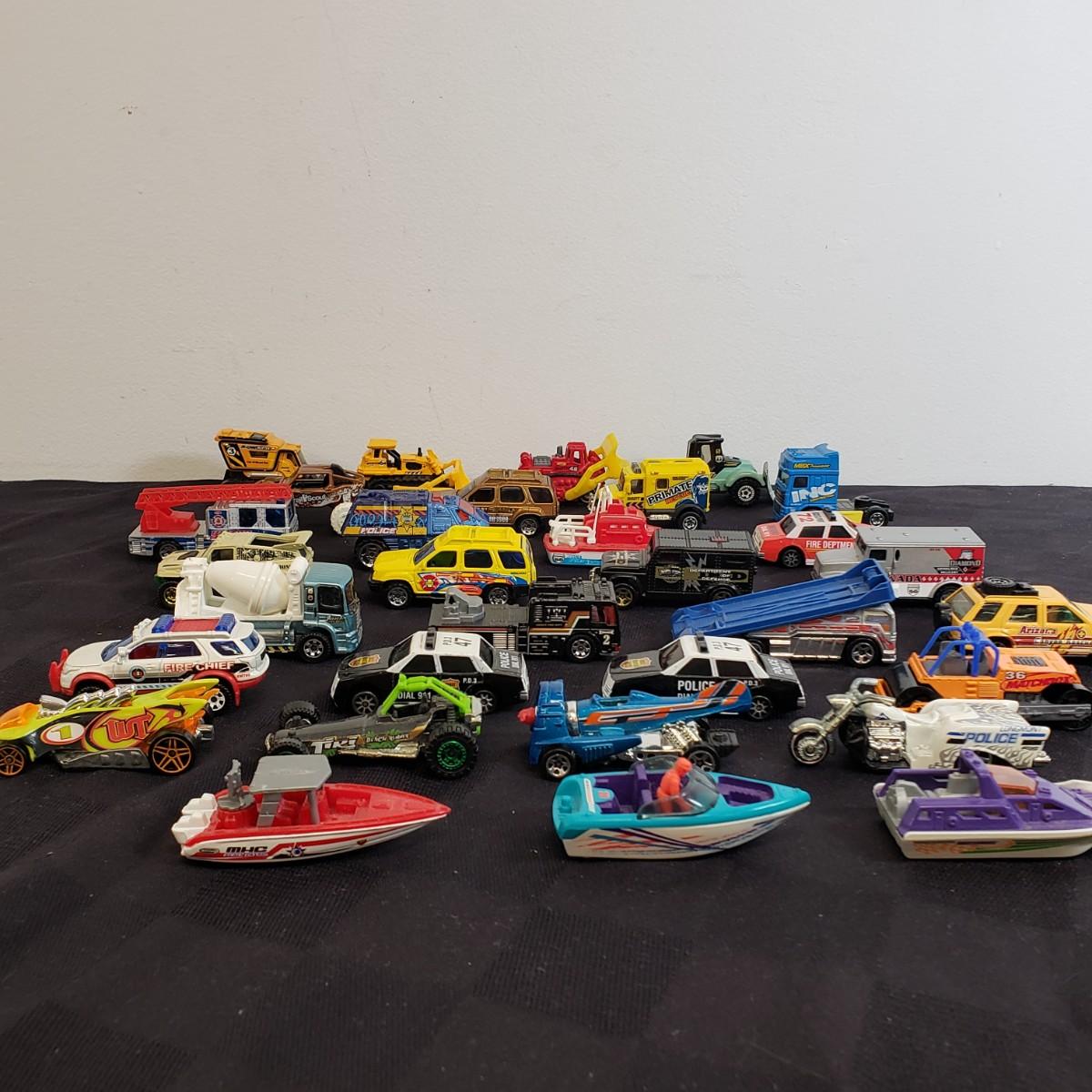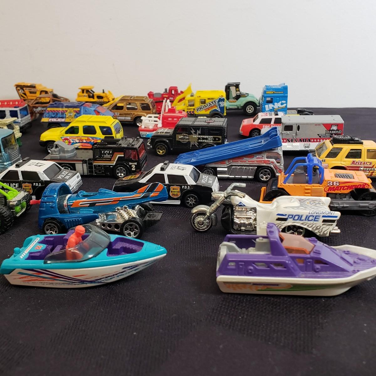 LOT 222: Assortment of Specialty Cars & Trucks with Boats-Matchbox, Hot Wheels & More