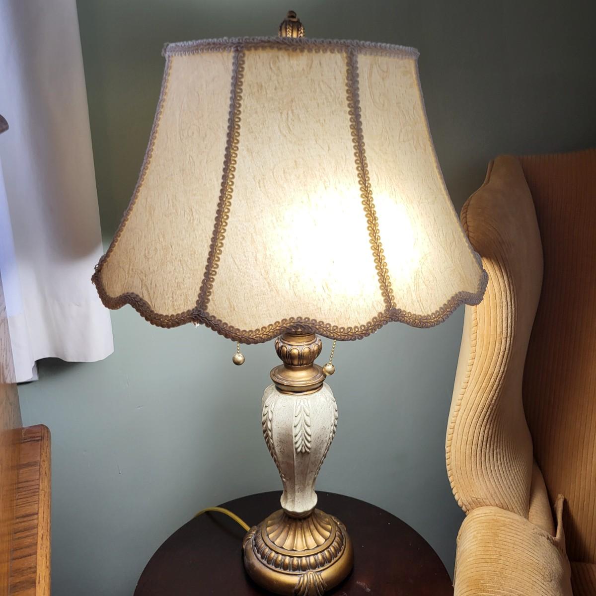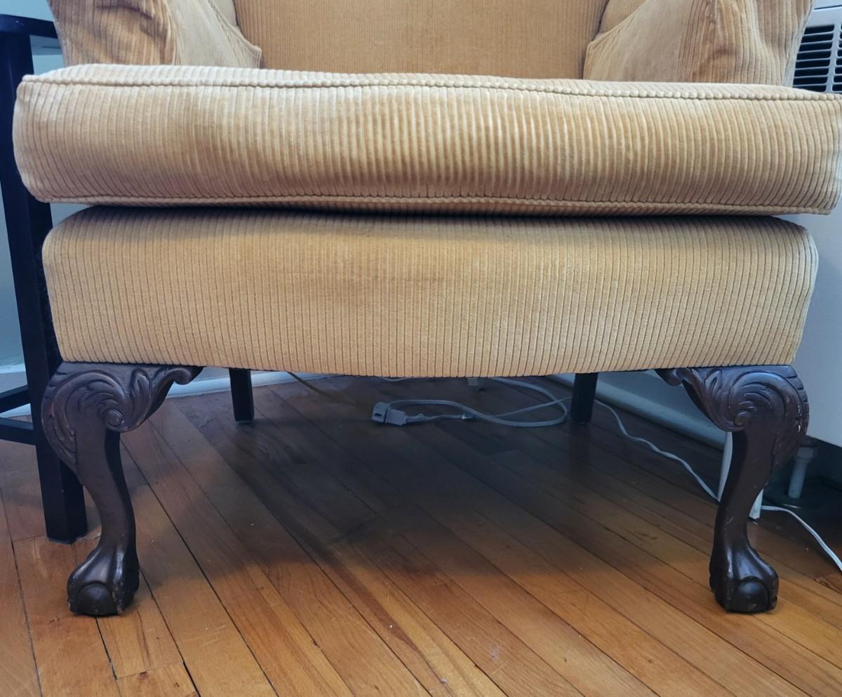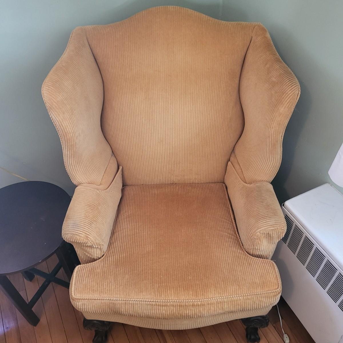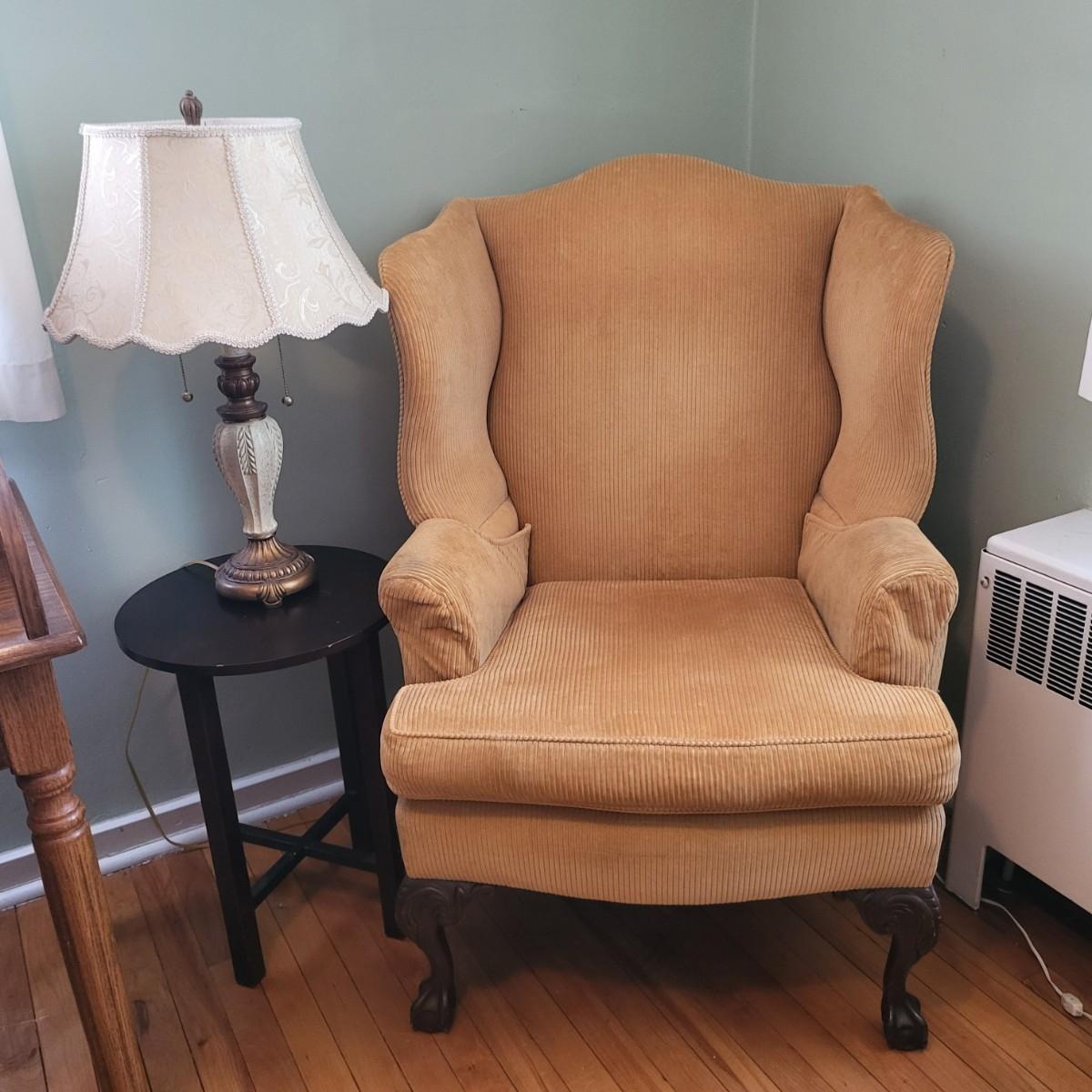 LOT 40: Vintage Tan Corduroy Wing-Back Chair with End Table and Table Lamp
