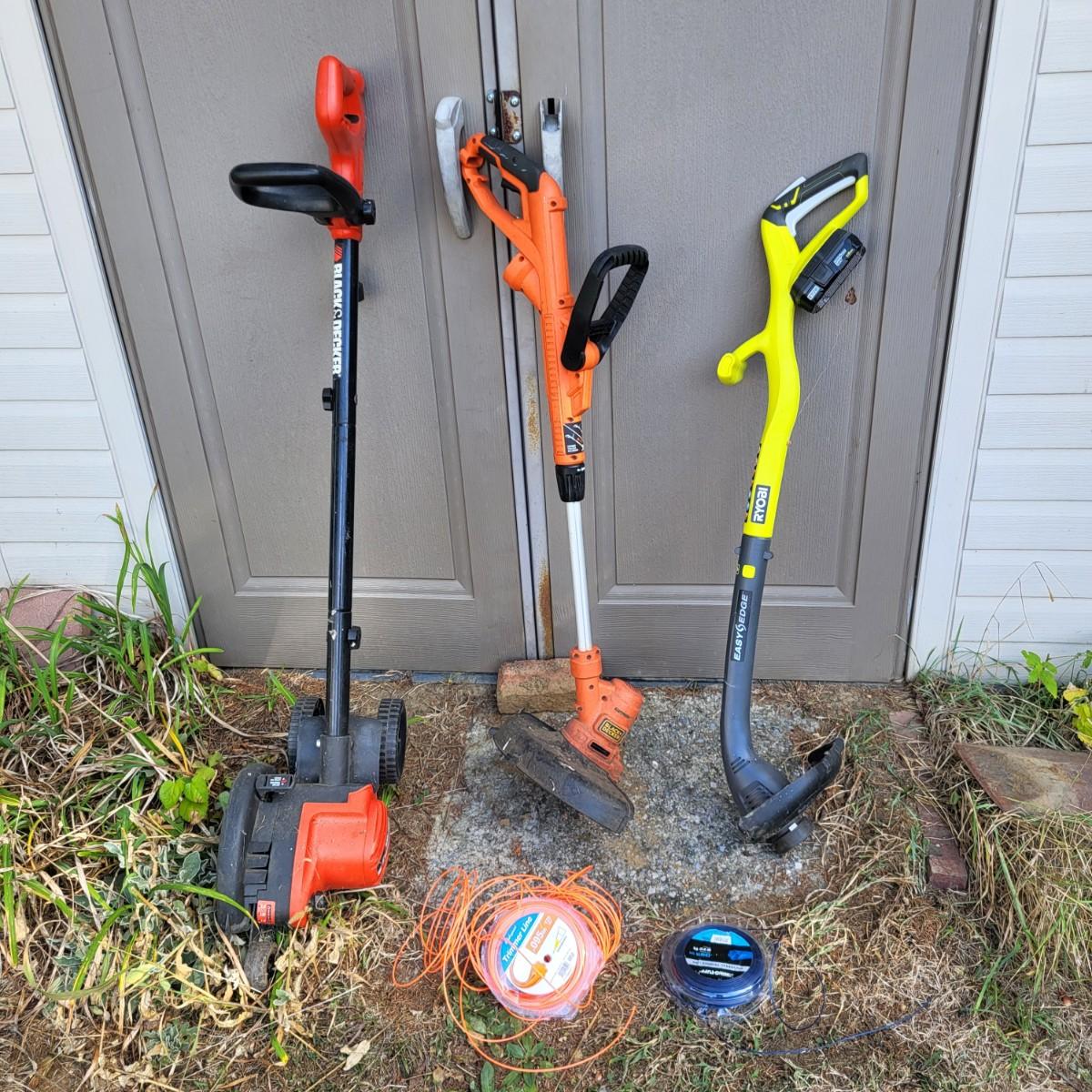 LOT 50: Ryobi Wireless Weed Trimmer, Black & Decker Corded Weed Trimmer and Edger Yard Tools with Pair of Trimming Line Spools