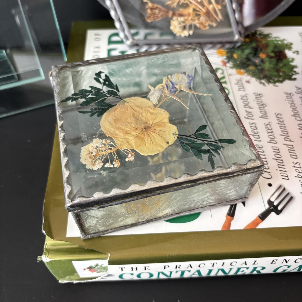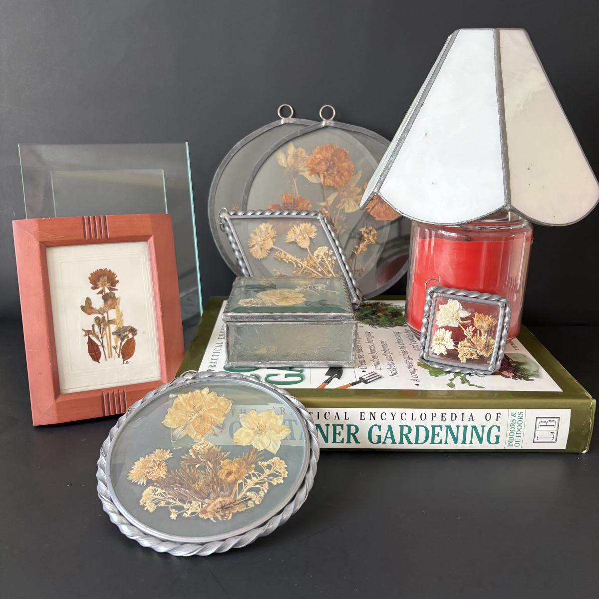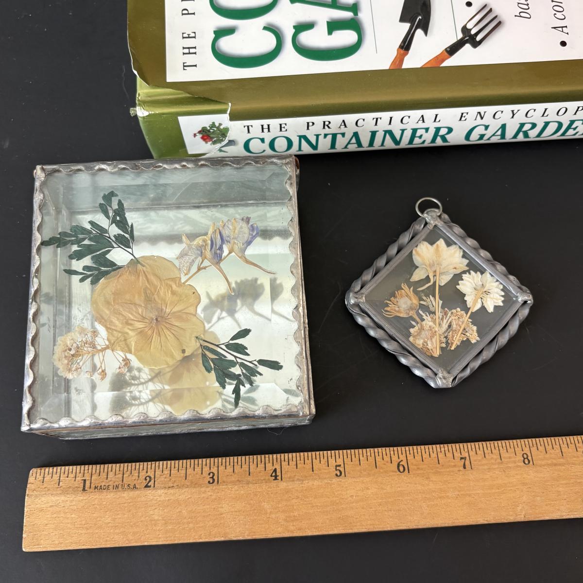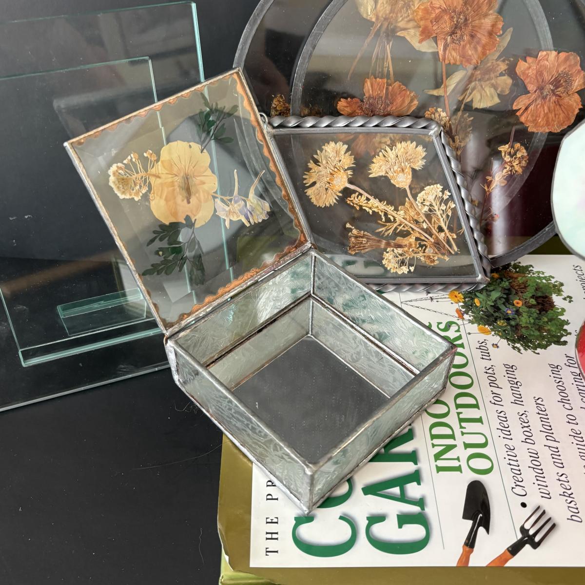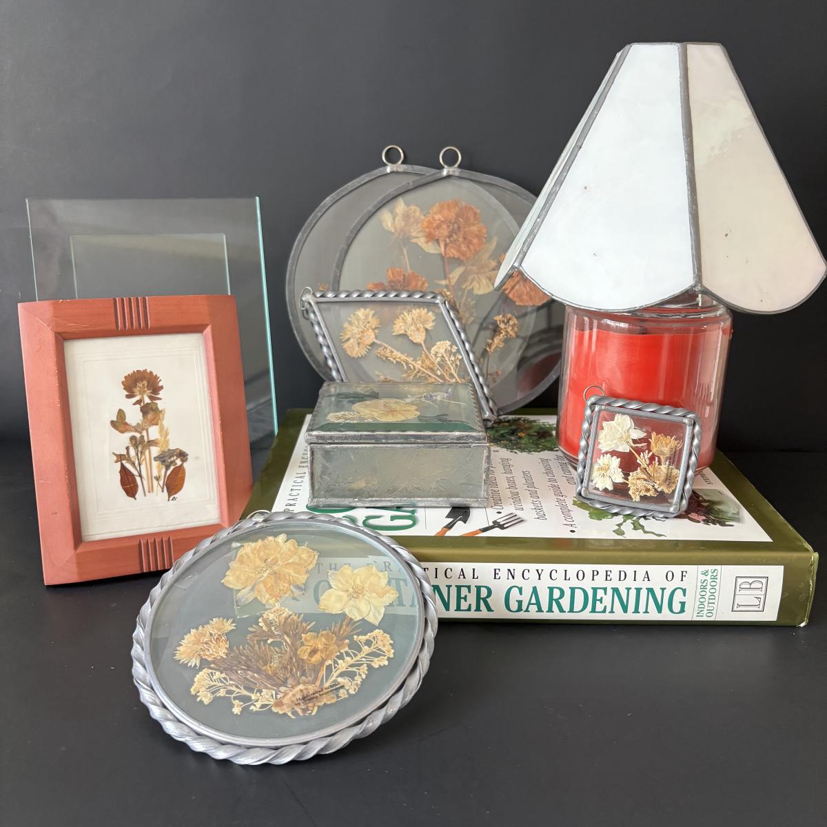 LOT 90: Stained Glass Candle Shade, Pressed Dried Flowers Hanging Glass Art, Dried Flower Trinket Box and More