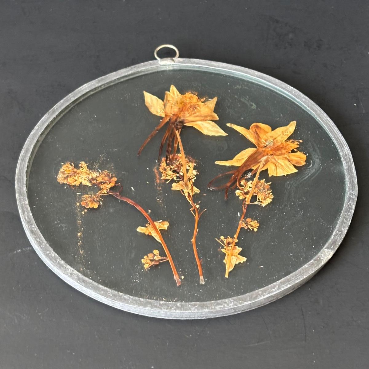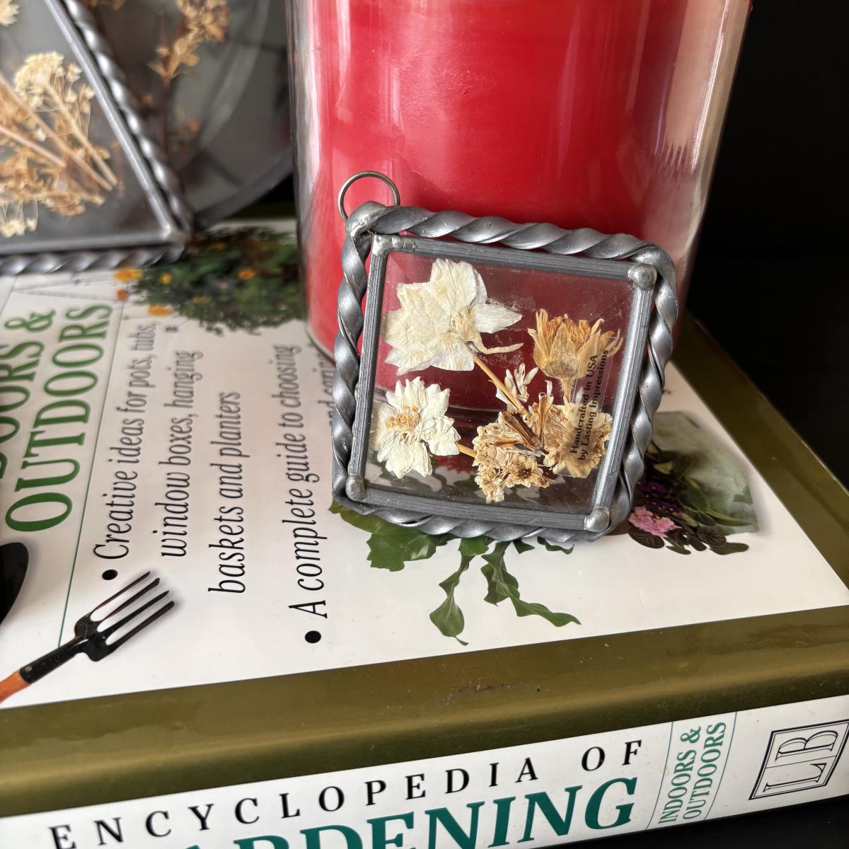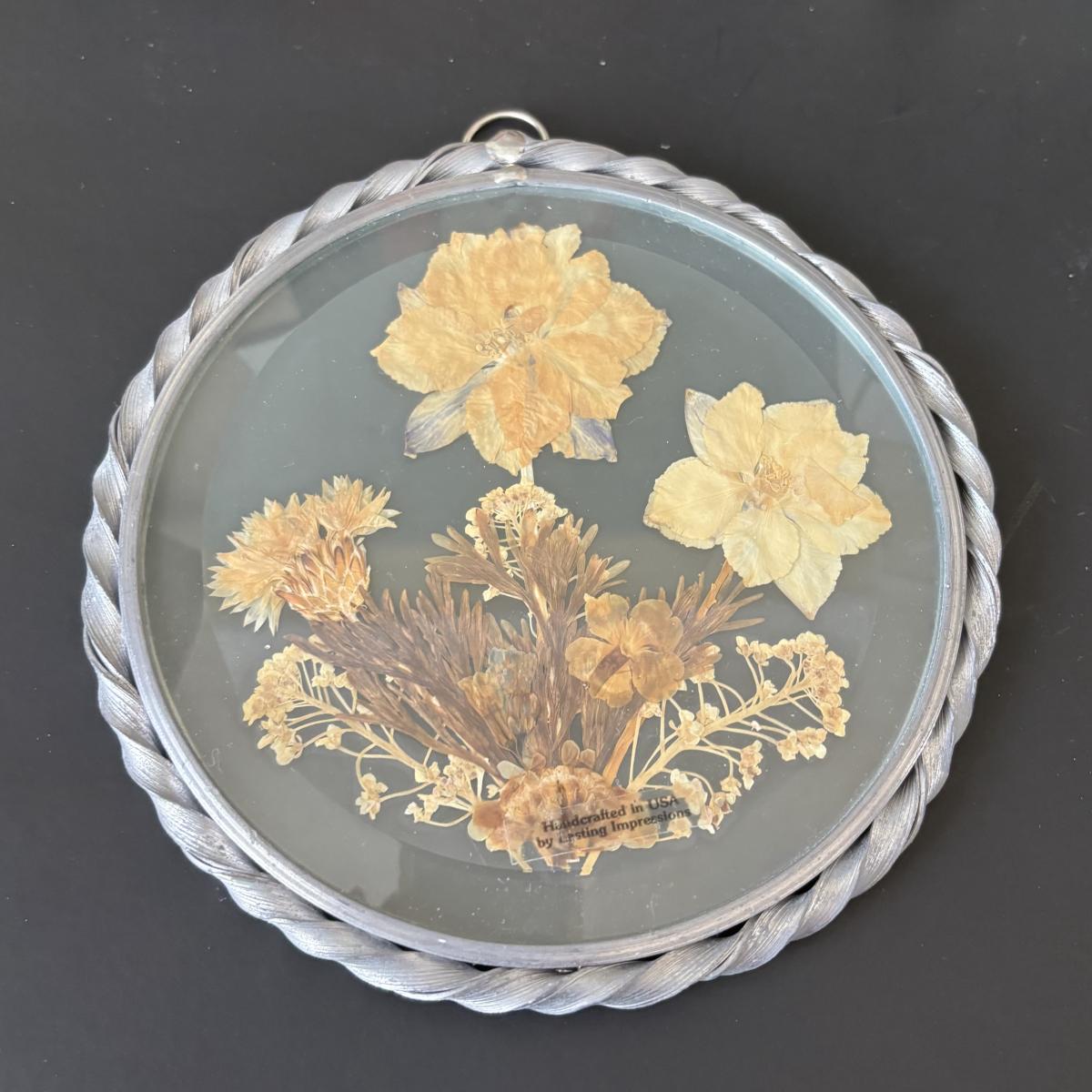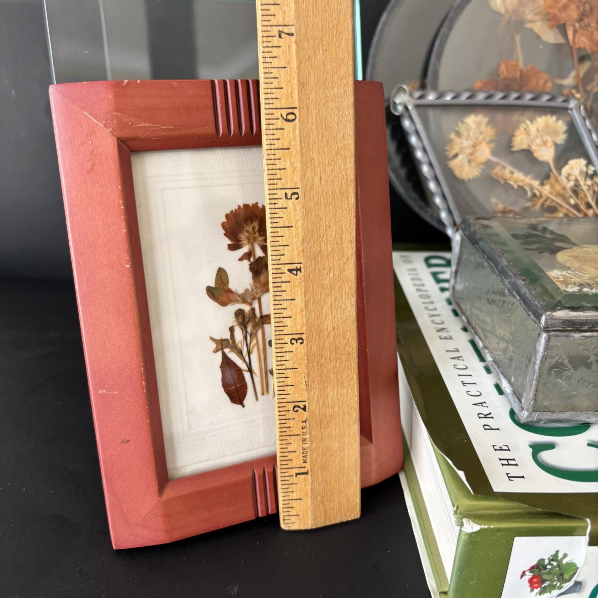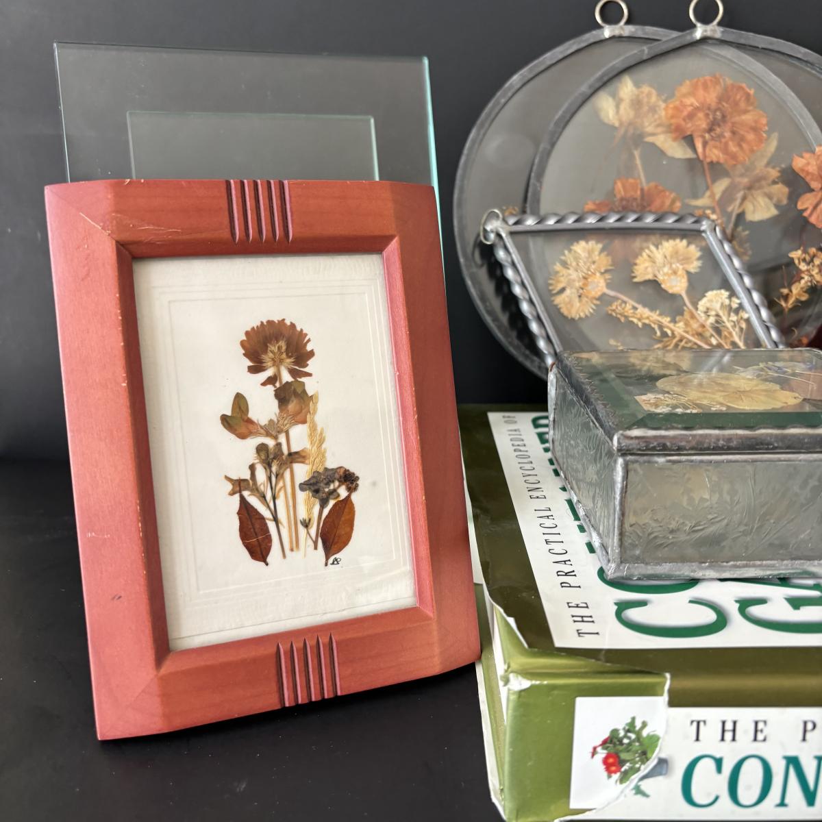 LOT 90: Stained Glass Candle Shade, Pressed Dried Flowers Hanging Glass Art, Dried Flower Trinket Box and More