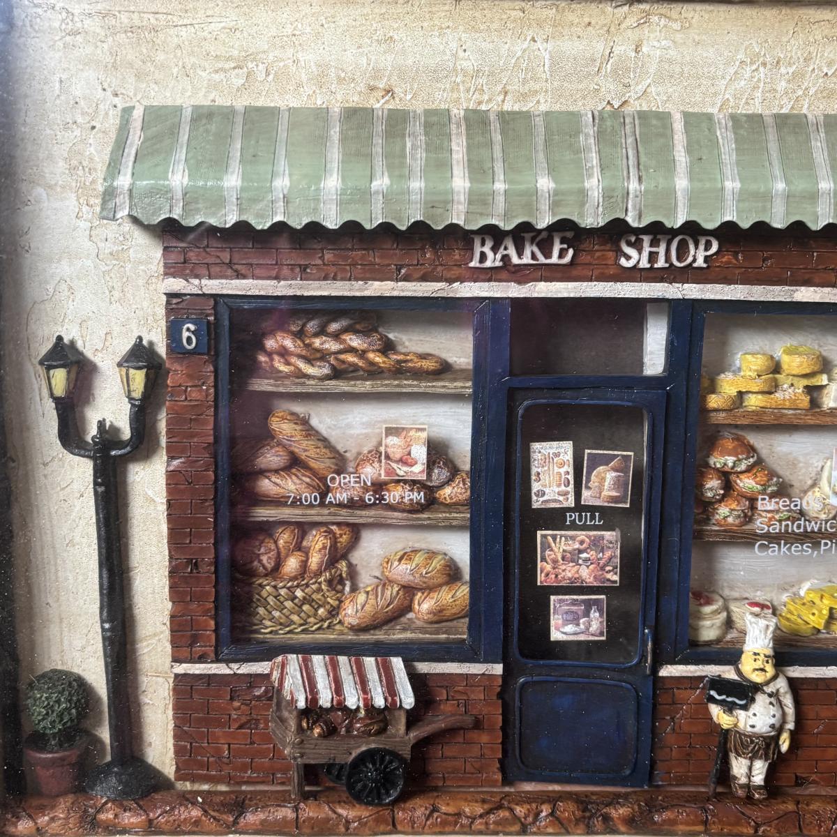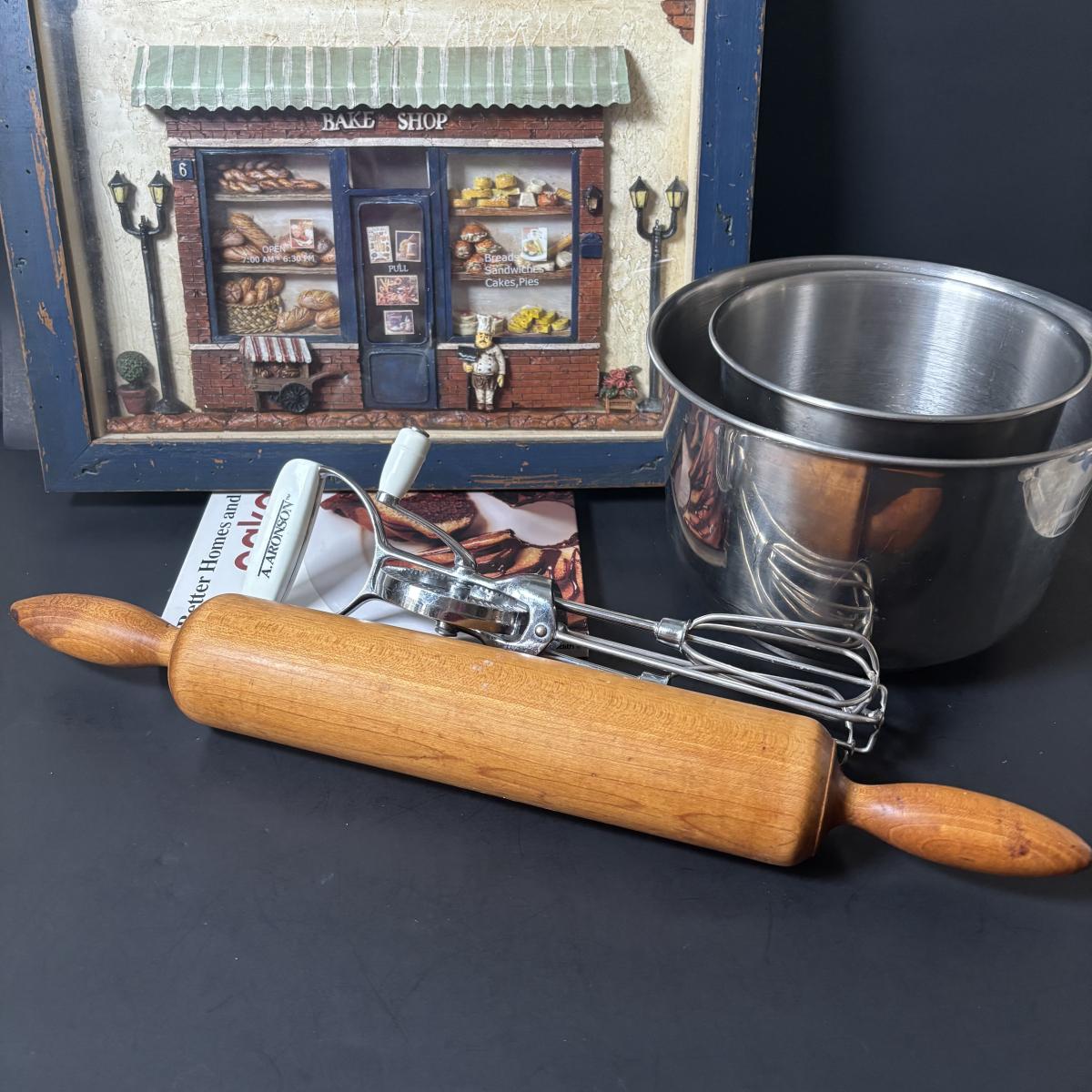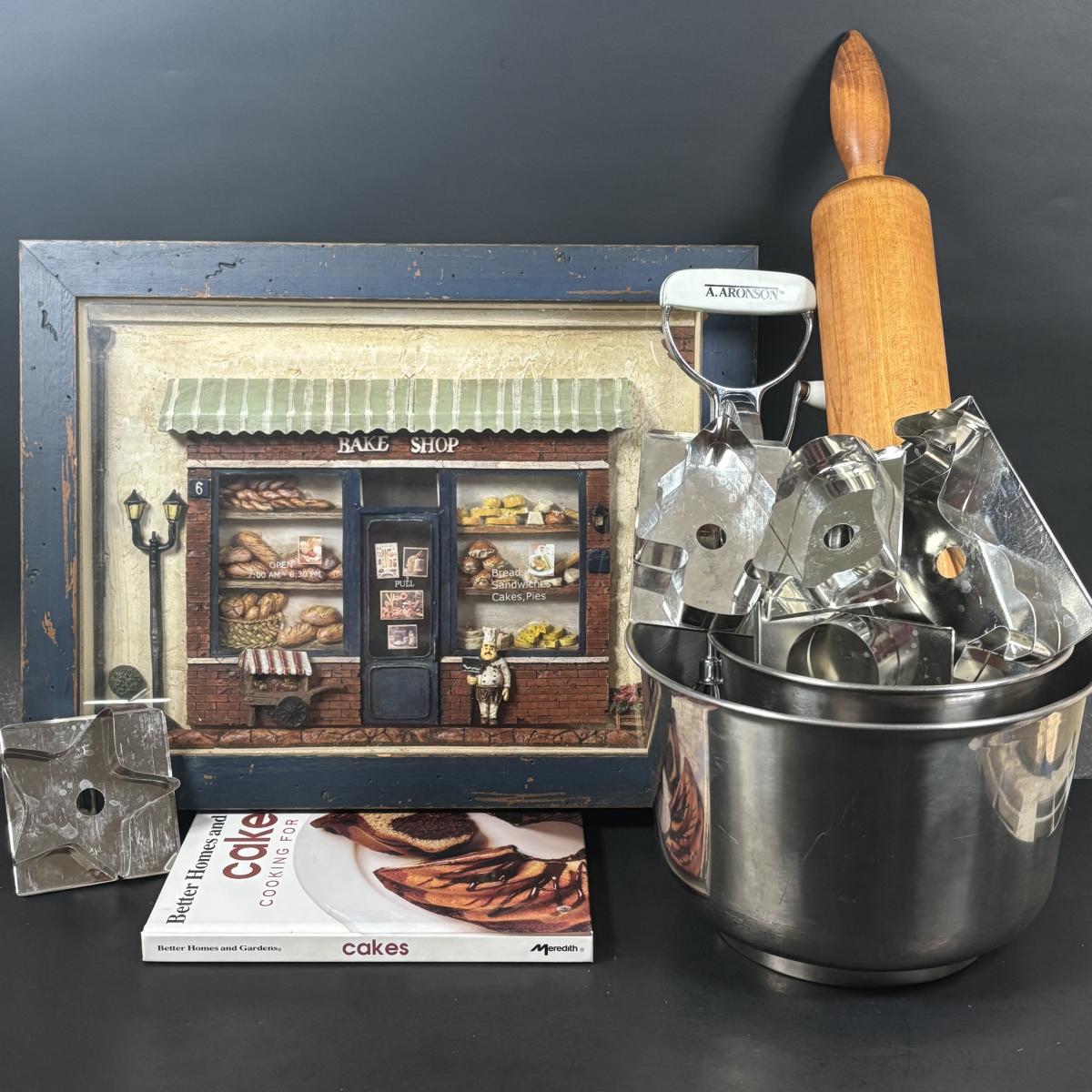 LOT 102: Bakery Diorama Wall Decor, Stainless Steel Bowls, Wooden Rolling Pin, Cookie Cutters & More