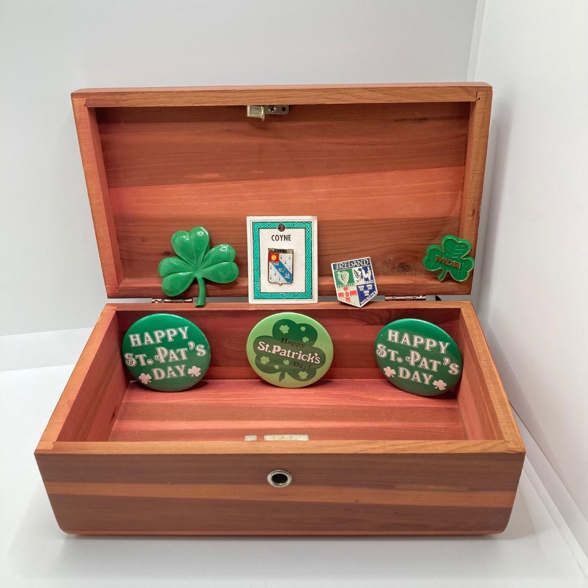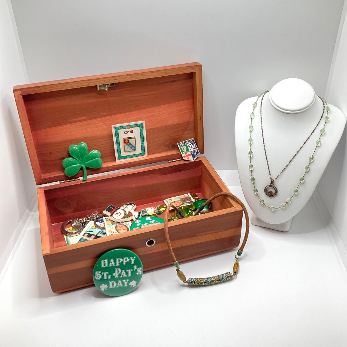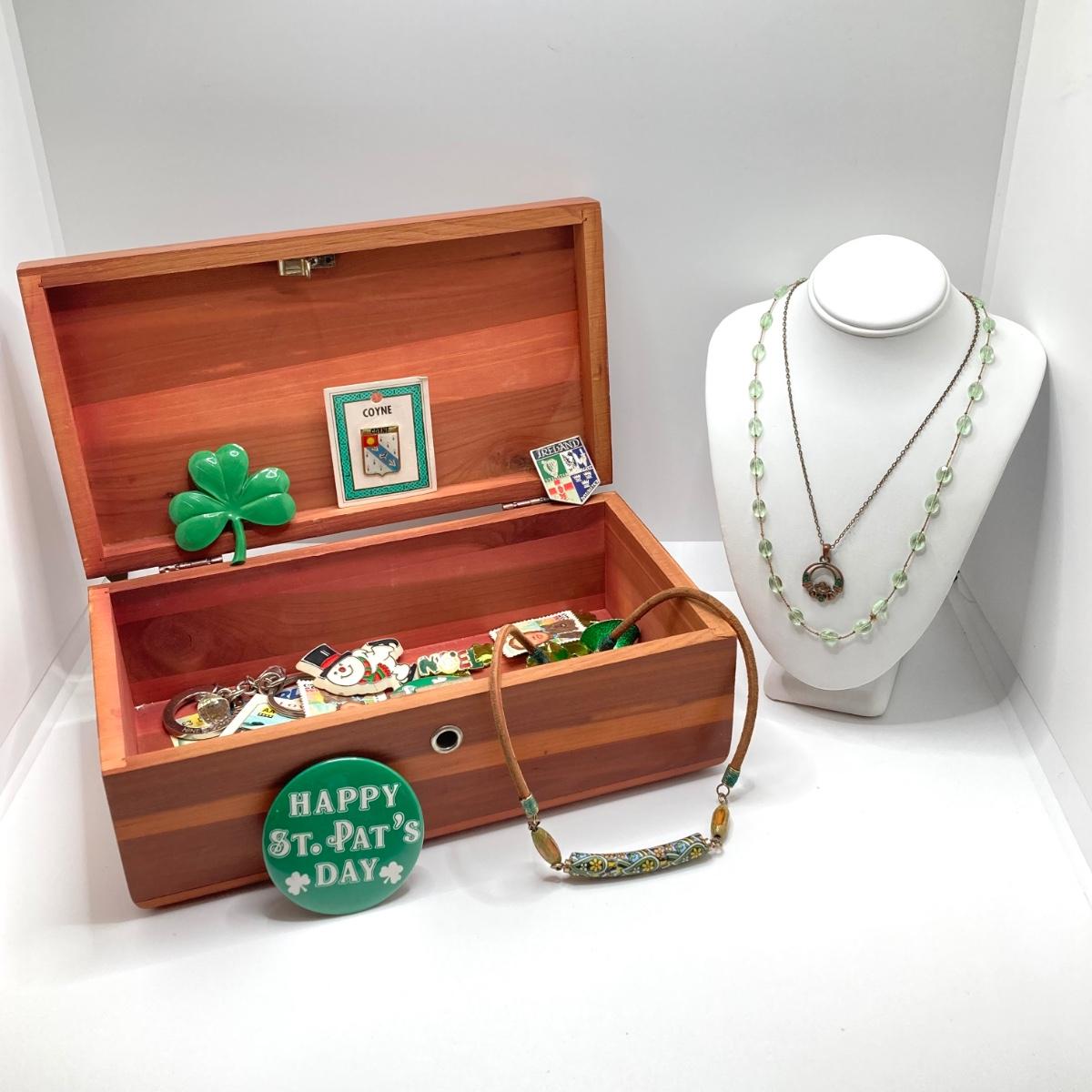 LOT 125: Vintage Wooden Box with Irish Themed Jewelry, Pins, Souvenirs, Memorabilia and More