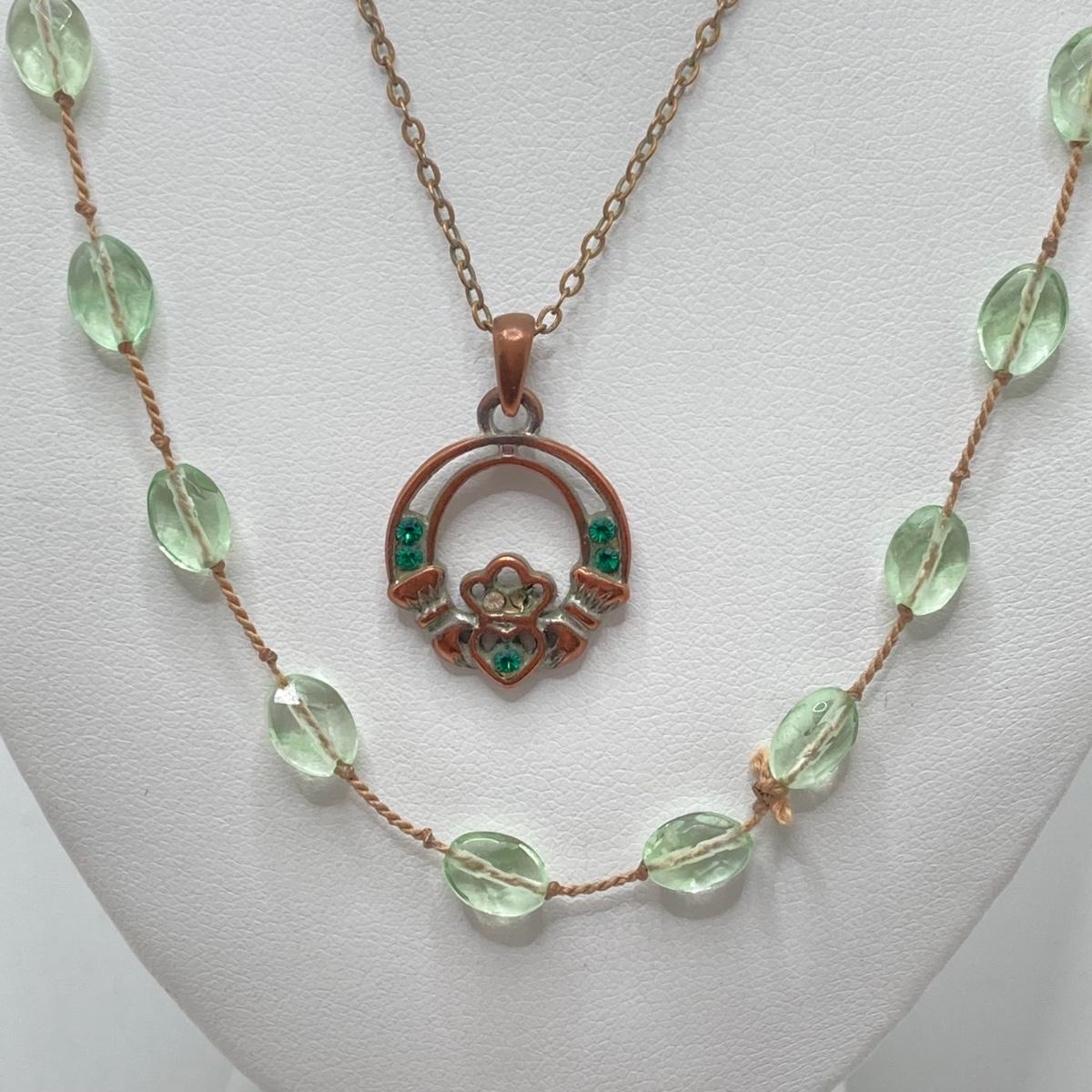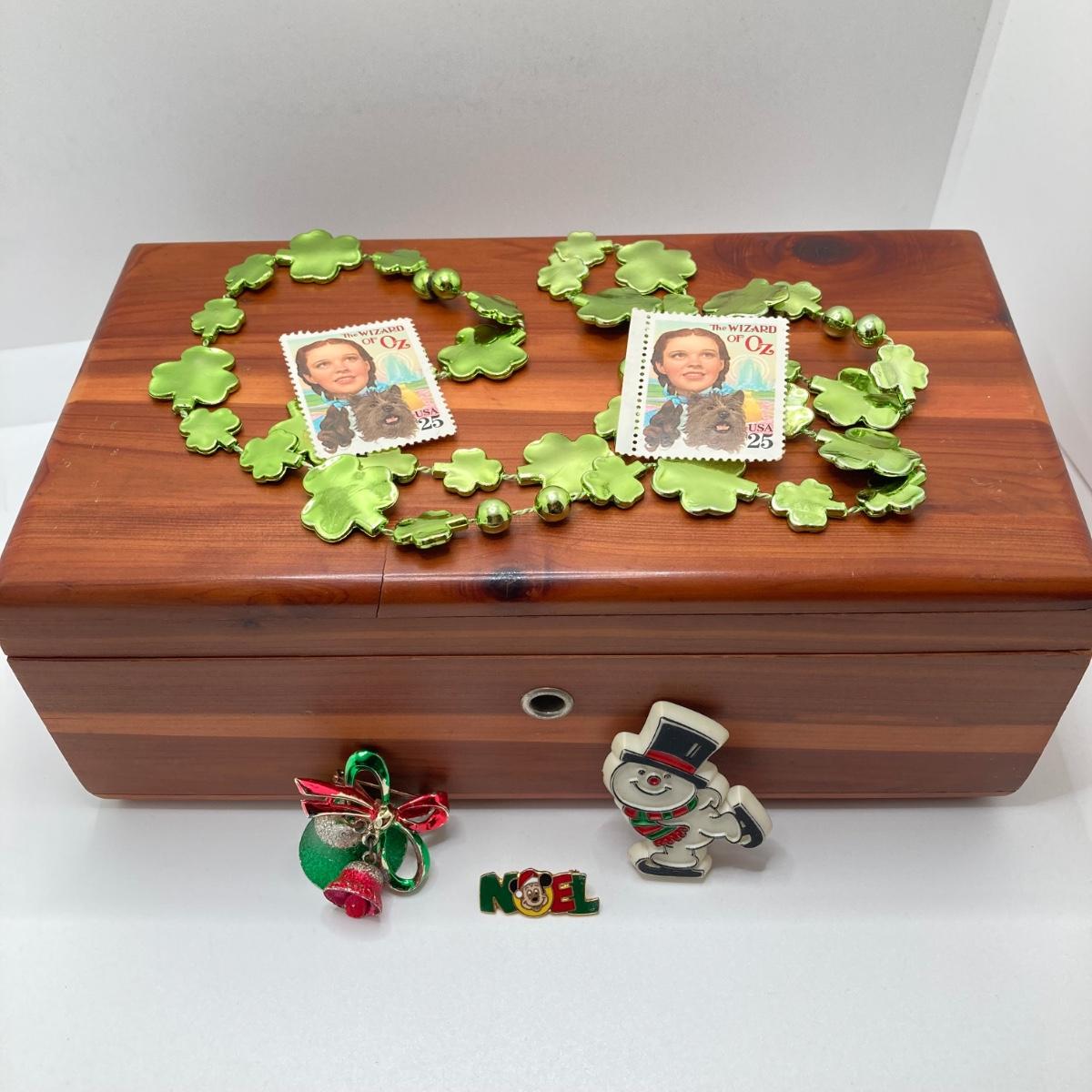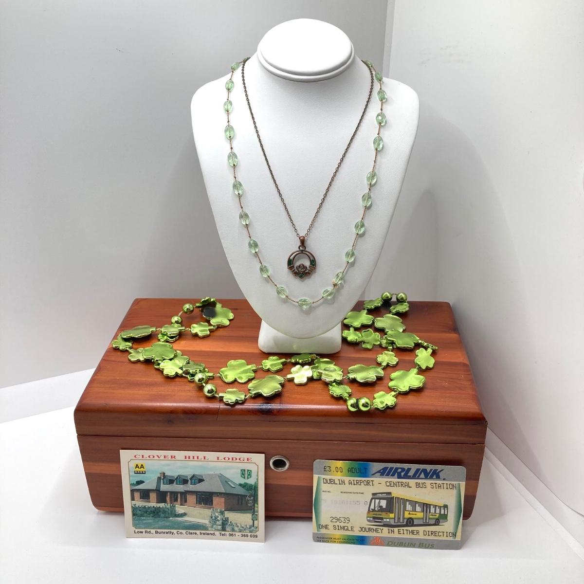LOT 125: Vintage Wooden Box with Irish Themed Jewelry, Pins, Souvenirs, Memorabilia and More