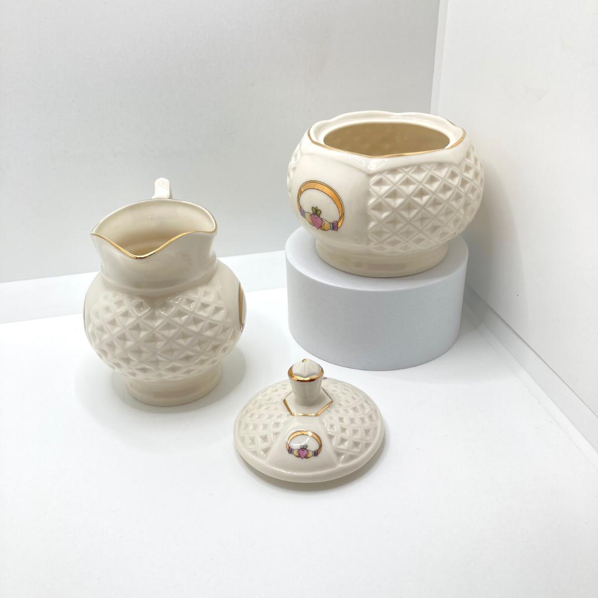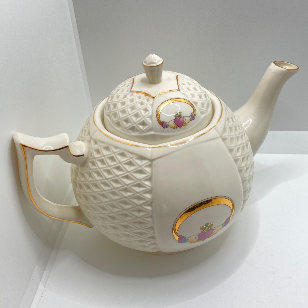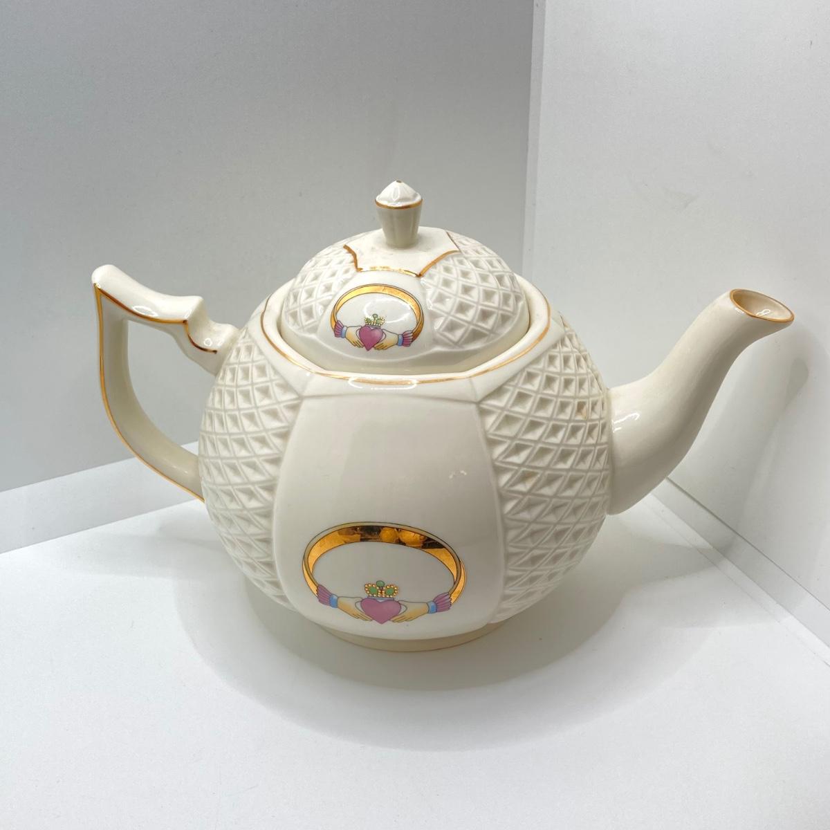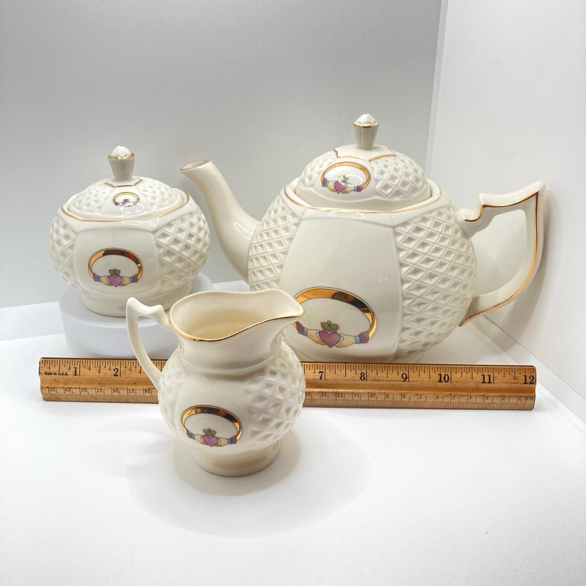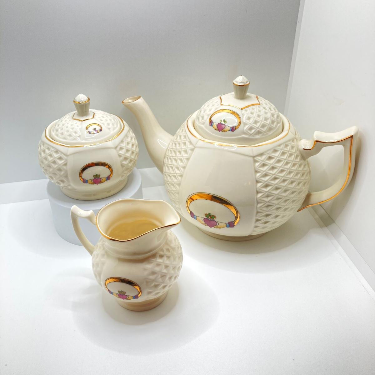 LOT 128: Donegal Ireland Parian China (Millennium 2000 Ad) Claddagh Teapot with Cream and Sugar Bowls