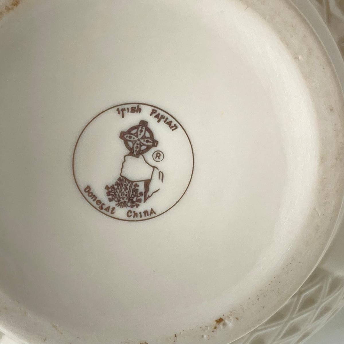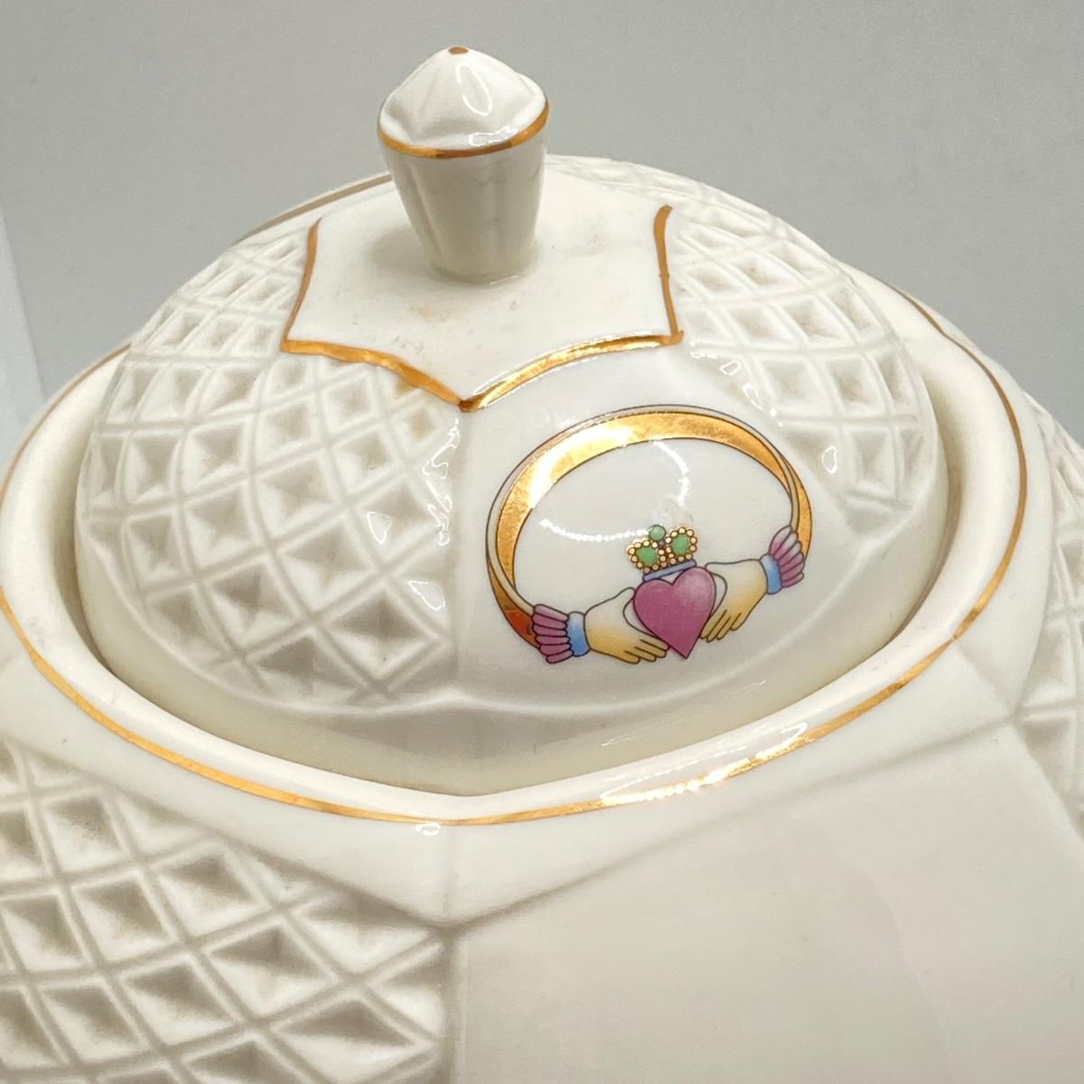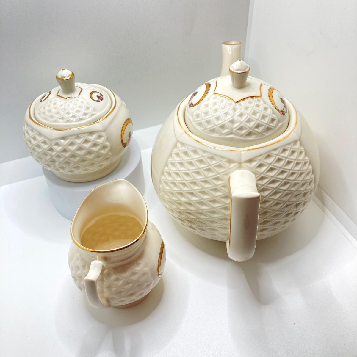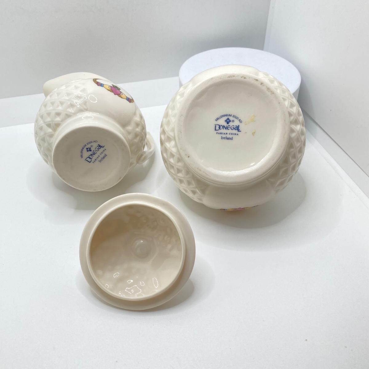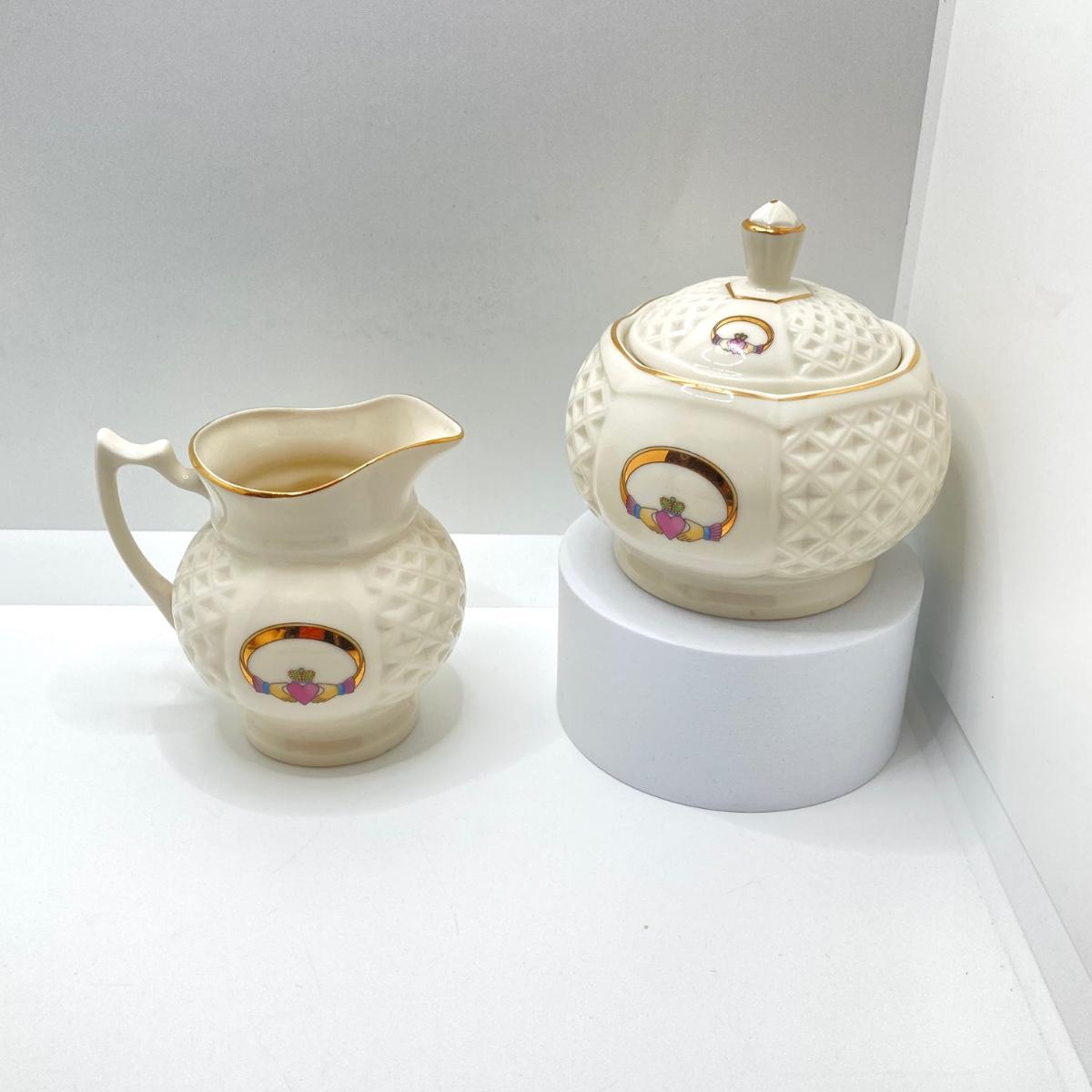 LOT 128: Donegal Ireland Parian China (Millennium 2000 Ad) Claddagh Teapot with Cream and Sugar Bowls