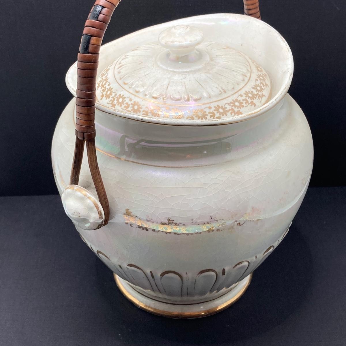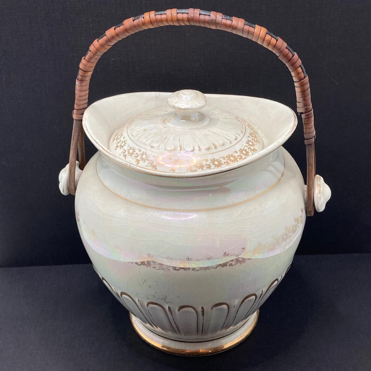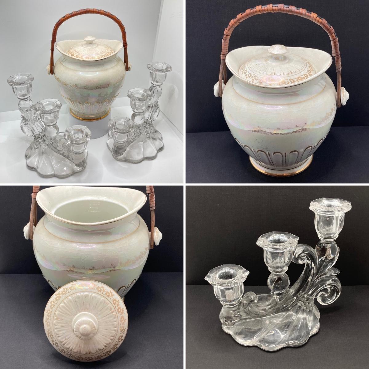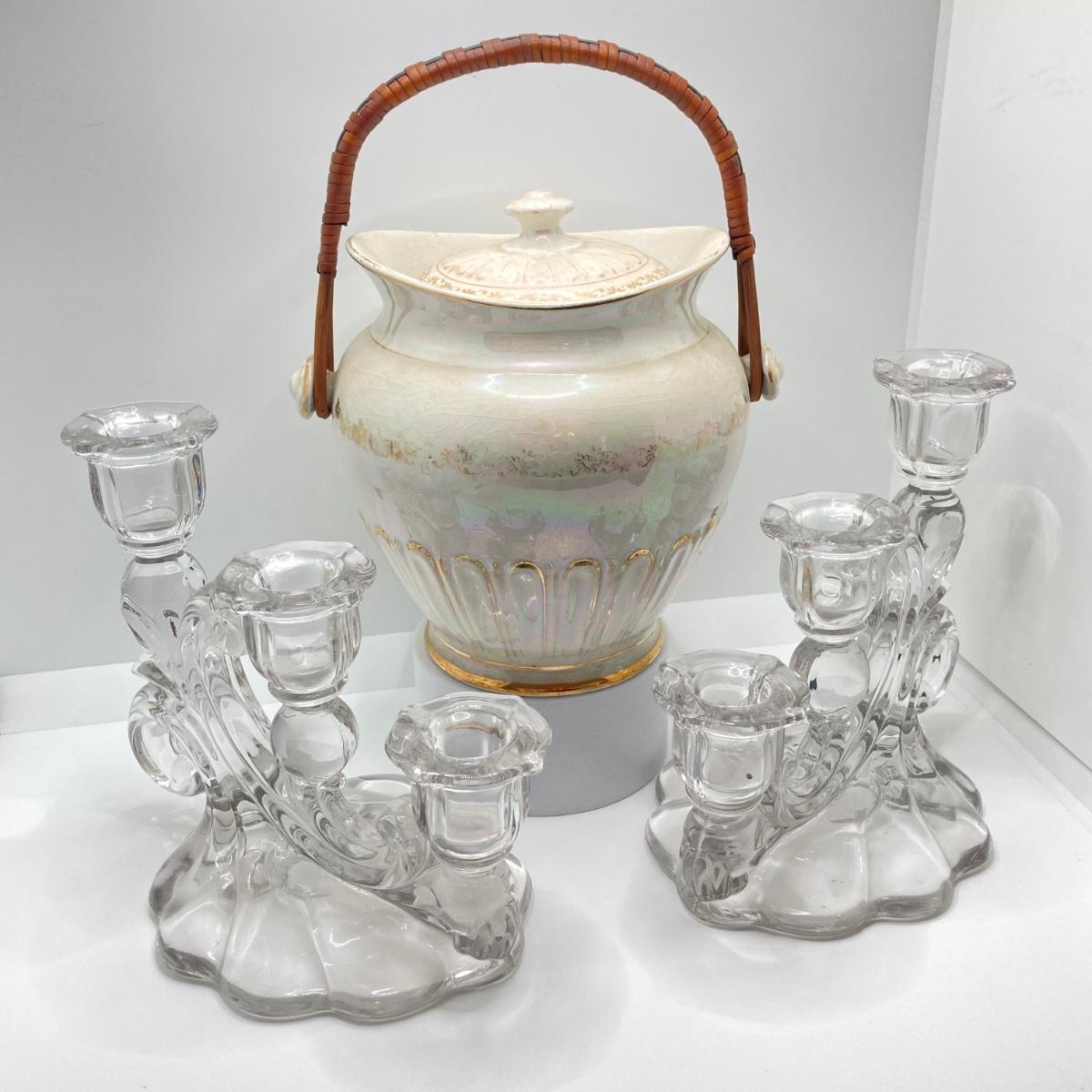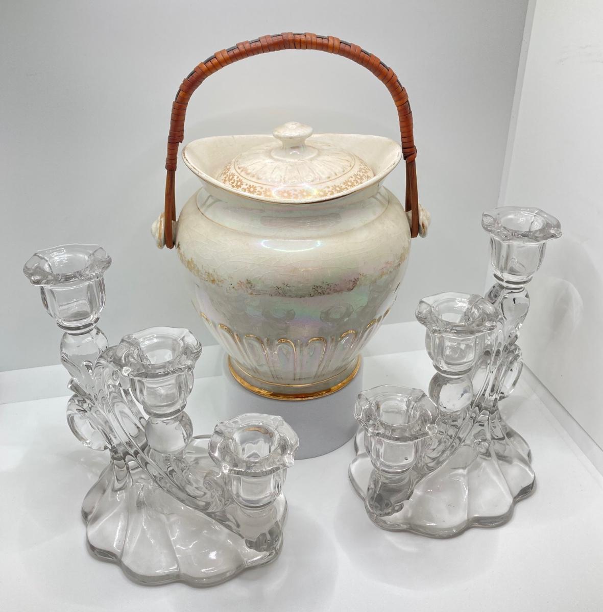 LOT 133: Beautiful Iridescent Crazed Biscuit Barrel Jar with Lid with Pair of Glass Candlestick Holders