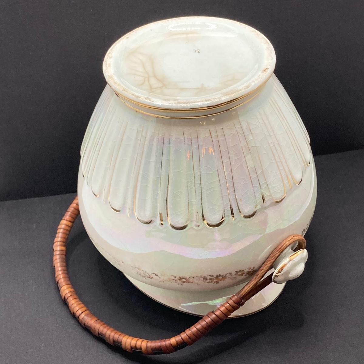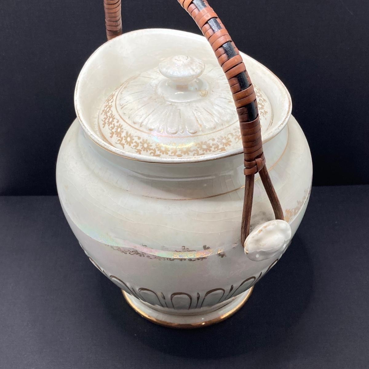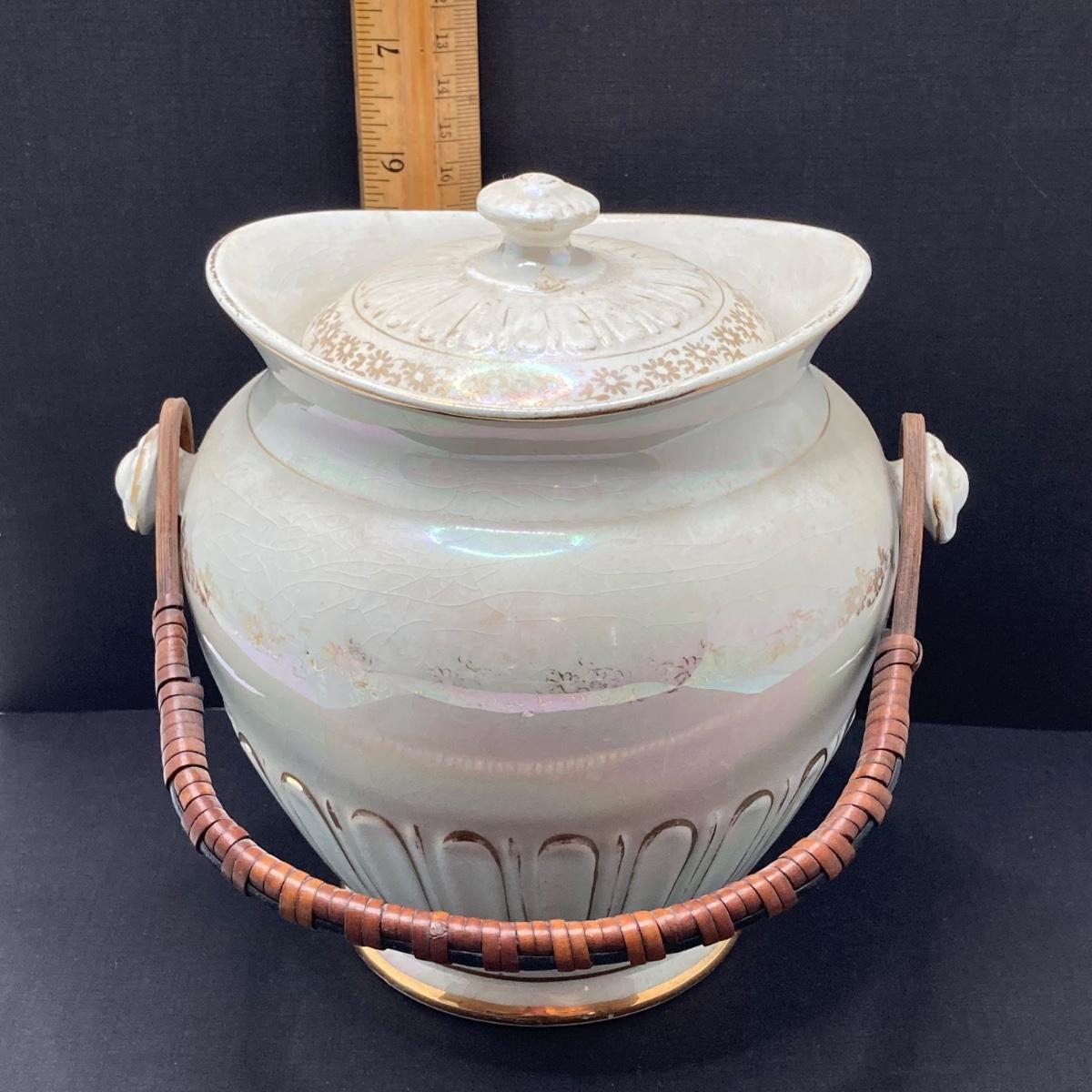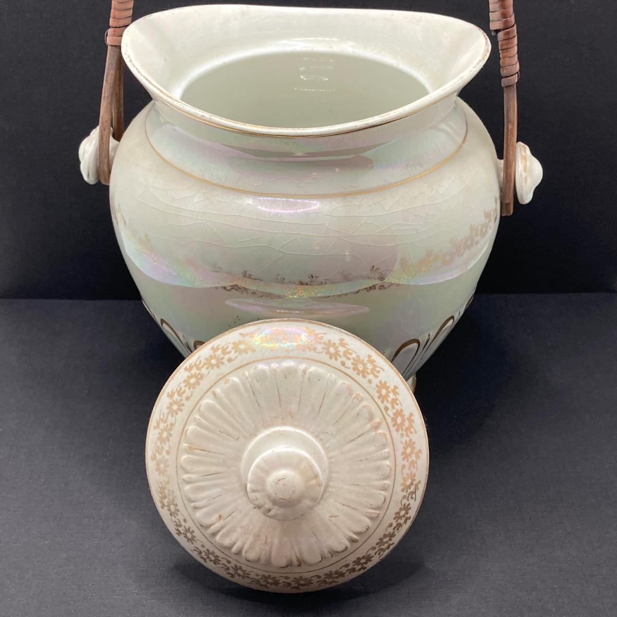 LOT 133: Beautiful Iridescent Crazed Biscuit Barrel Jar with Lid with Pair of Glass Candlestick Holders