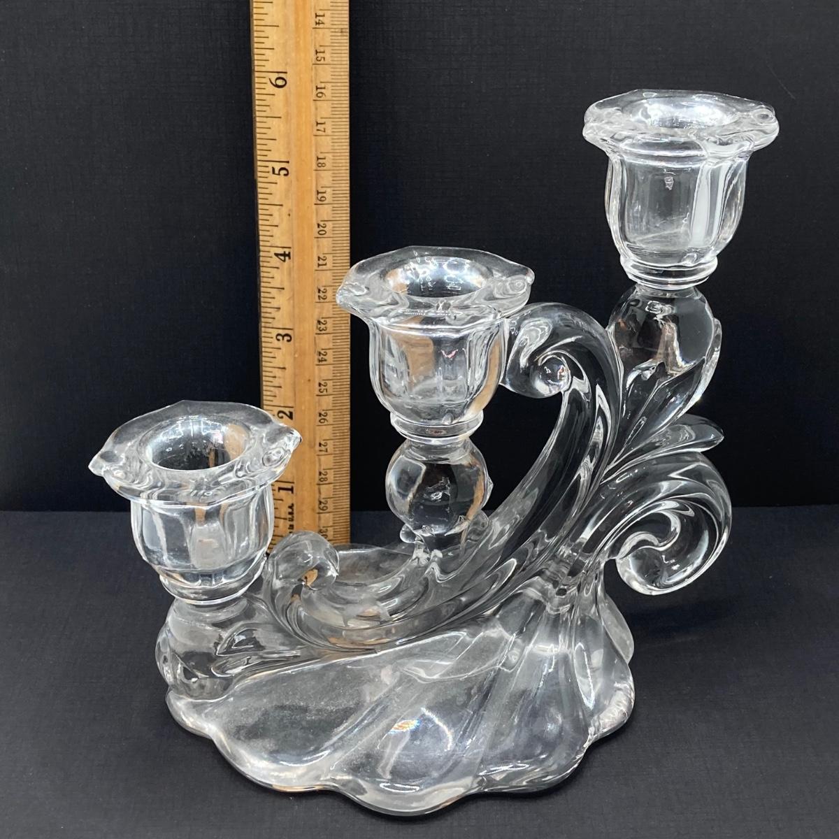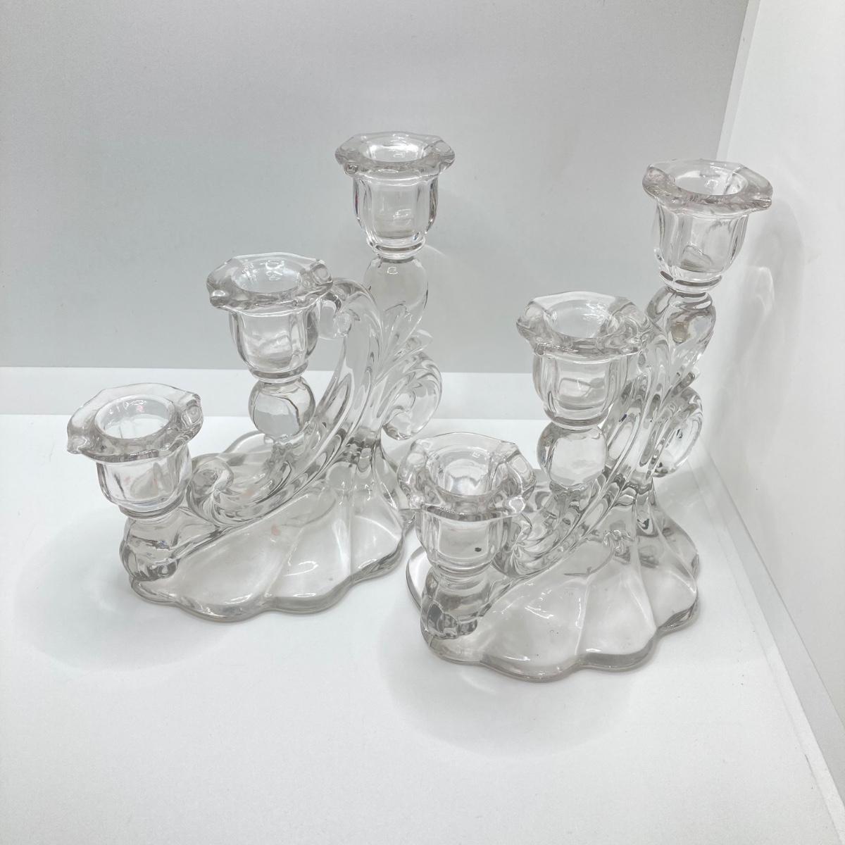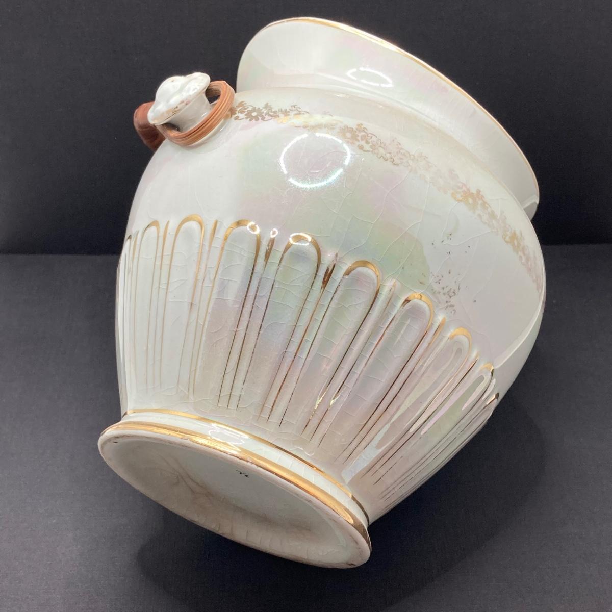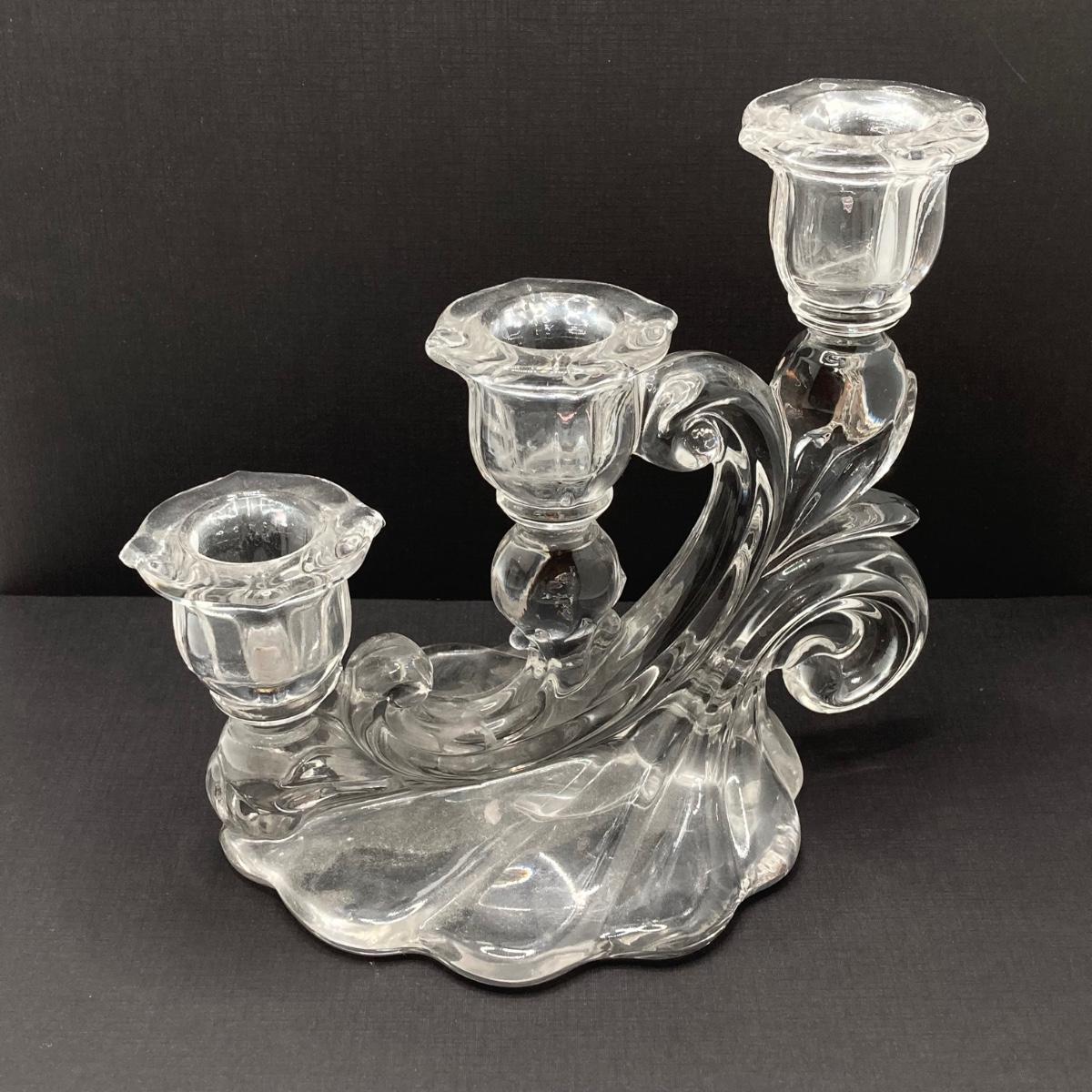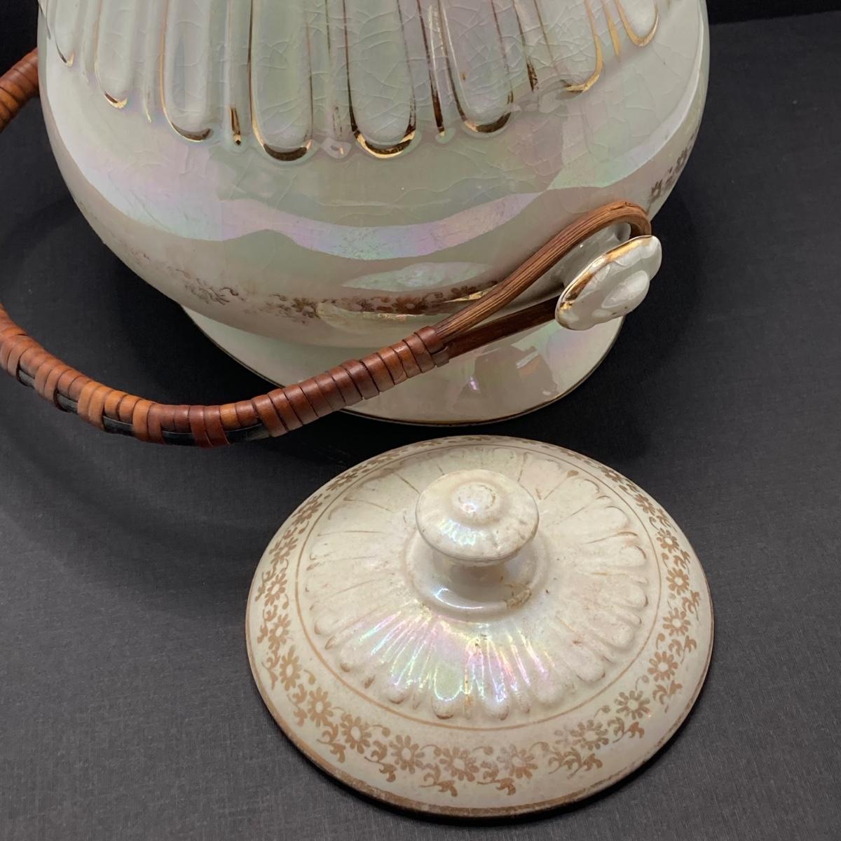 LOT 133: Beautiful Iridescent Crazed Biscuit Barrel Jar with Lid with Pair of Glass Candlestick Holders