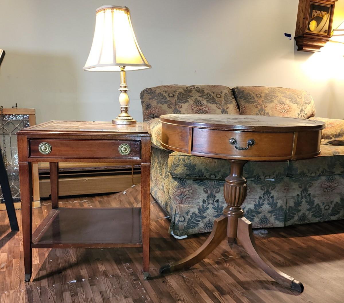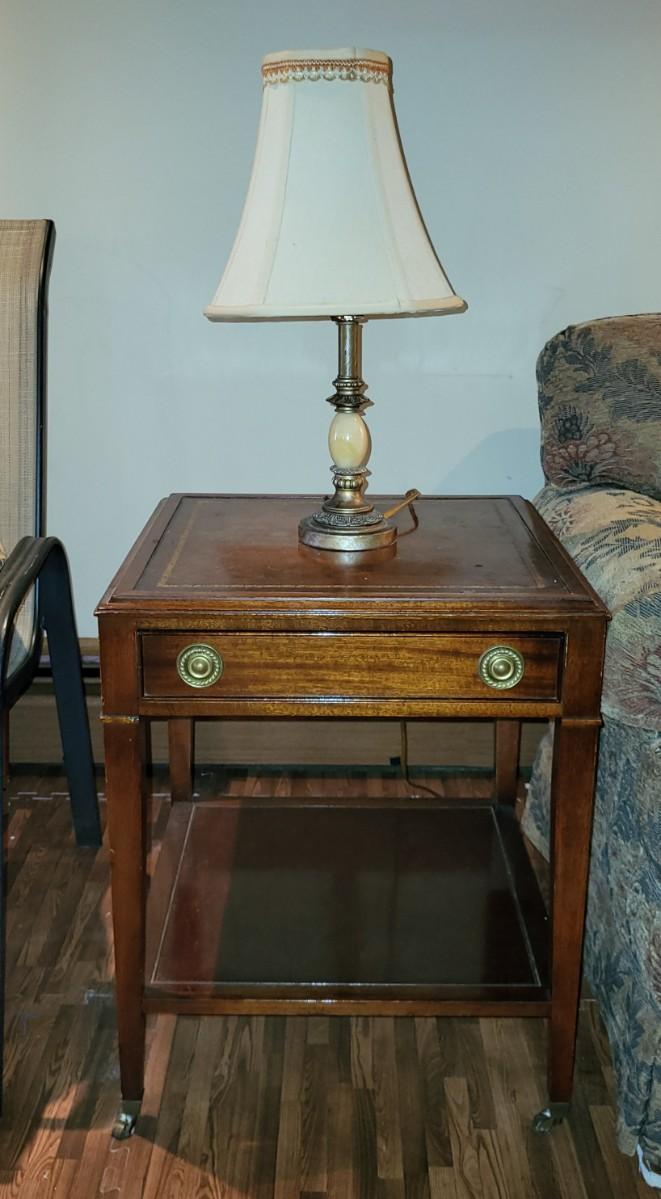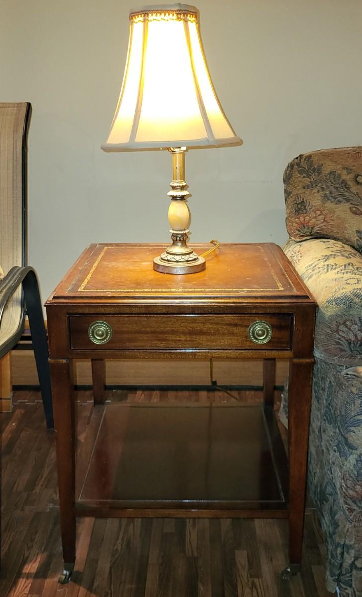LOT 151: Matching Pair of Square and Drum Style End Tables with Table Lamp