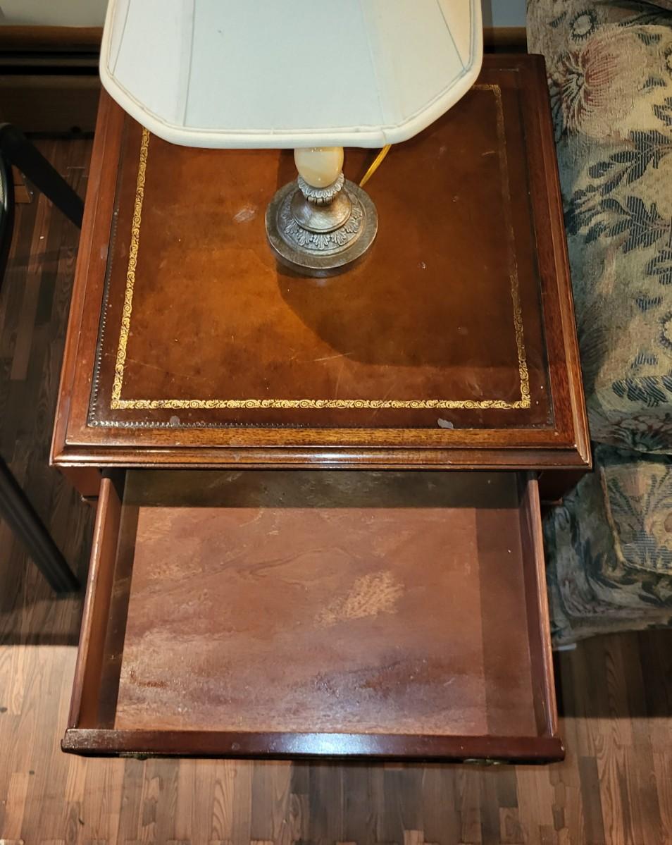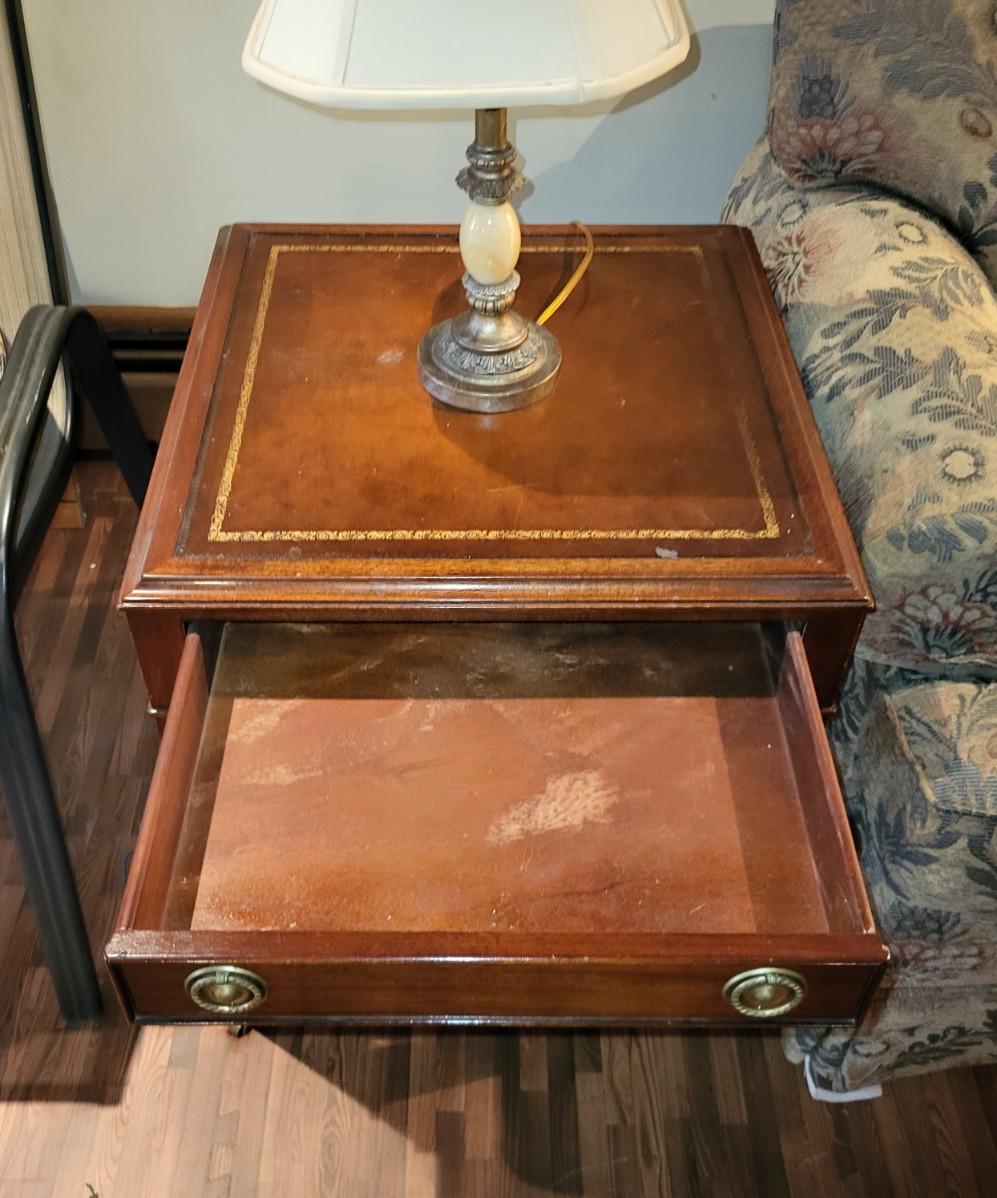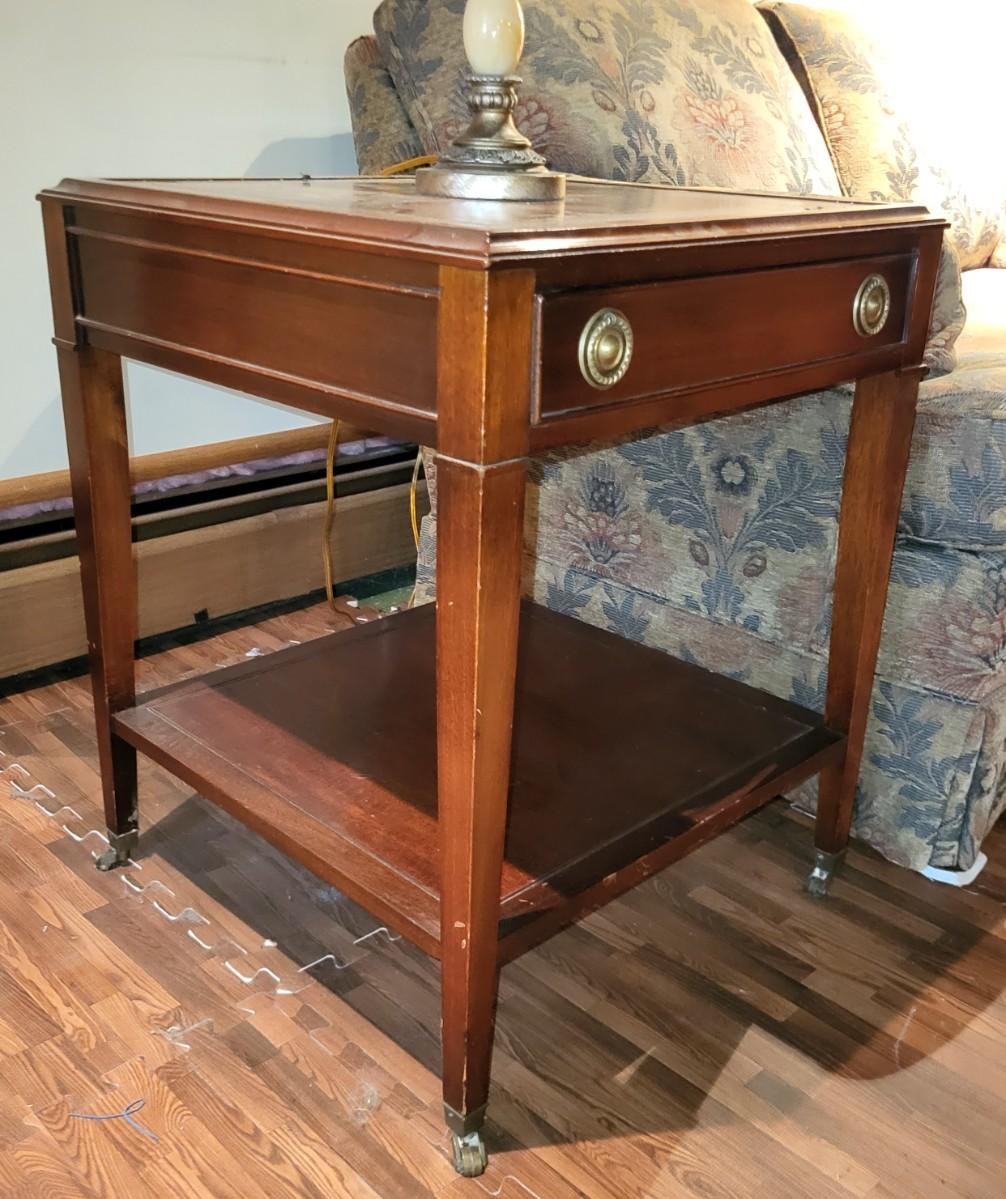 LOT 151: Matching Pair of Square and Drum Style End Tables with Table Lamp