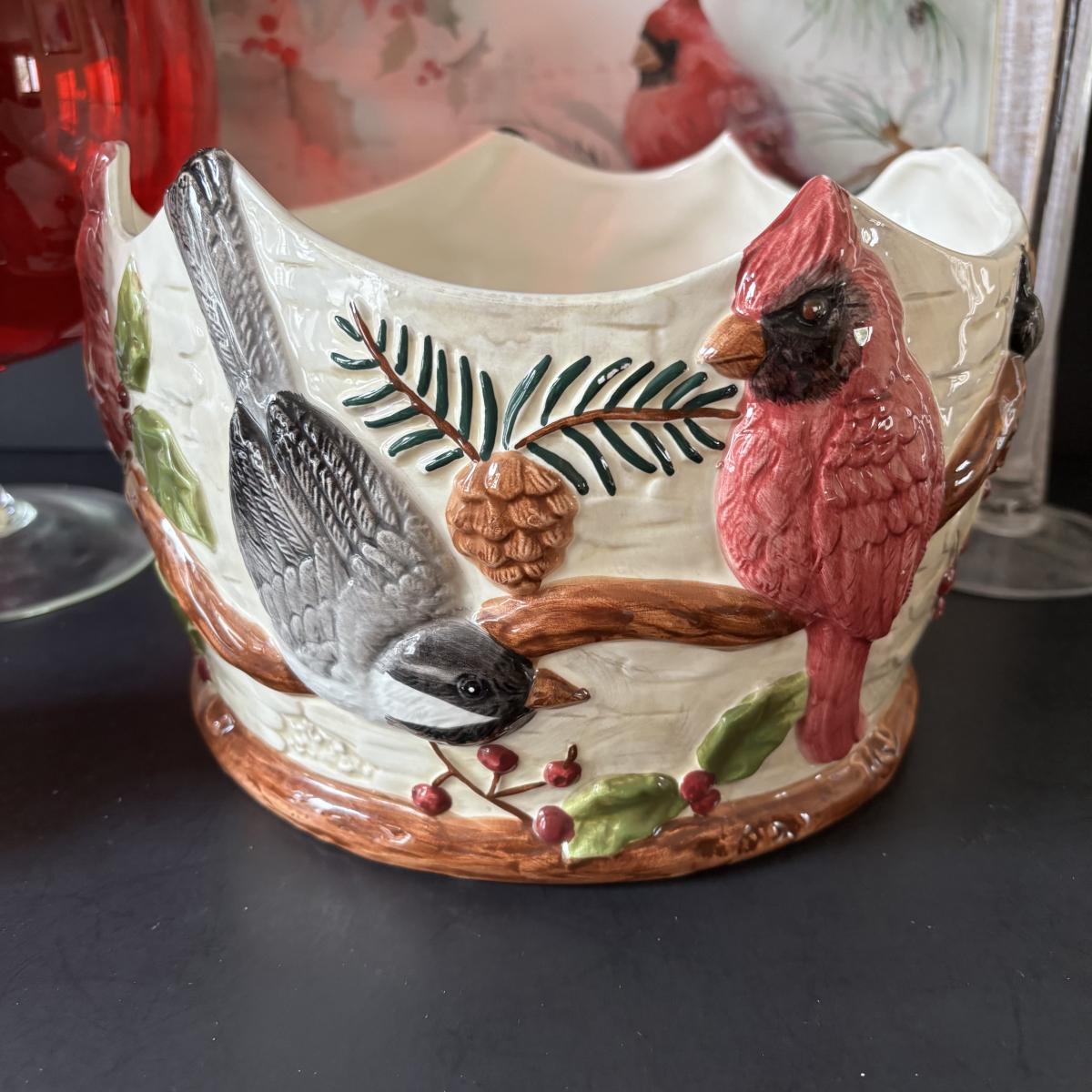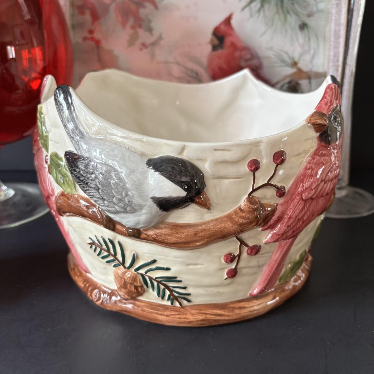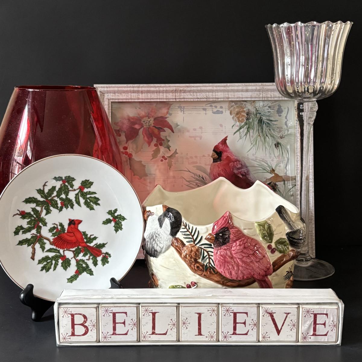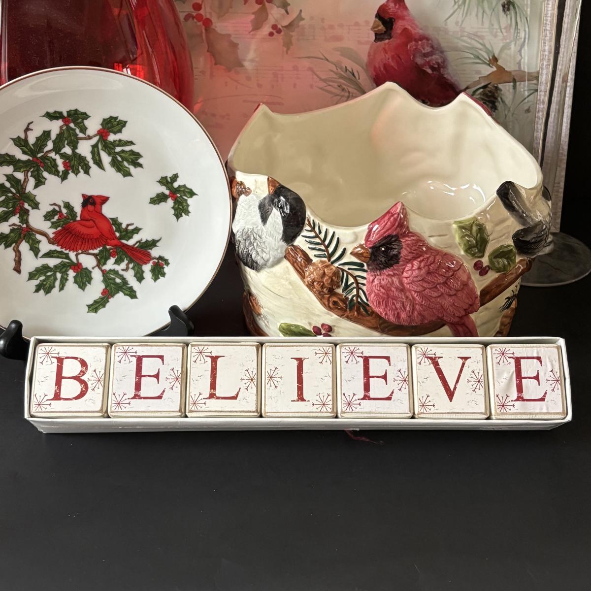 LOT 157: Believe Blocks, Cardinal Wall Art, Lefton Plate, St Nicholas Square 1999 Cardinal Bowl & More