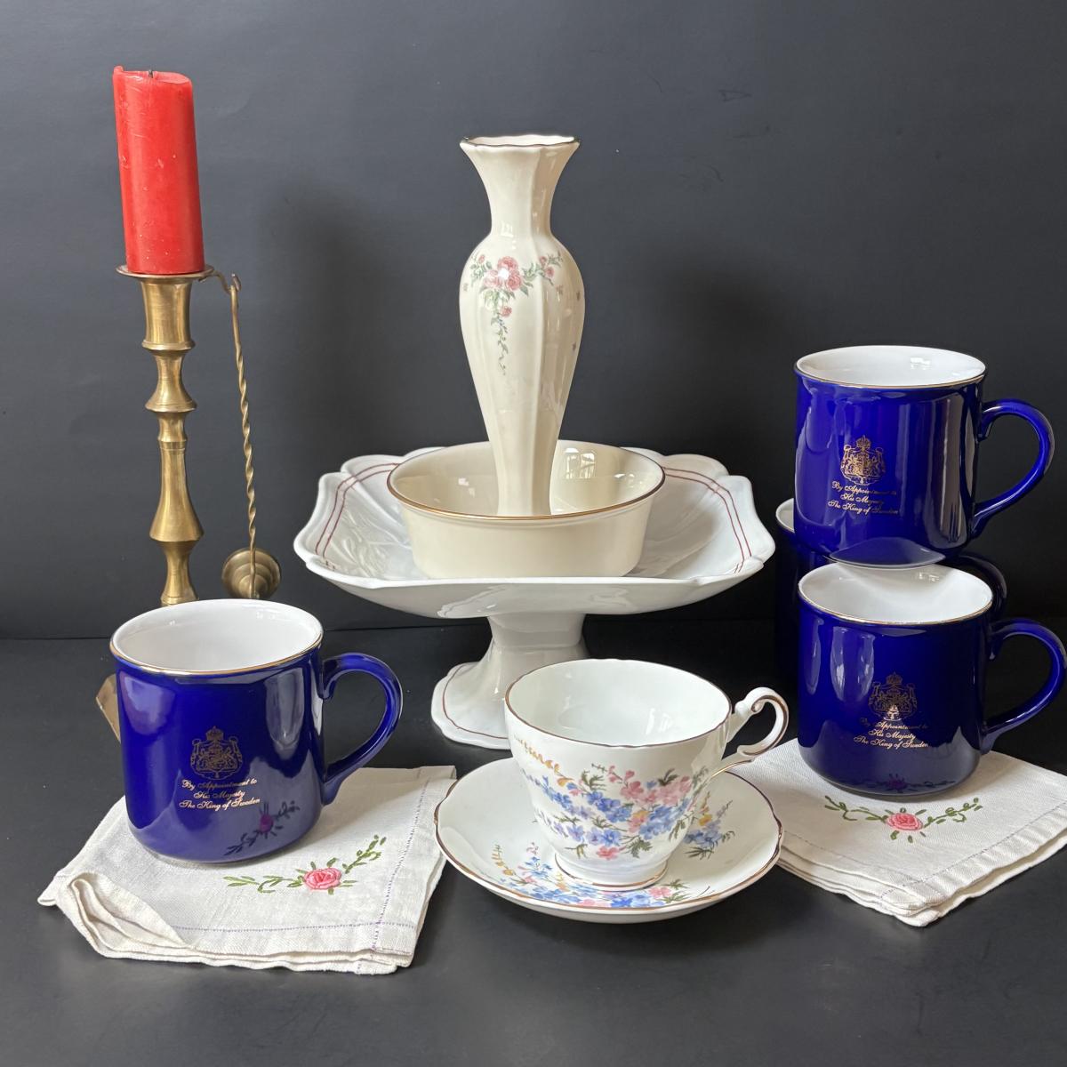 LOT 160: Lenox, Brass Pillar Candle Holder w/Snuffer, Gevalia Kaffe Mugs, Regency Floral Teacup & More