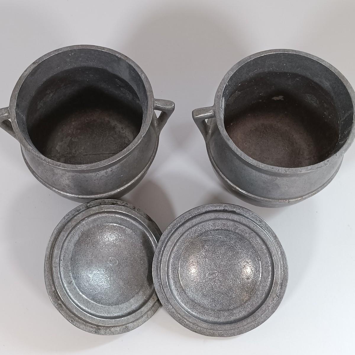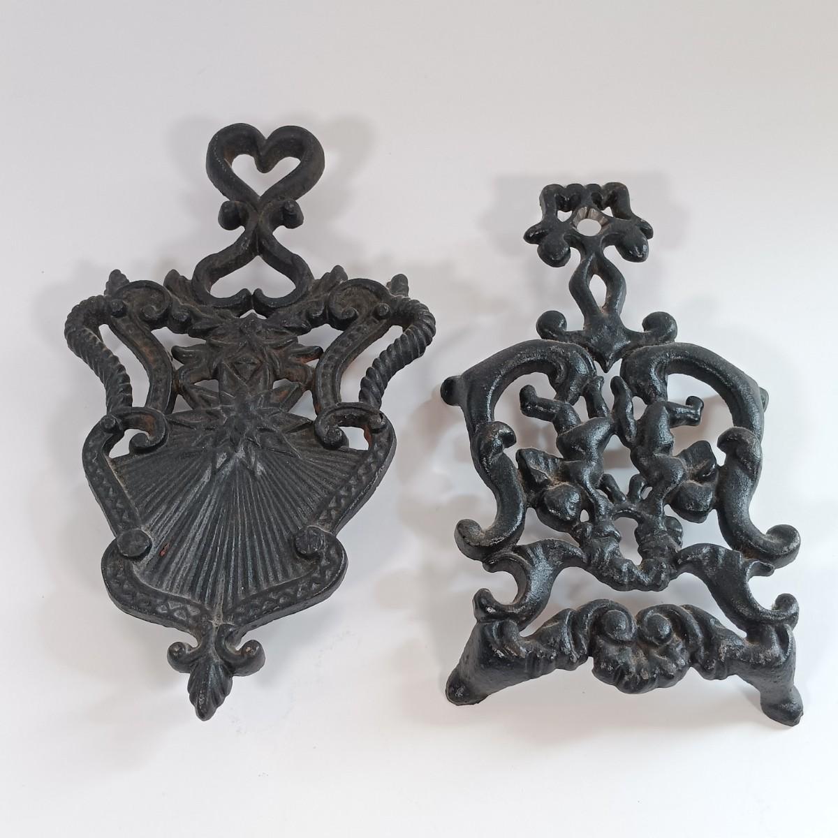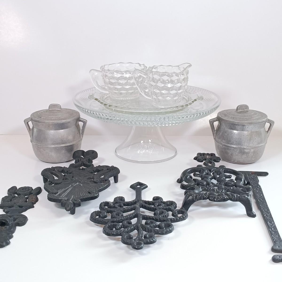 LOT 185: Cast Iron Trivets, Pewter Bean Pots, Pressed Glass Cakestand & More