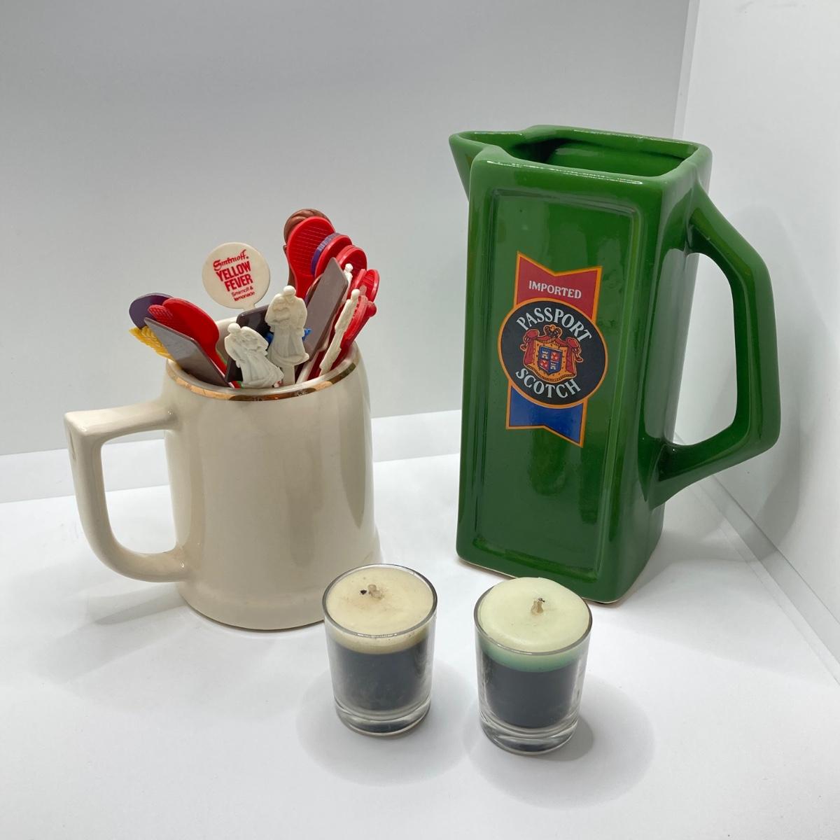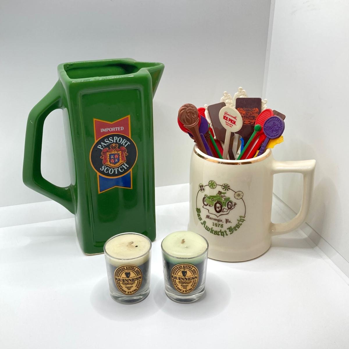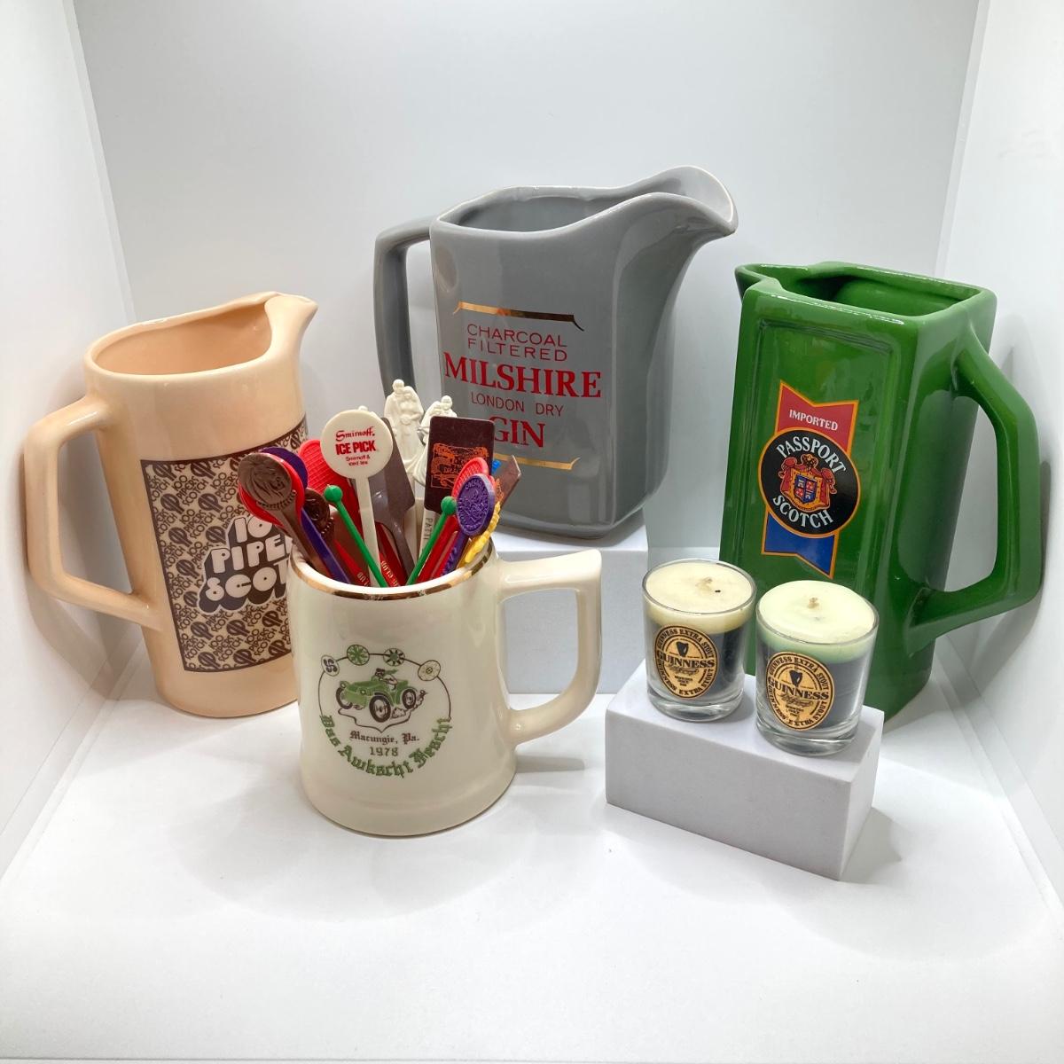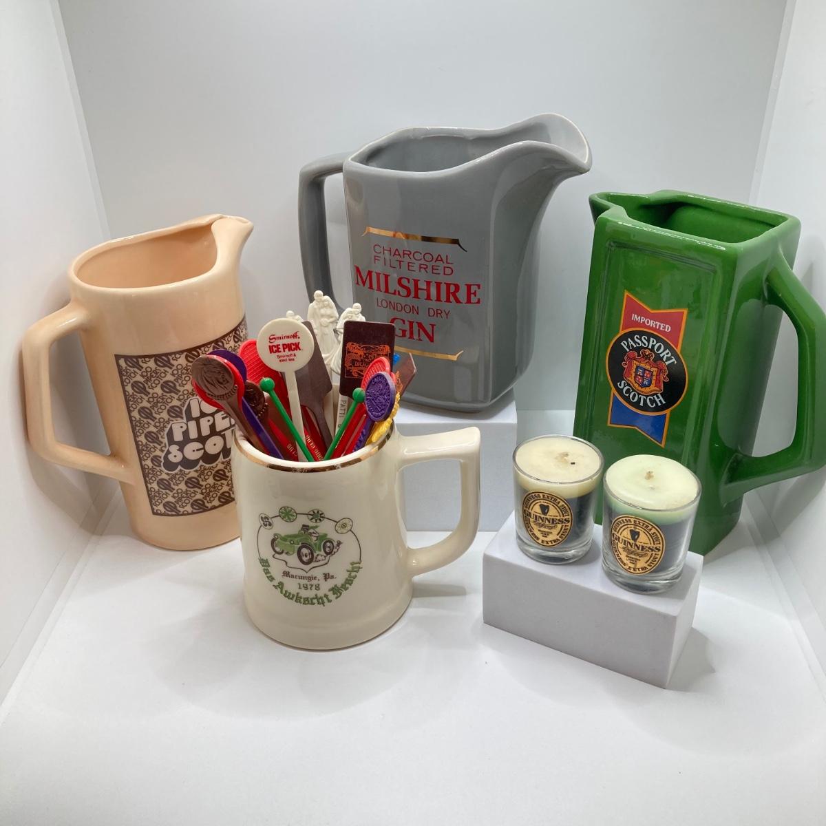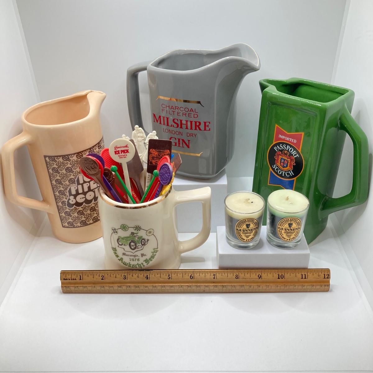 LOT 199: Collection of Vintage Beverage Pitchers, Mug, Plastic Stirrers and More