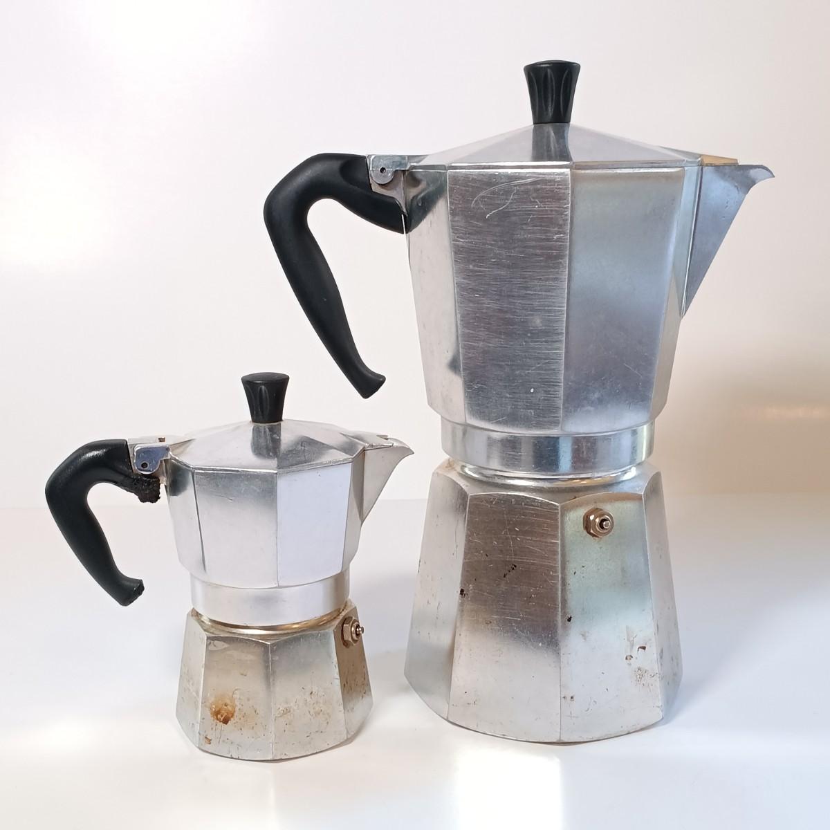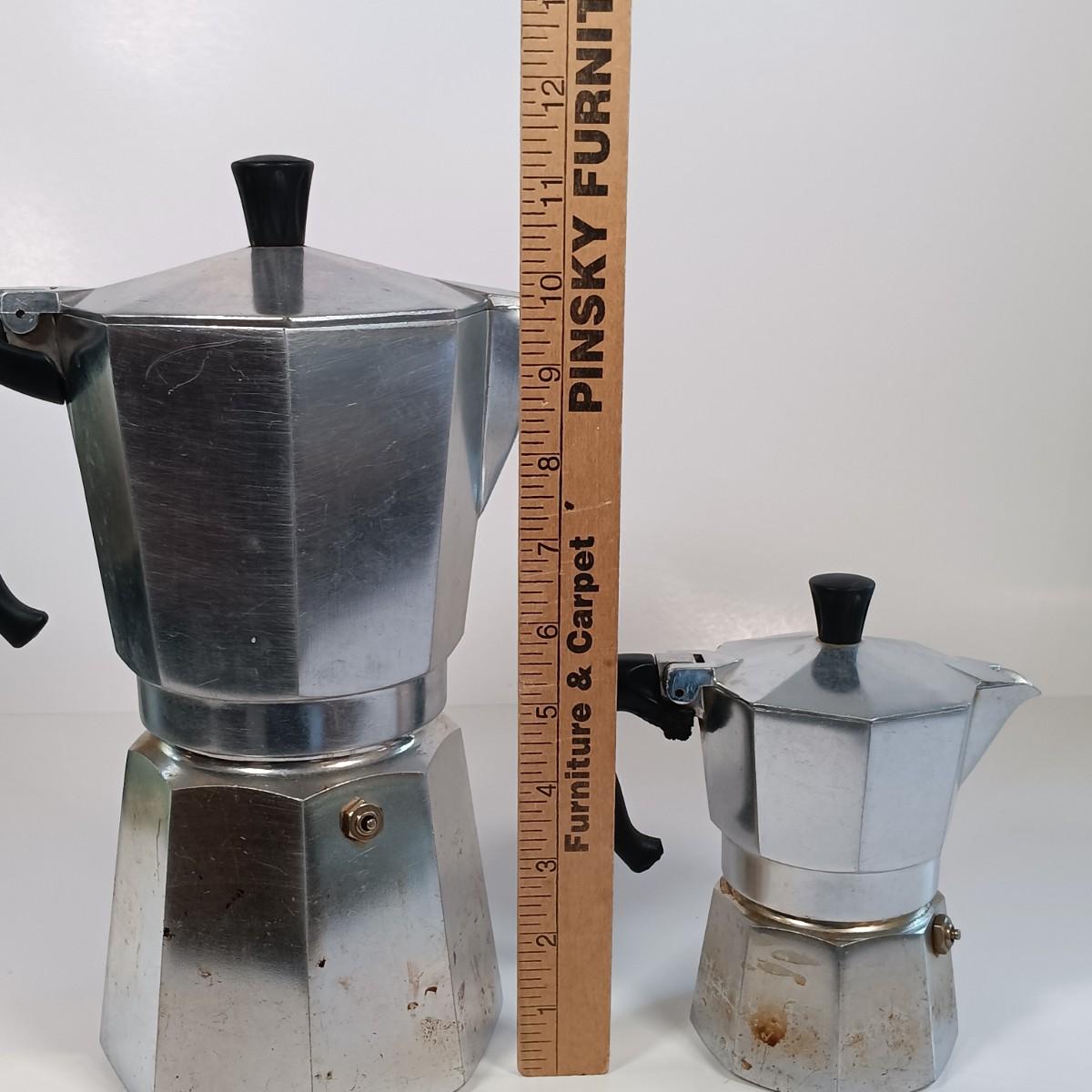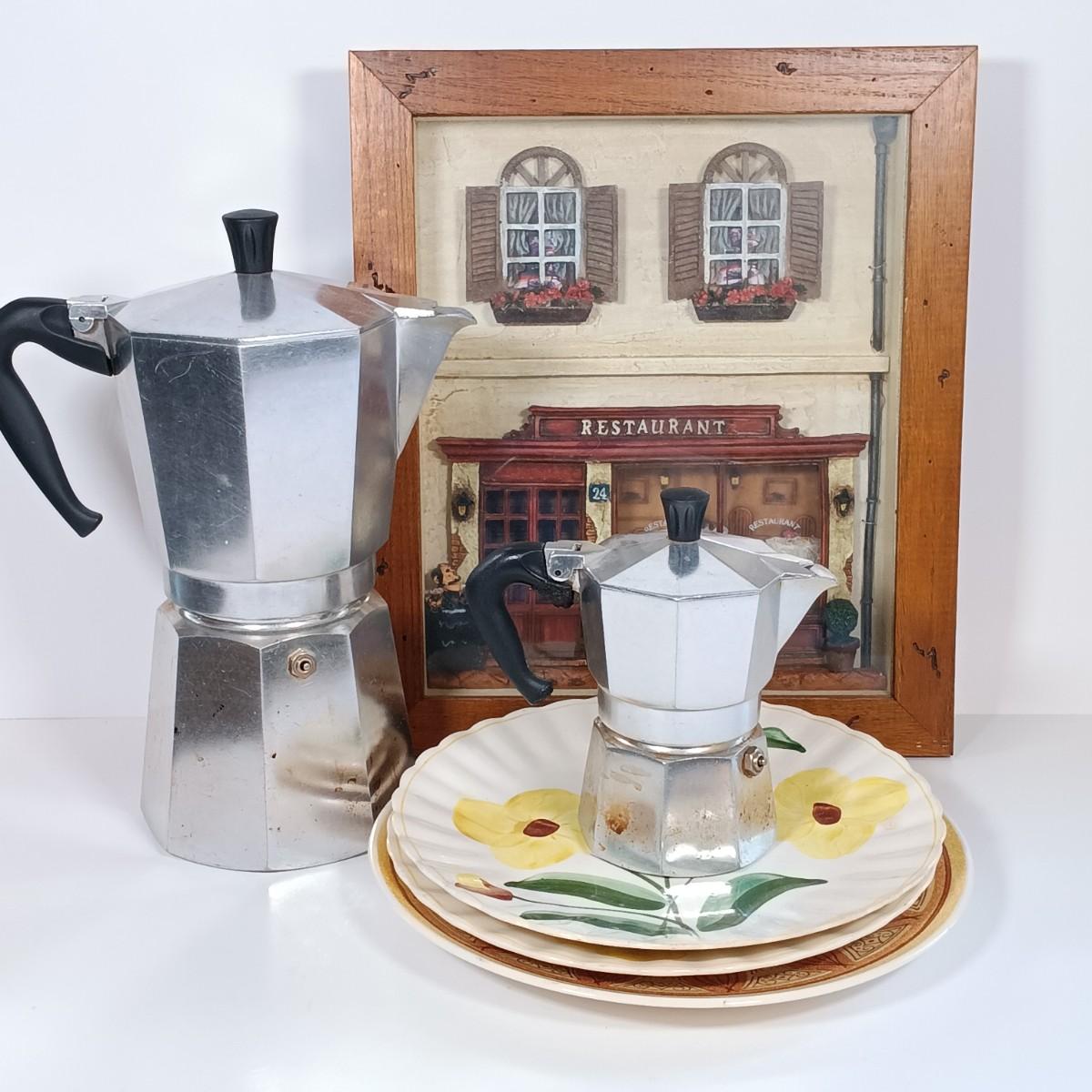 LOT 226: Pair of Bialetti Moka Express Stovetop Coffee Makers with Shadow Box Art & Plates