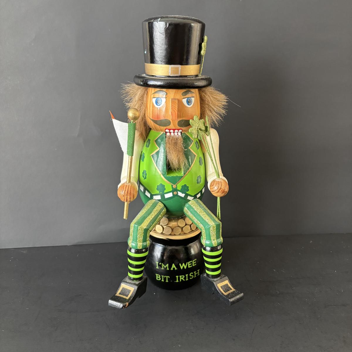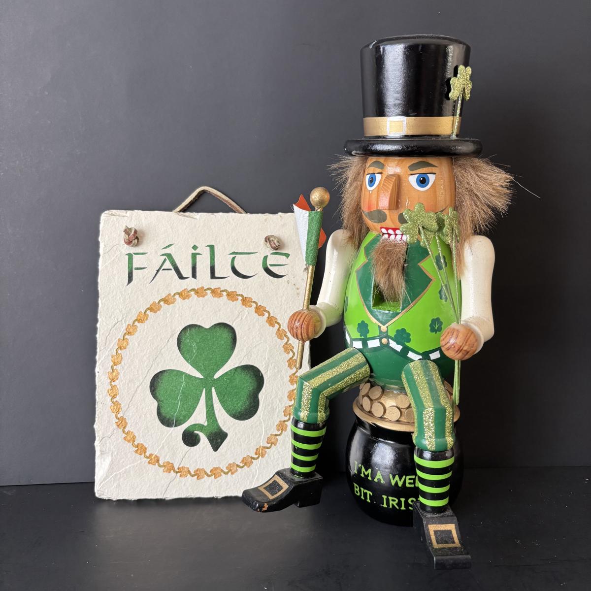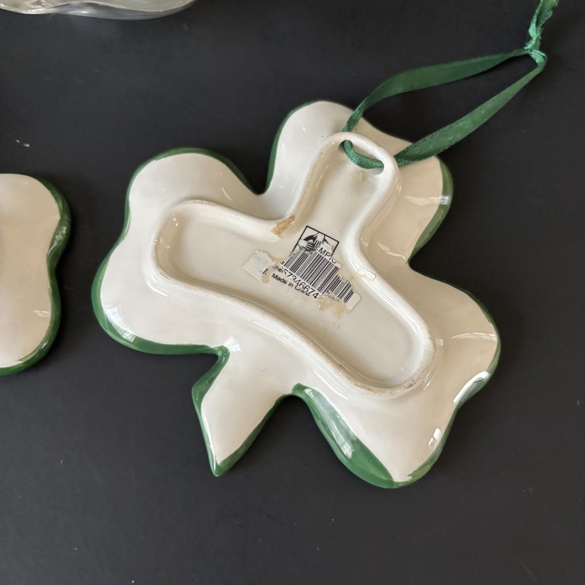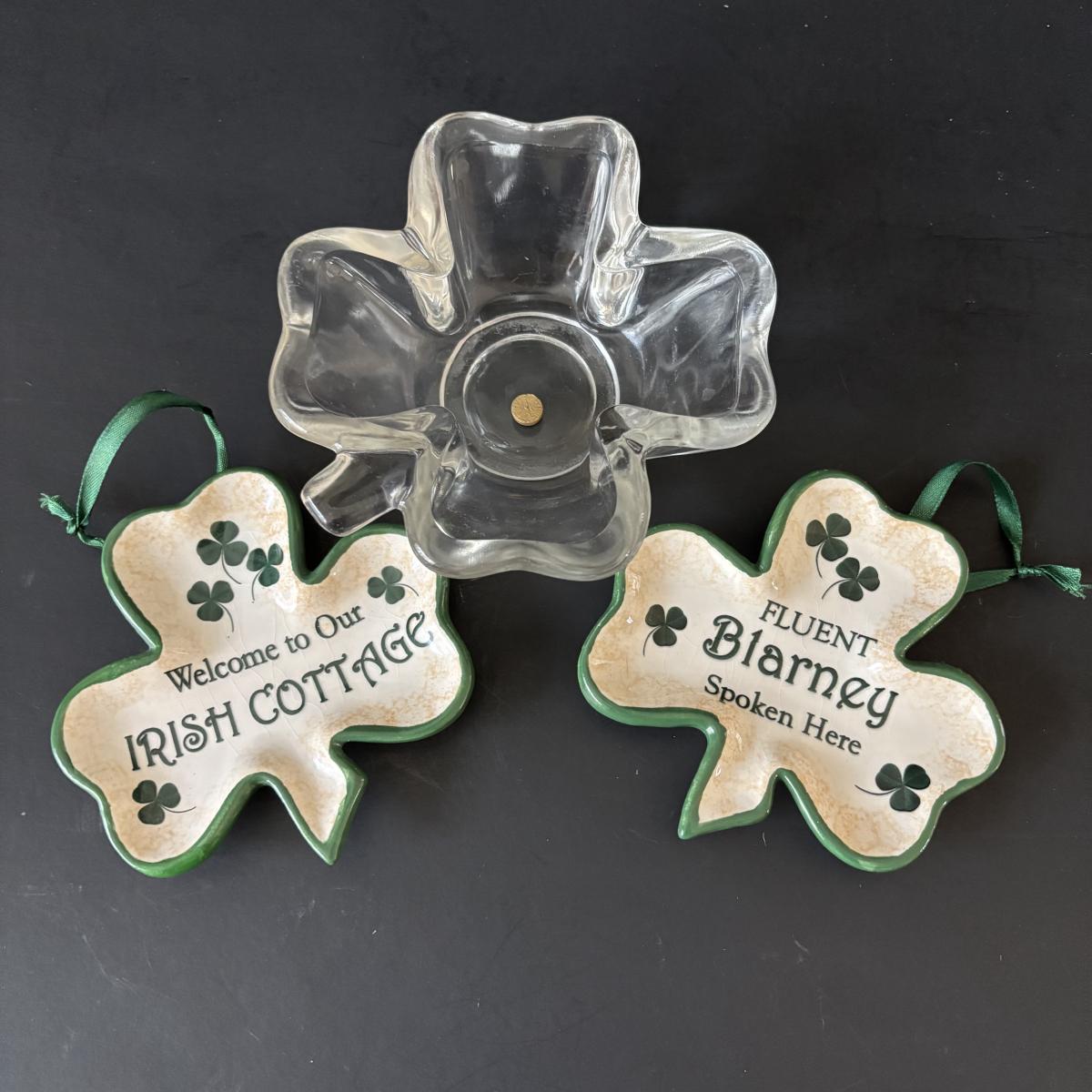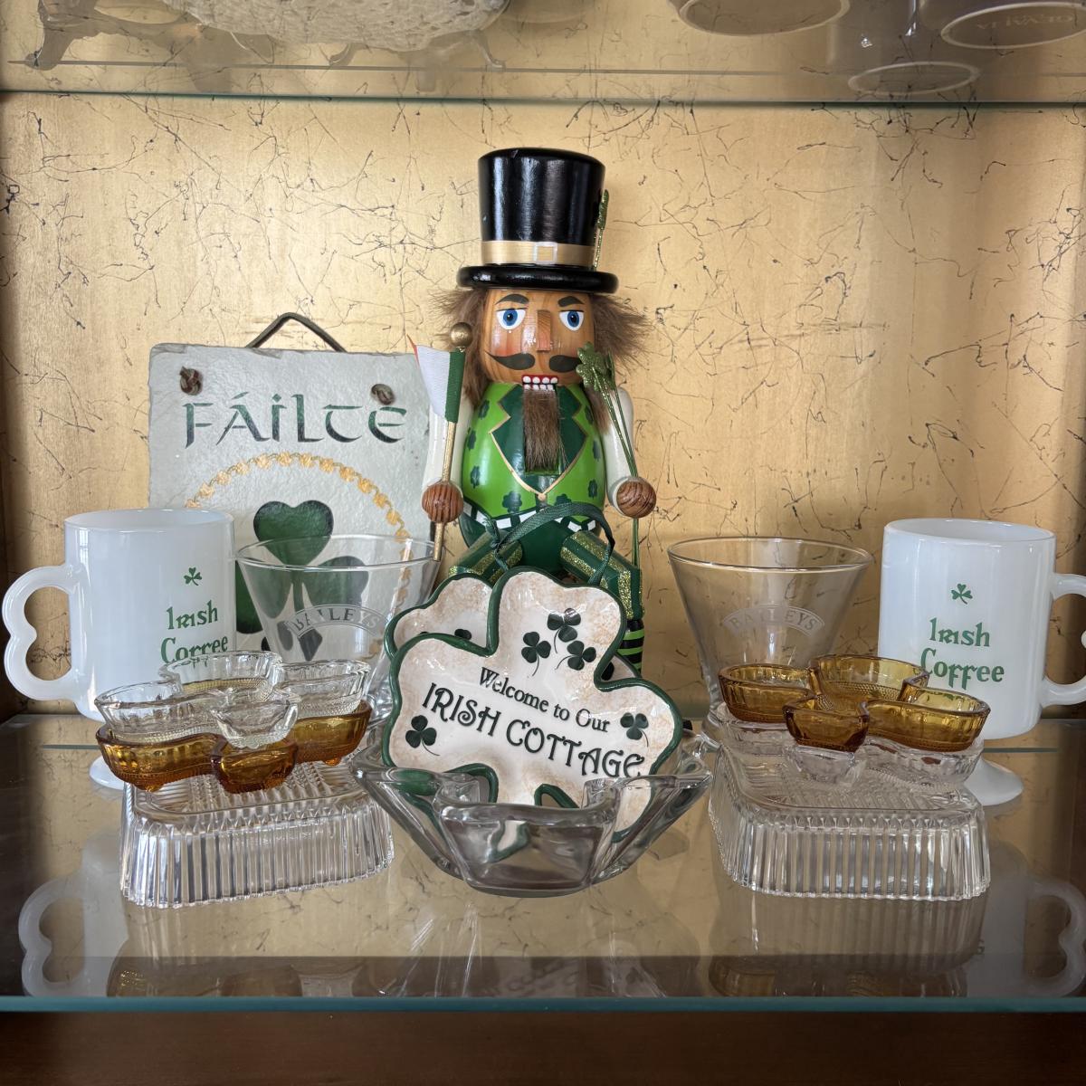 LOT 86: It's Good to Be Irish Collection: Nutcracker, Milk Glass Mugs, Clear & Amber Shamrock Trinket Dishes & More