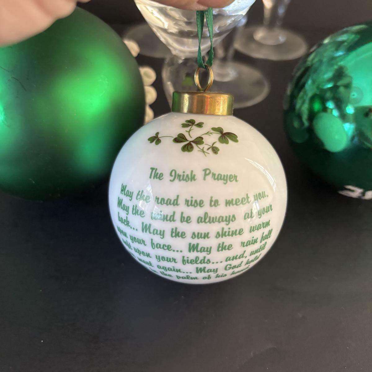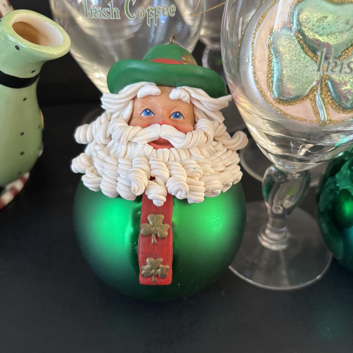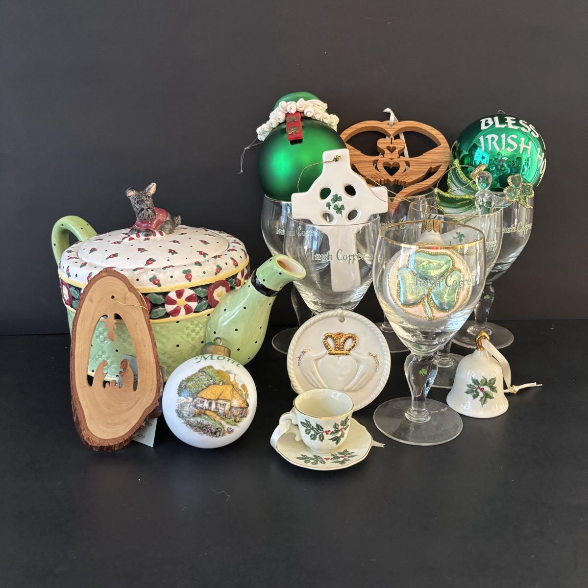 LOT 247: Collection of Irish Holiday Ornaments, Irish Coffee Stemware, Mary Engelbreit Scottie Dog Holiday Teapot