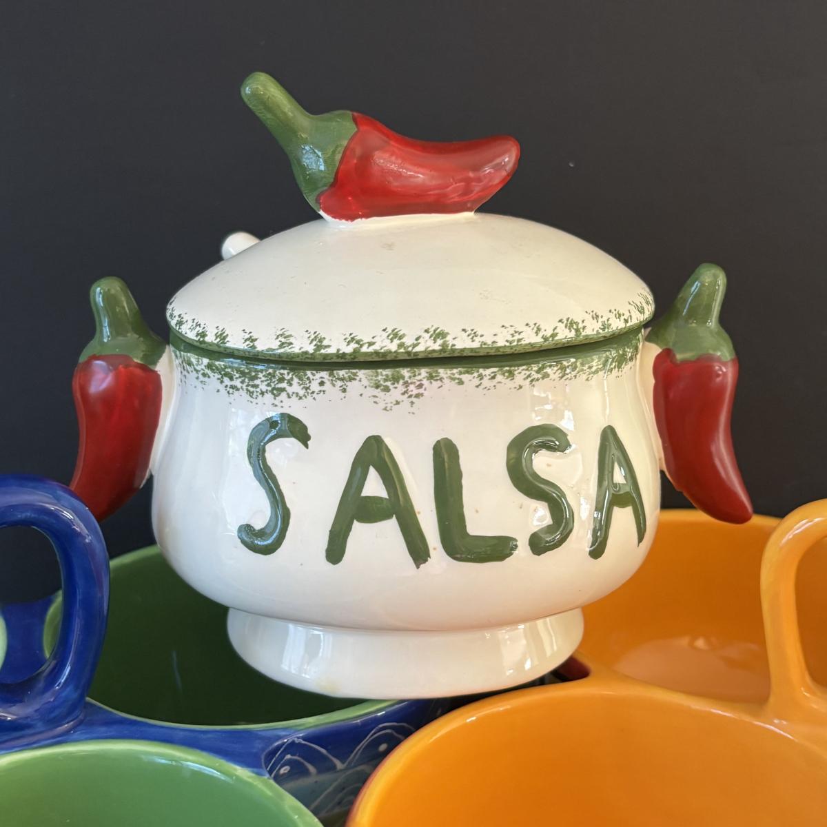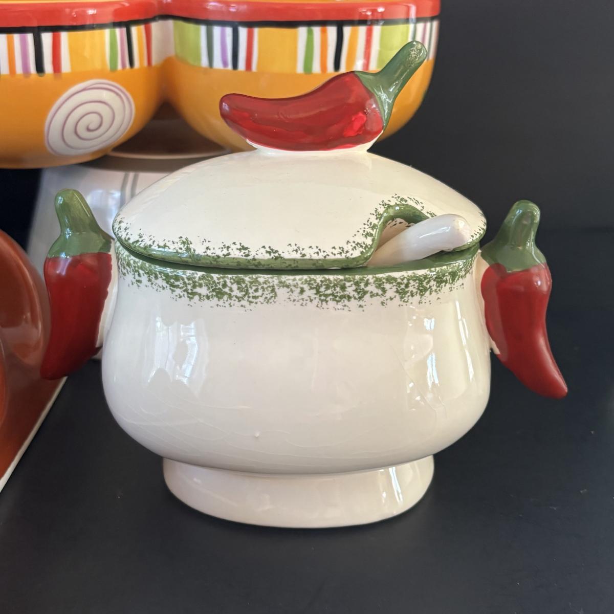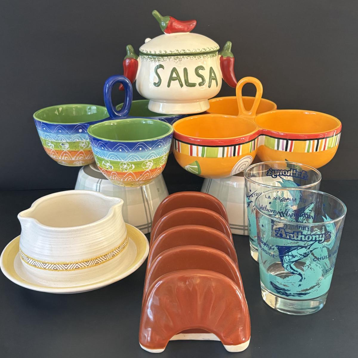 LOT 249: Anthony's Harborside Fish Grotto Seafood Restaurant Drinking/Bar Glasses, Crate & Barrel Condiment Holder, Certified International Joyce Shelton Condiment Holder, Bee & Willow Bowls & More