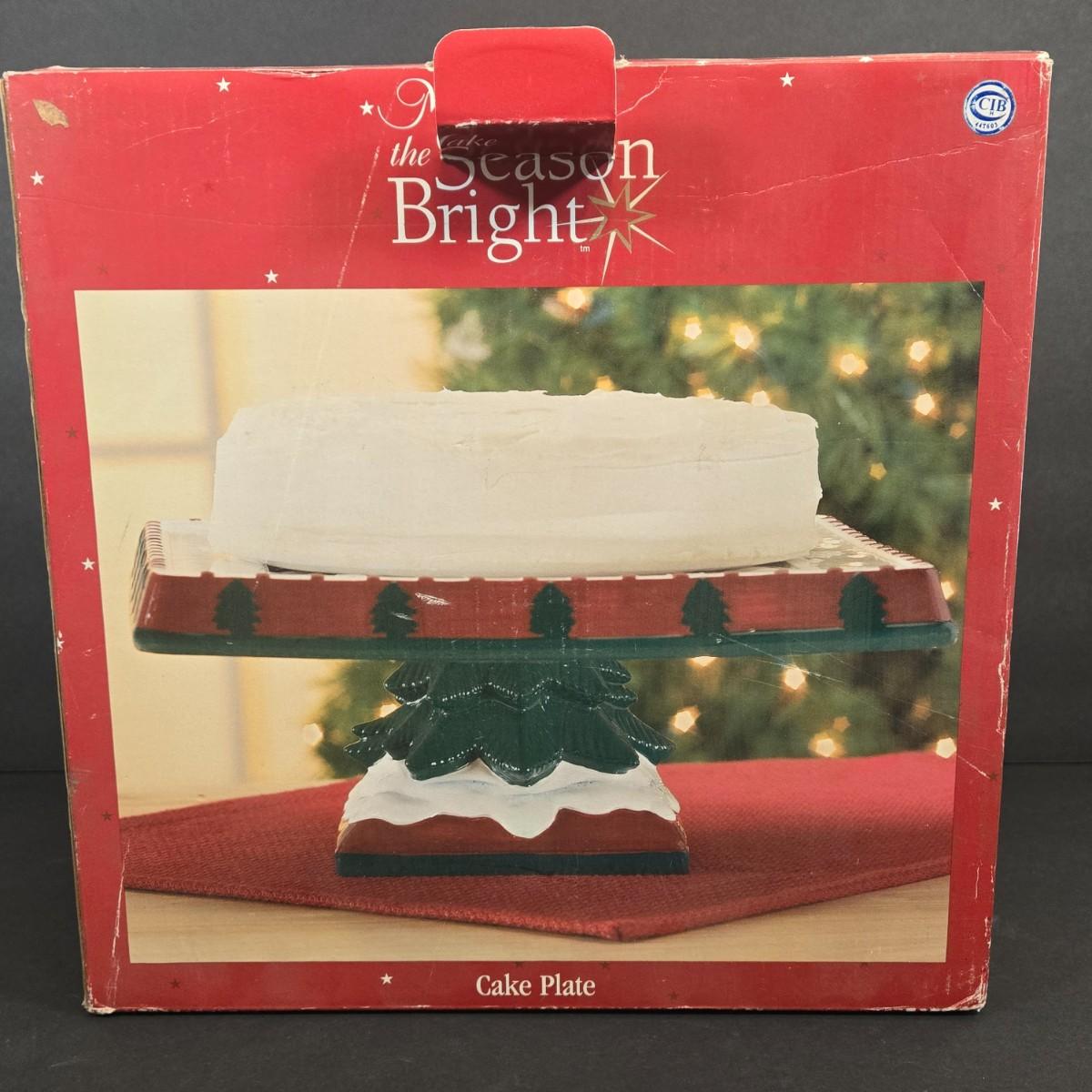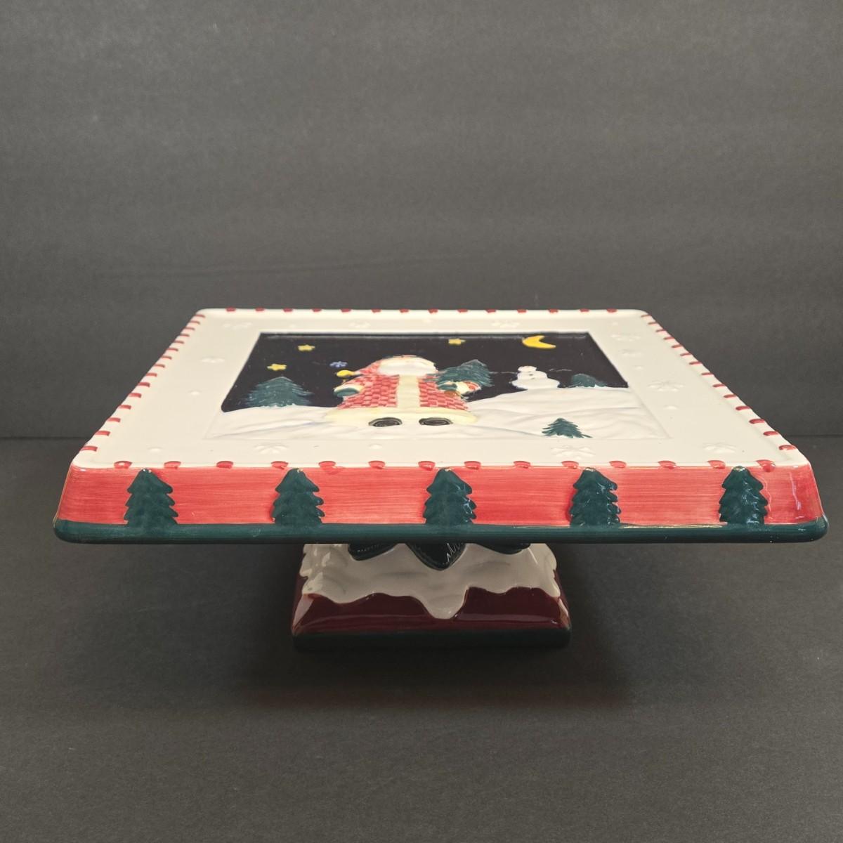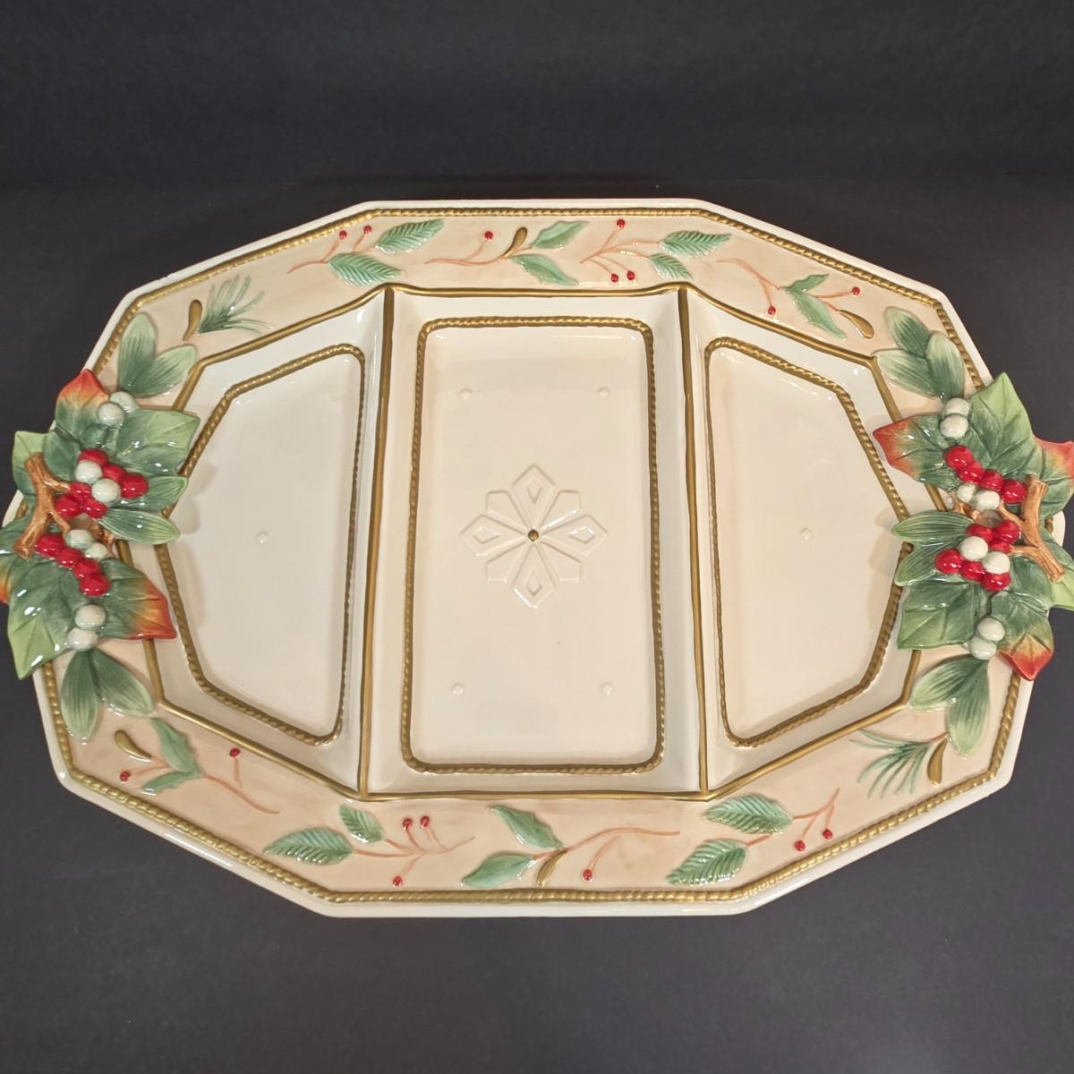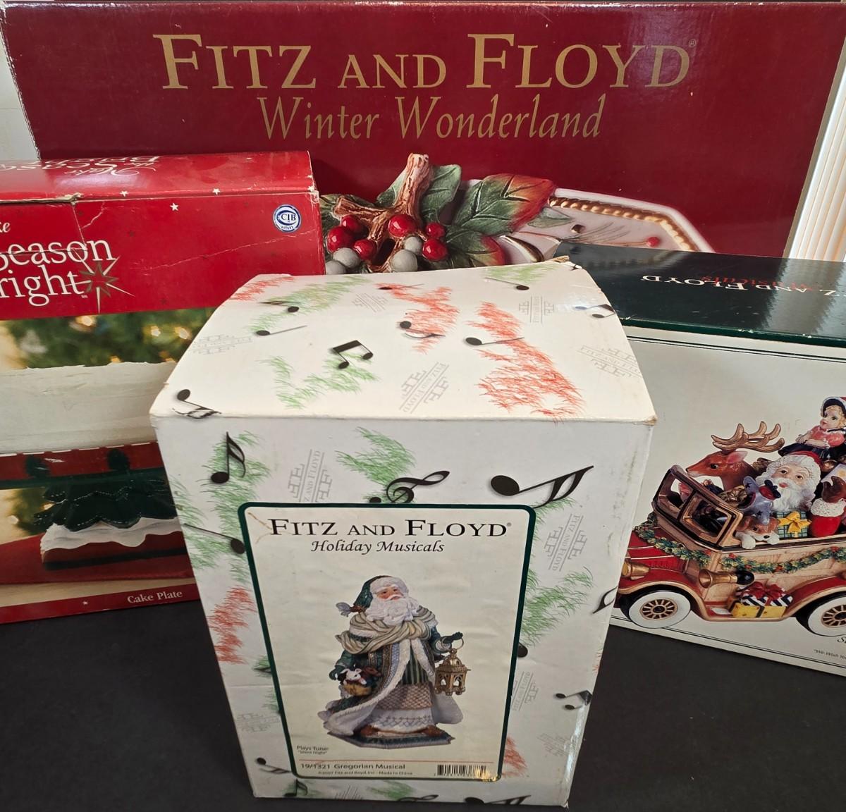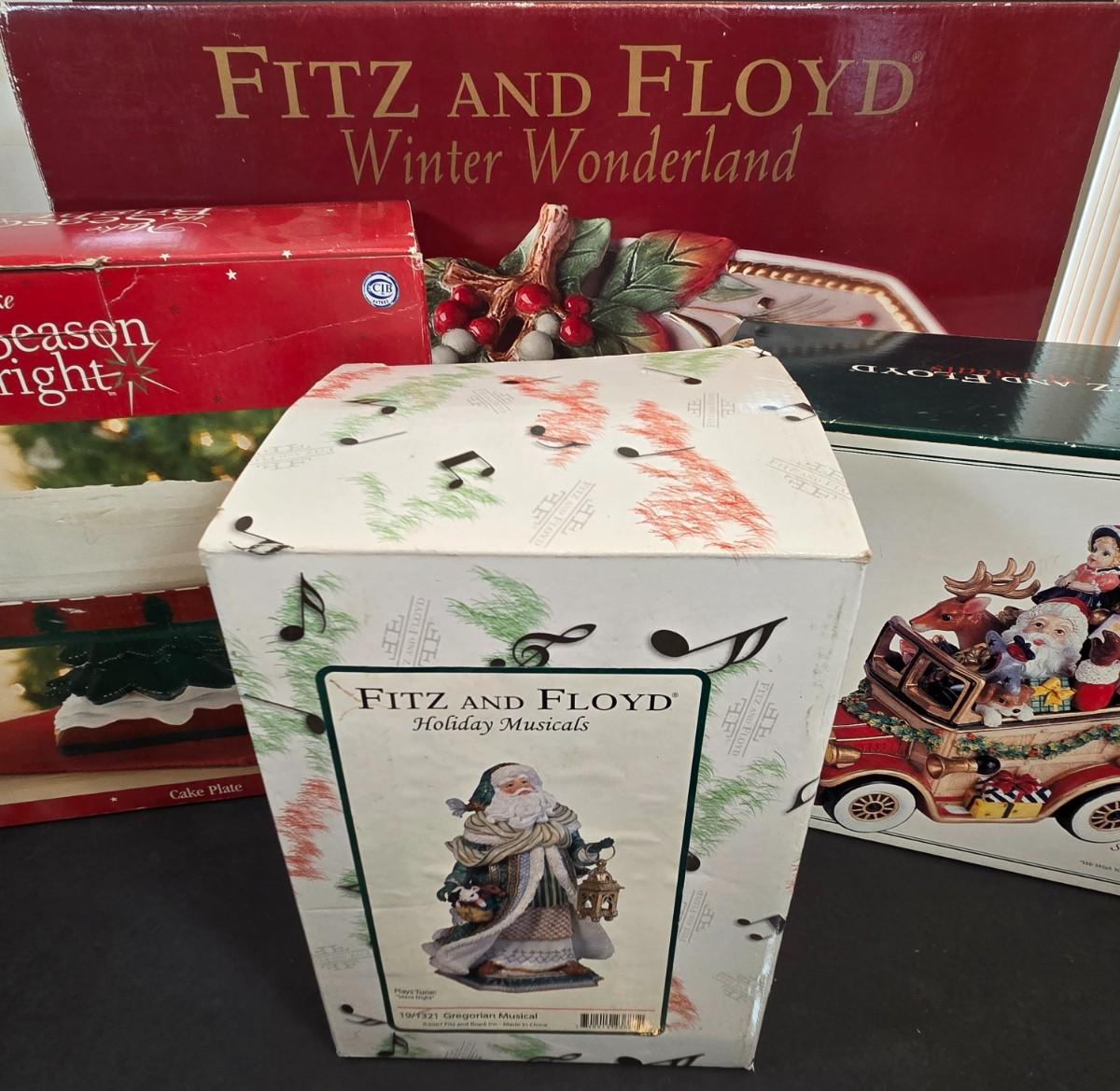 LOT 12D: Fitz and Floyd Divided Serving Platter, Make the Season Bright Cake Stand, and 2 Fitz and Floyd Musicals