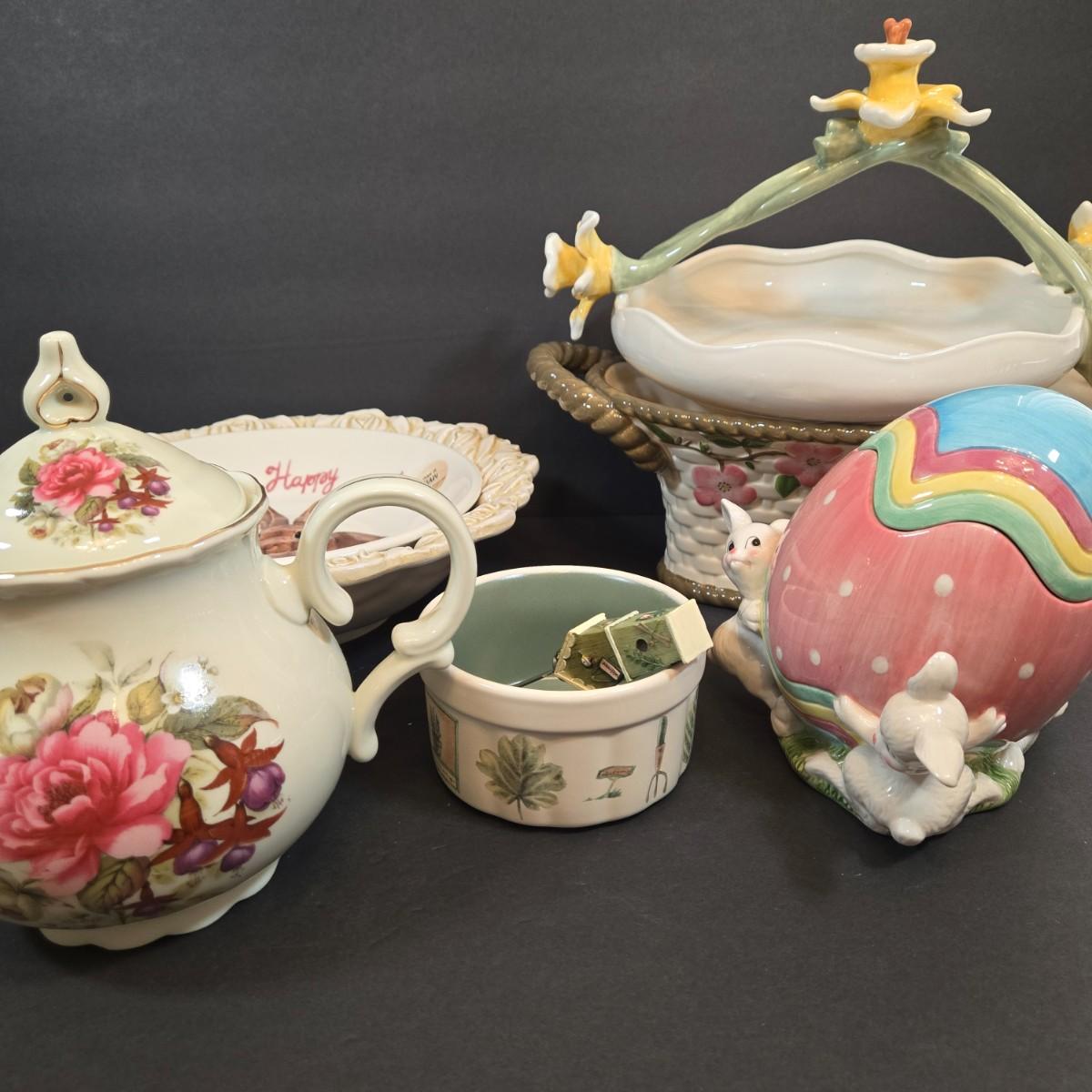 LOT 15D: Spring/Easter Tableware Including Fitz and Floyd Egg, Formalities Tea Pot, and More
