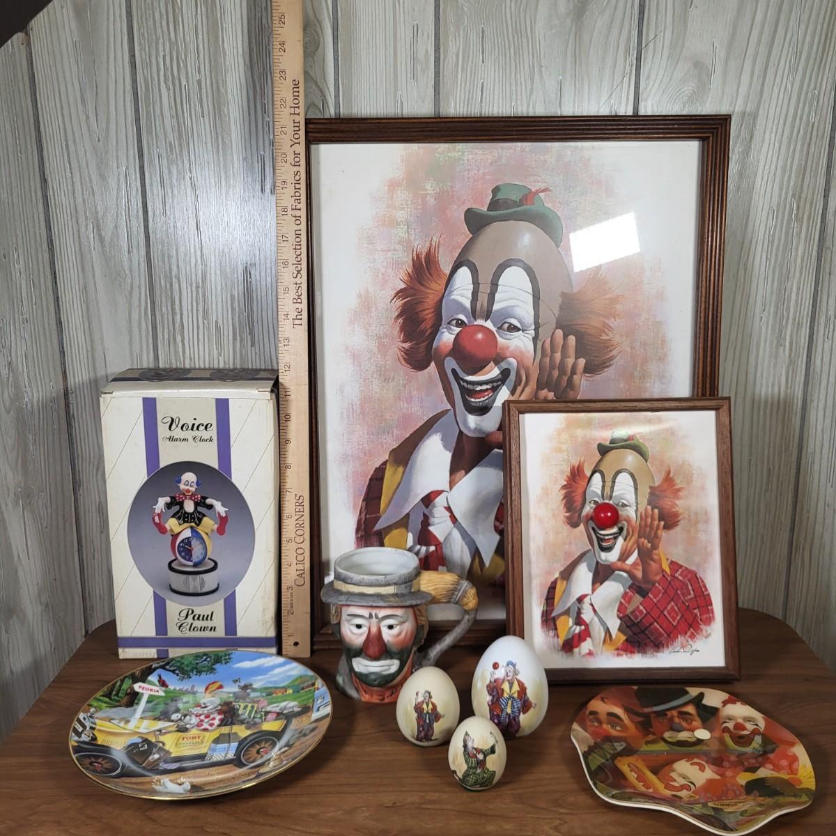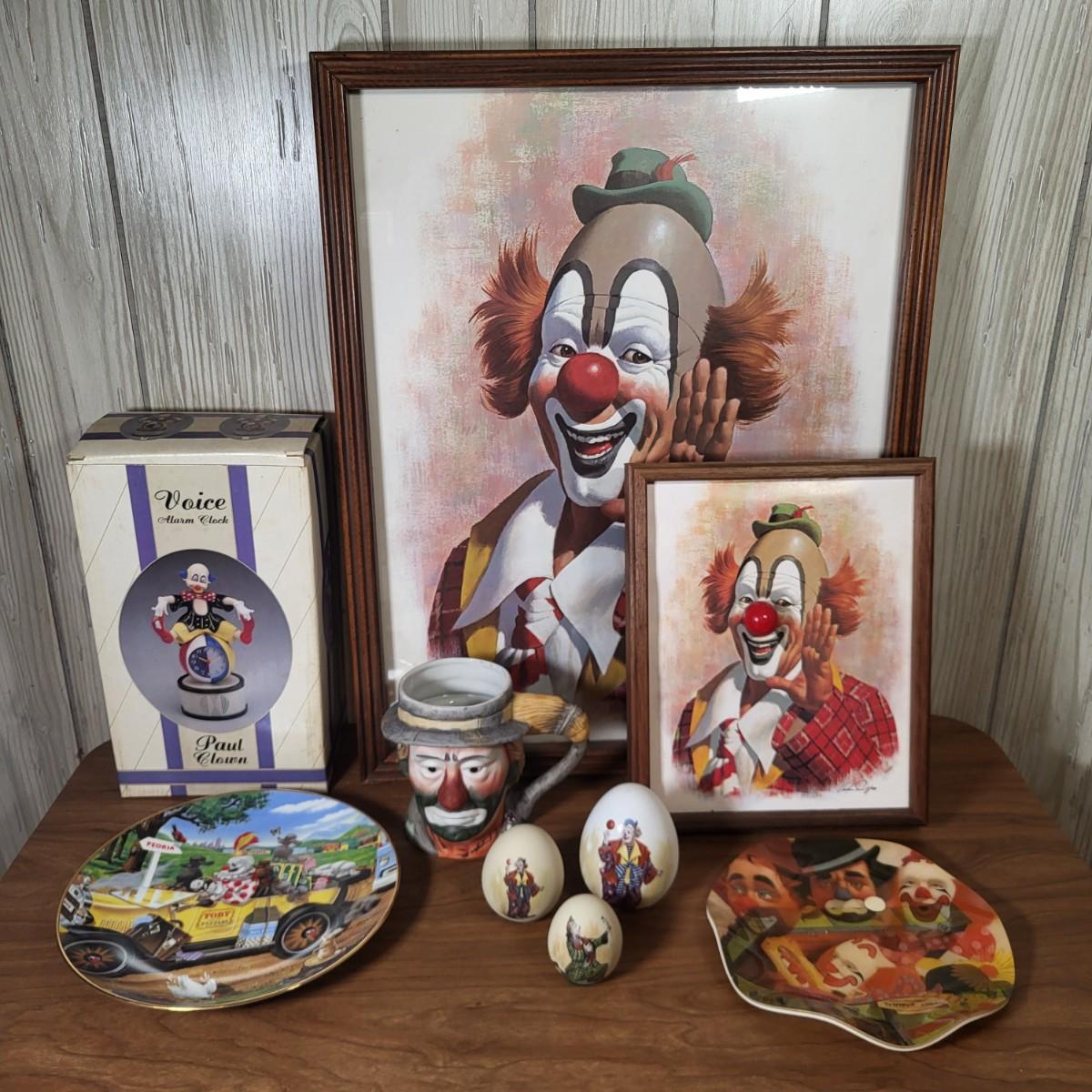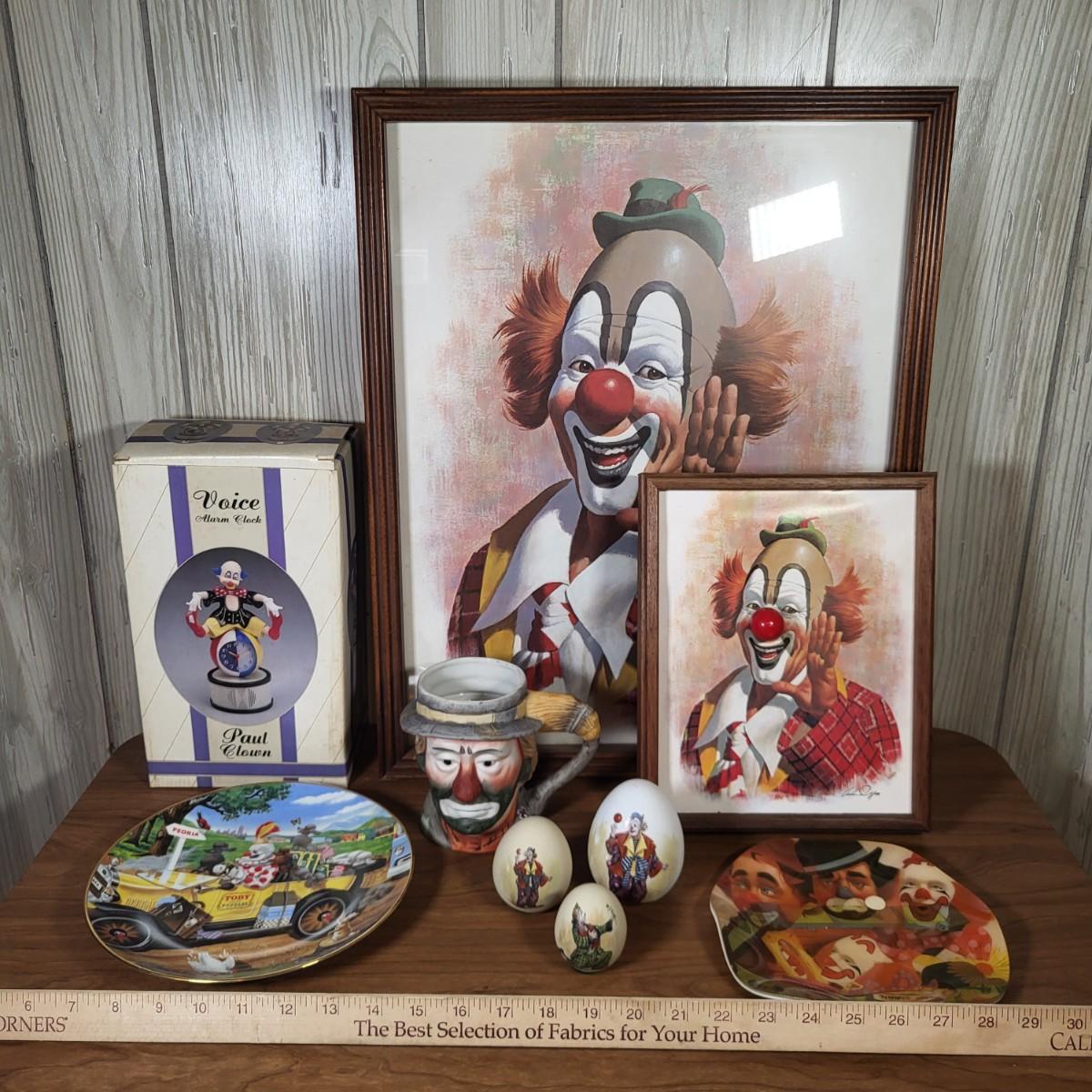LOT 54B: Vintage Clown Collection Featuring Painted Eggs, Clown Plates and Artwork