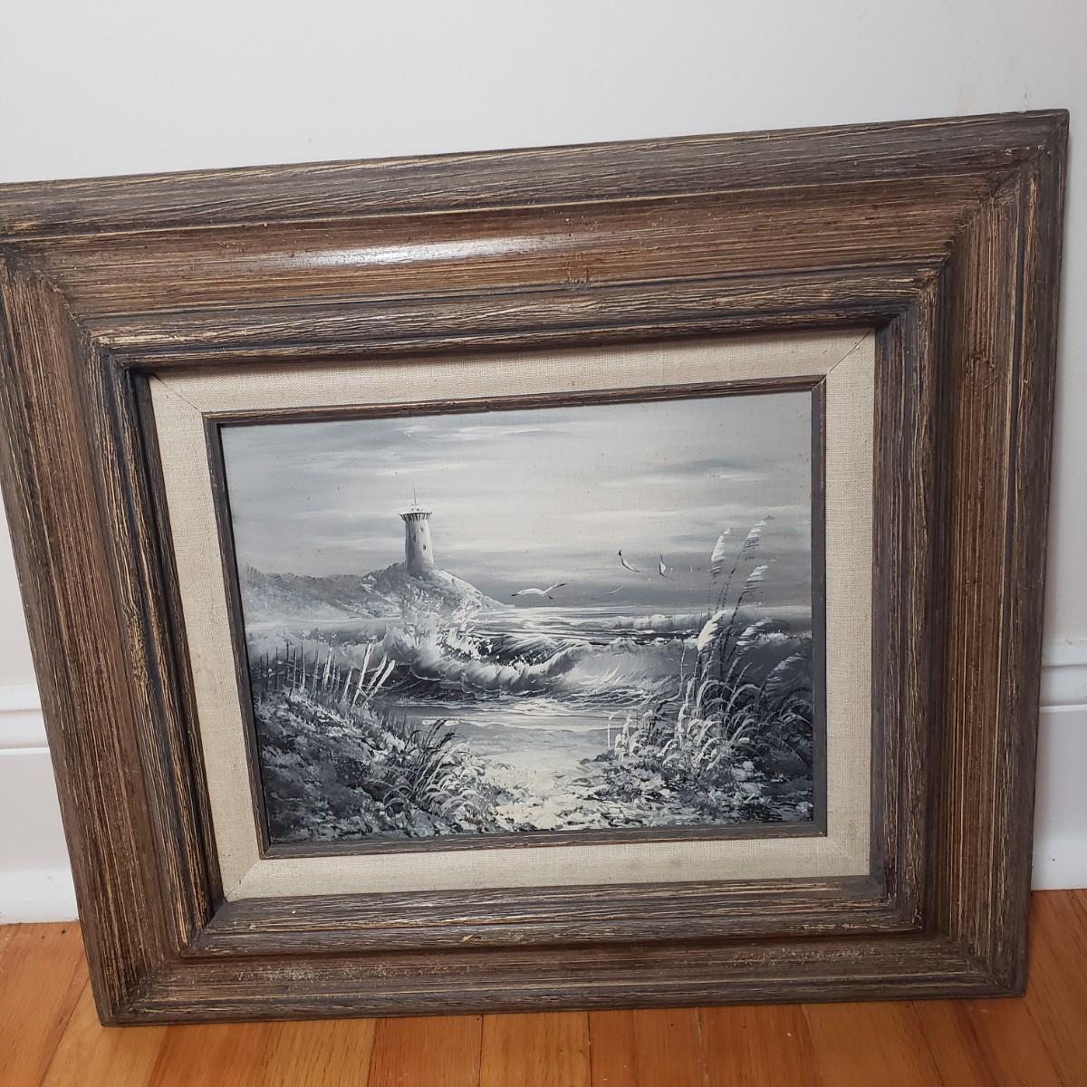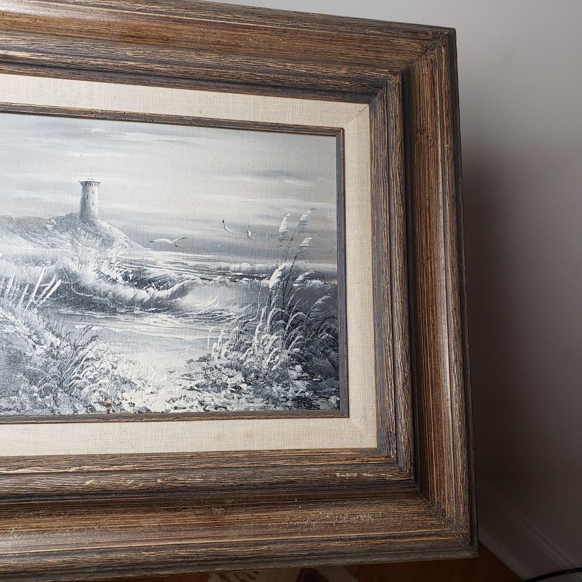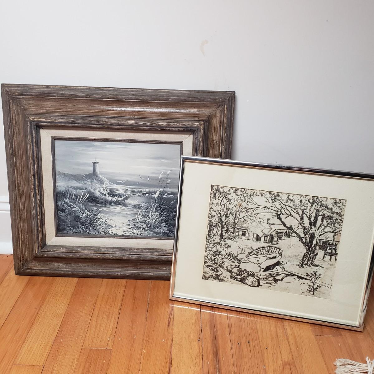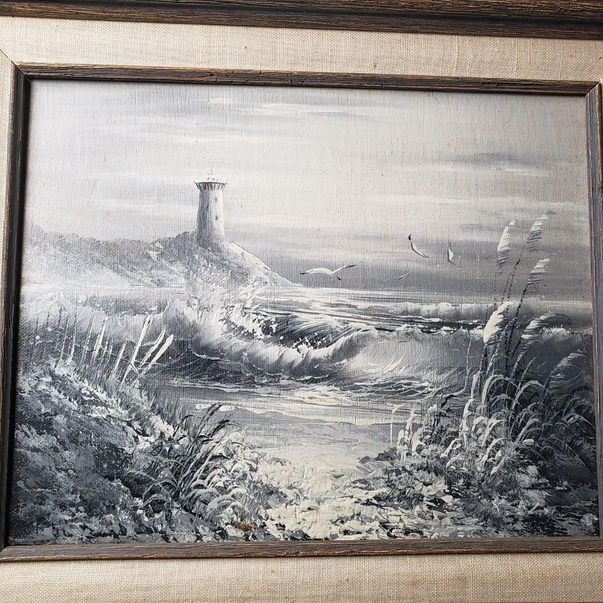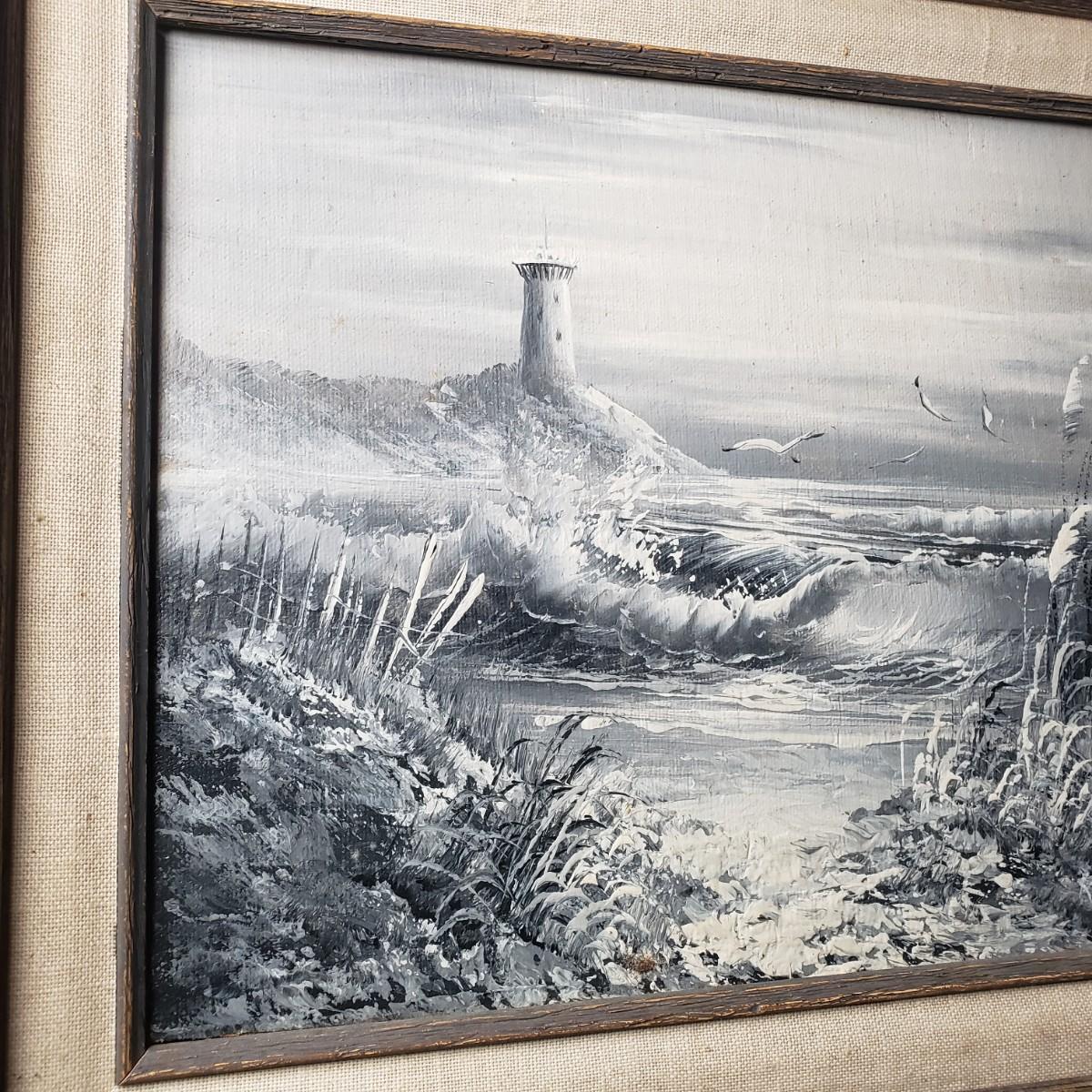 LOT 82L: Signed Lighthouse Seaside Oil Painting with Black & White Art Drawing
