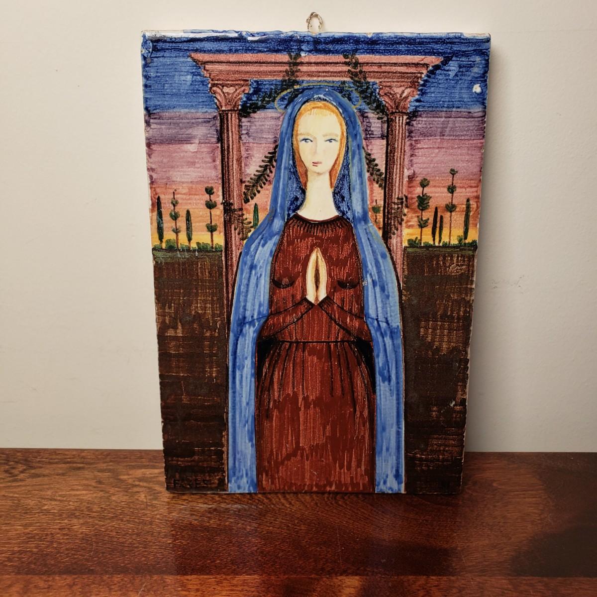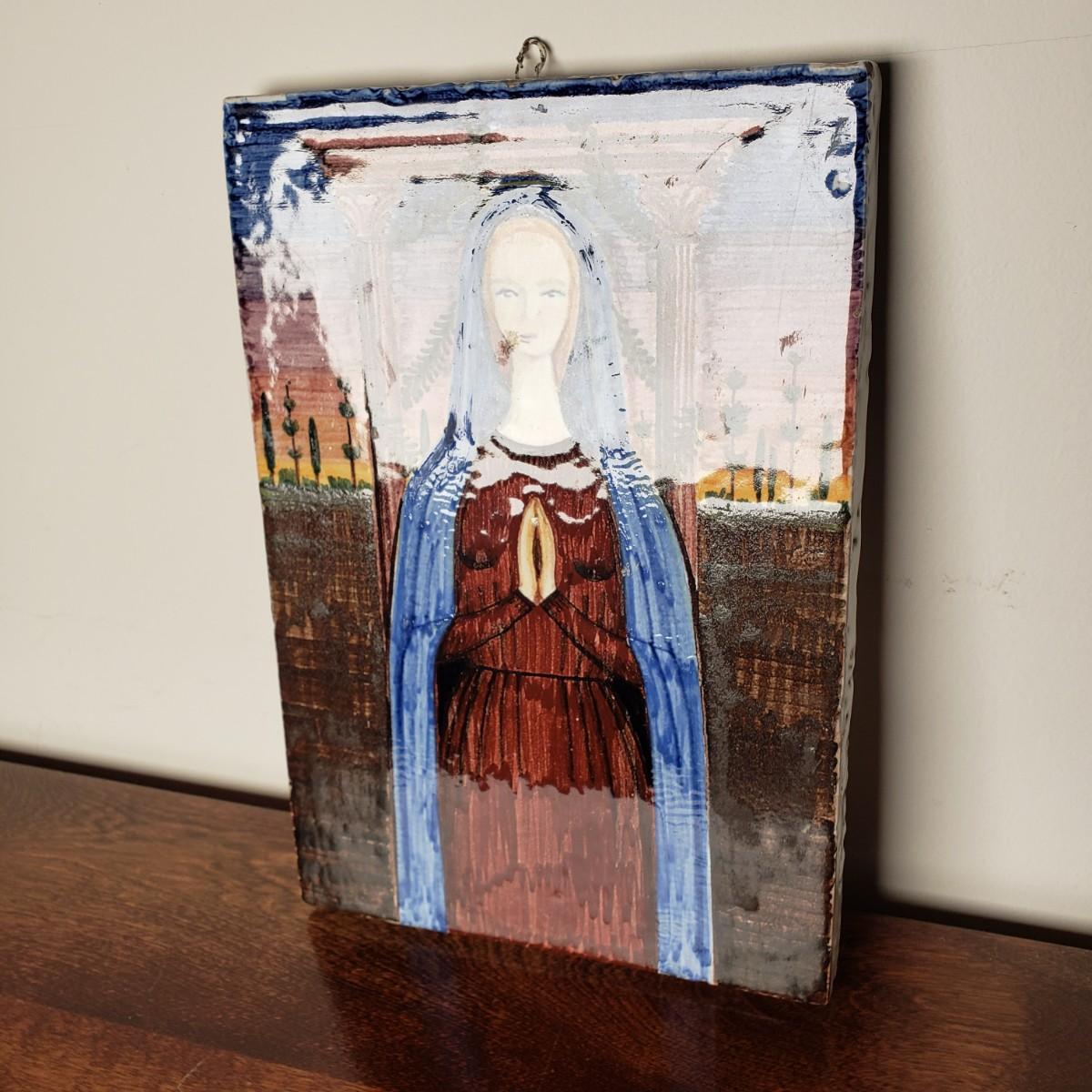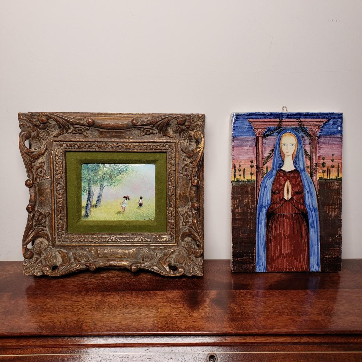 LOT 93L: Signed Enamel on Copper Framed Art & Ceramic Tile of Virgin Mary