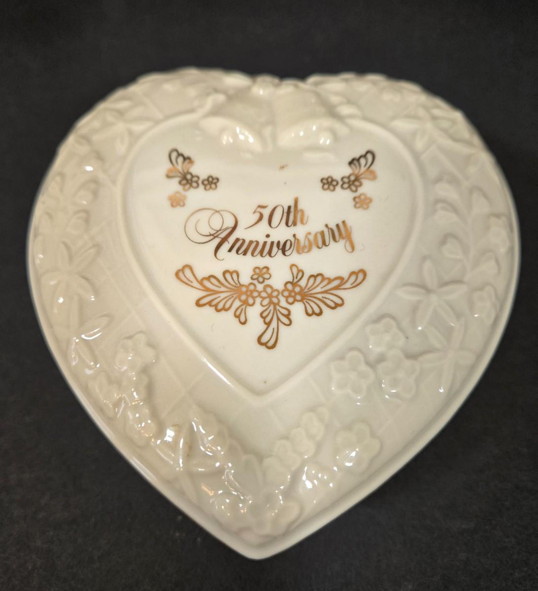 LOT 107D: Lenox Globe Vase, Dove Candy Dish, and 50th Anniversary Heart Shaped Trinket Box with Lid
