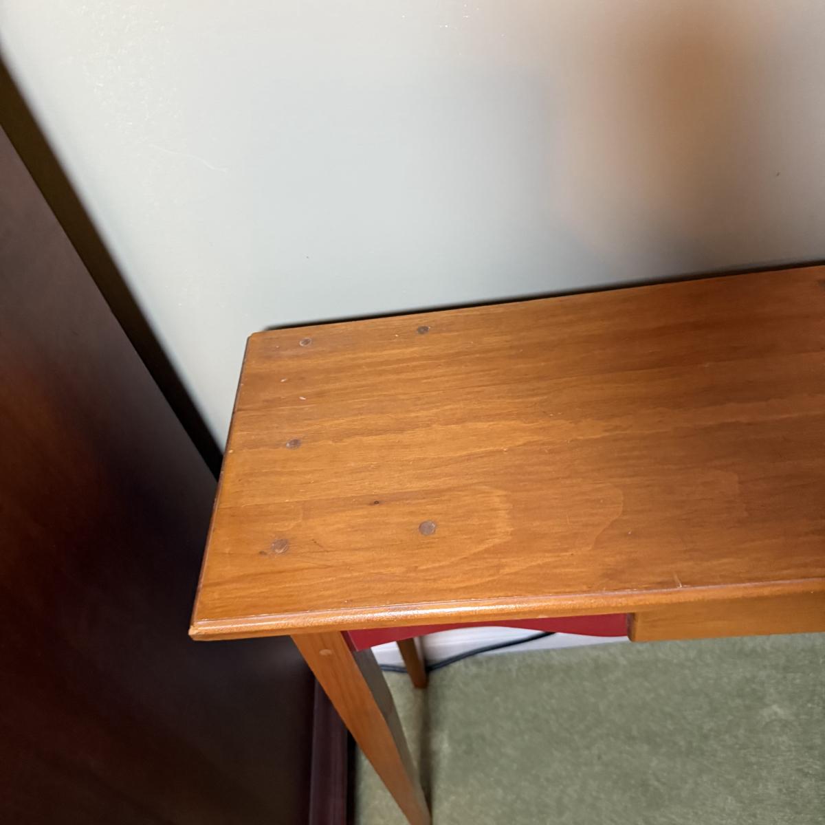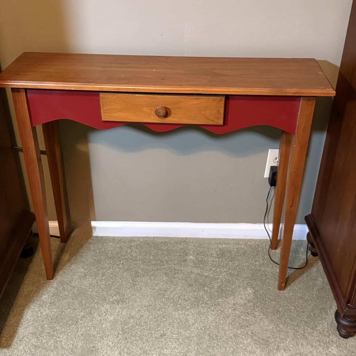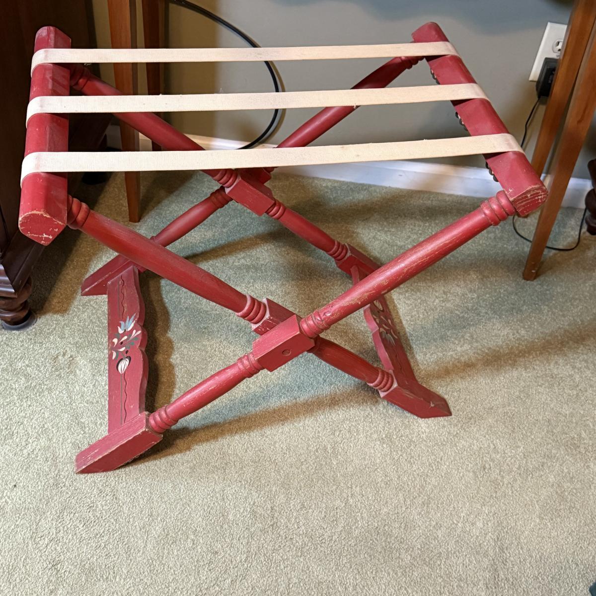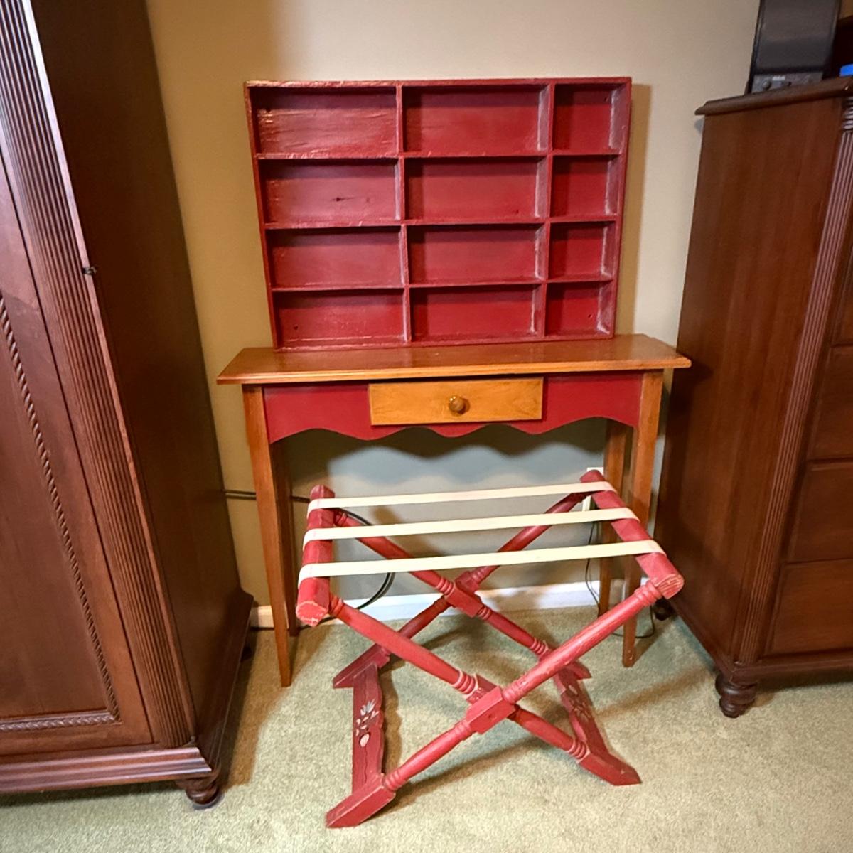 LOT 32: Amish Style Wood One Drawer Side State with Red Accent, Vintage/Antique Red Shelf and Luggage Stand