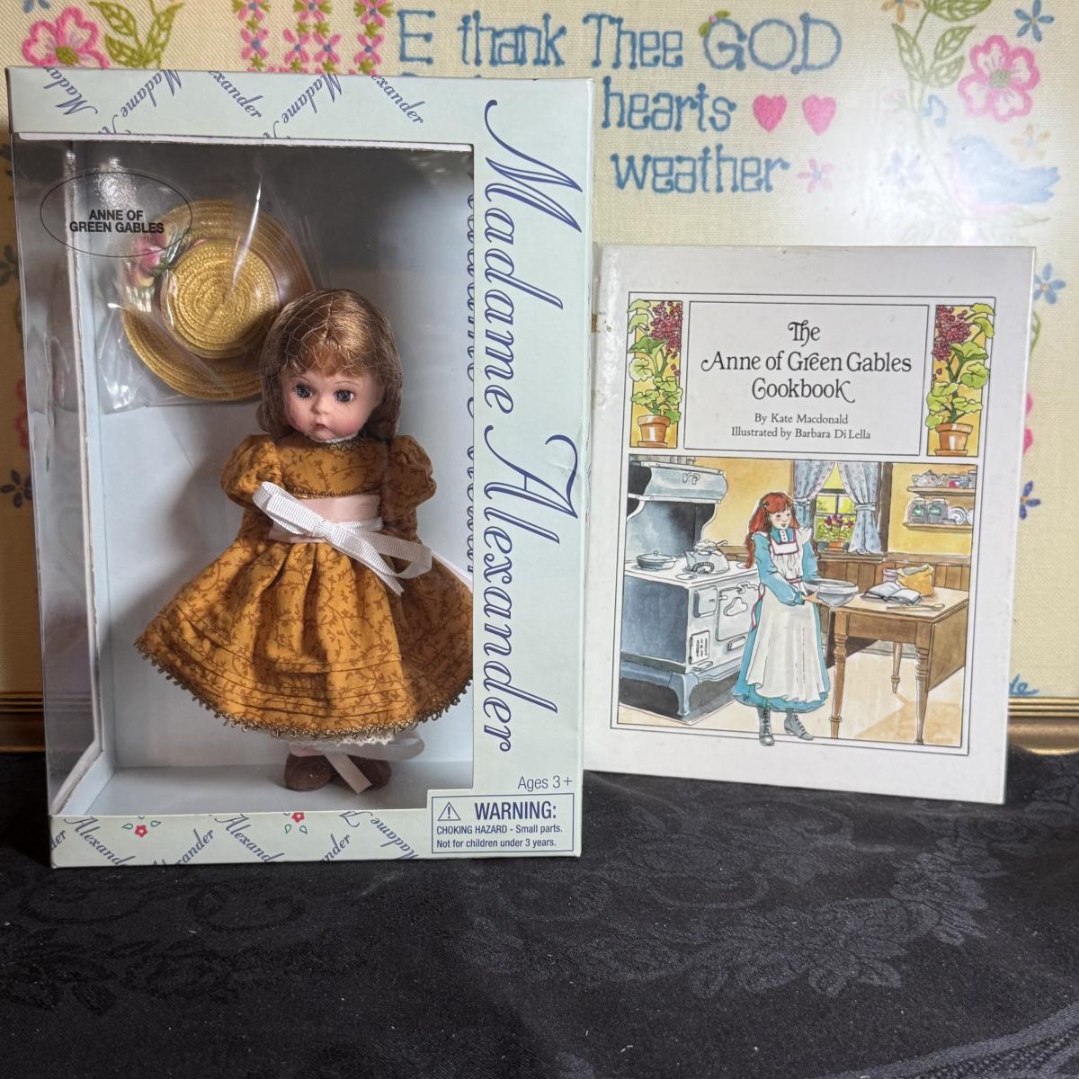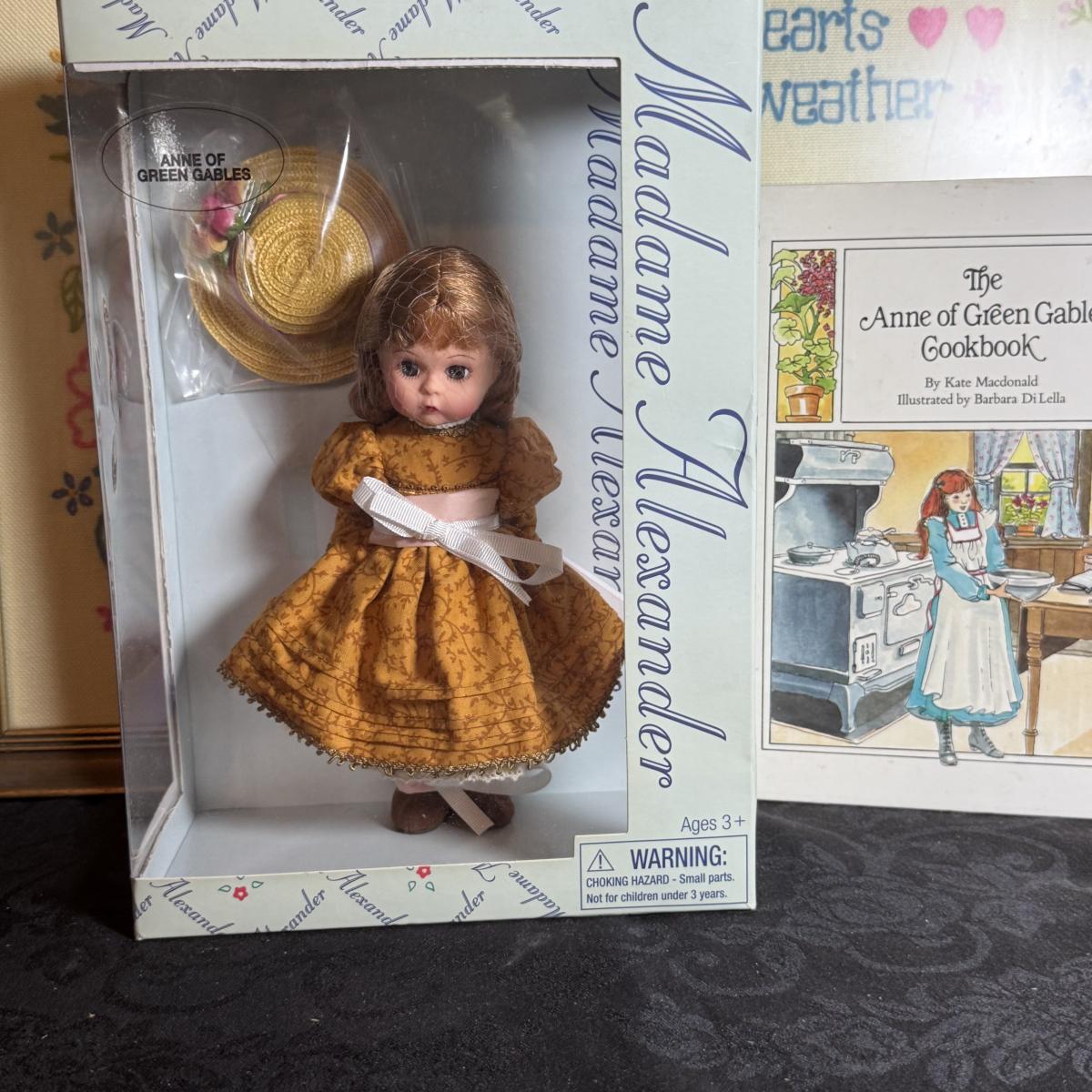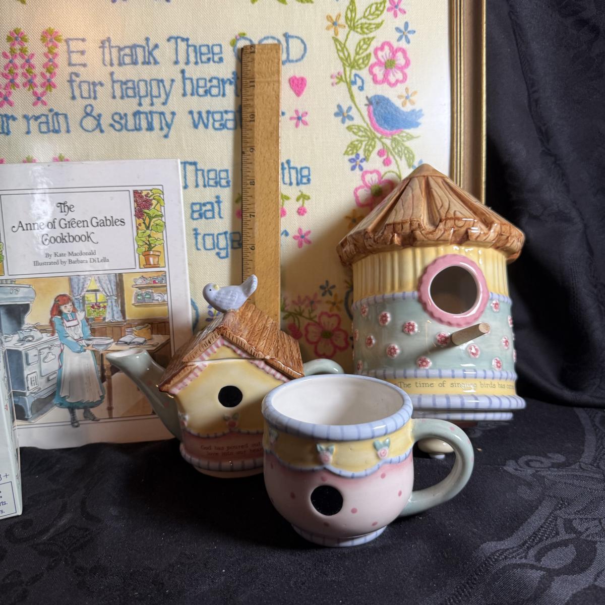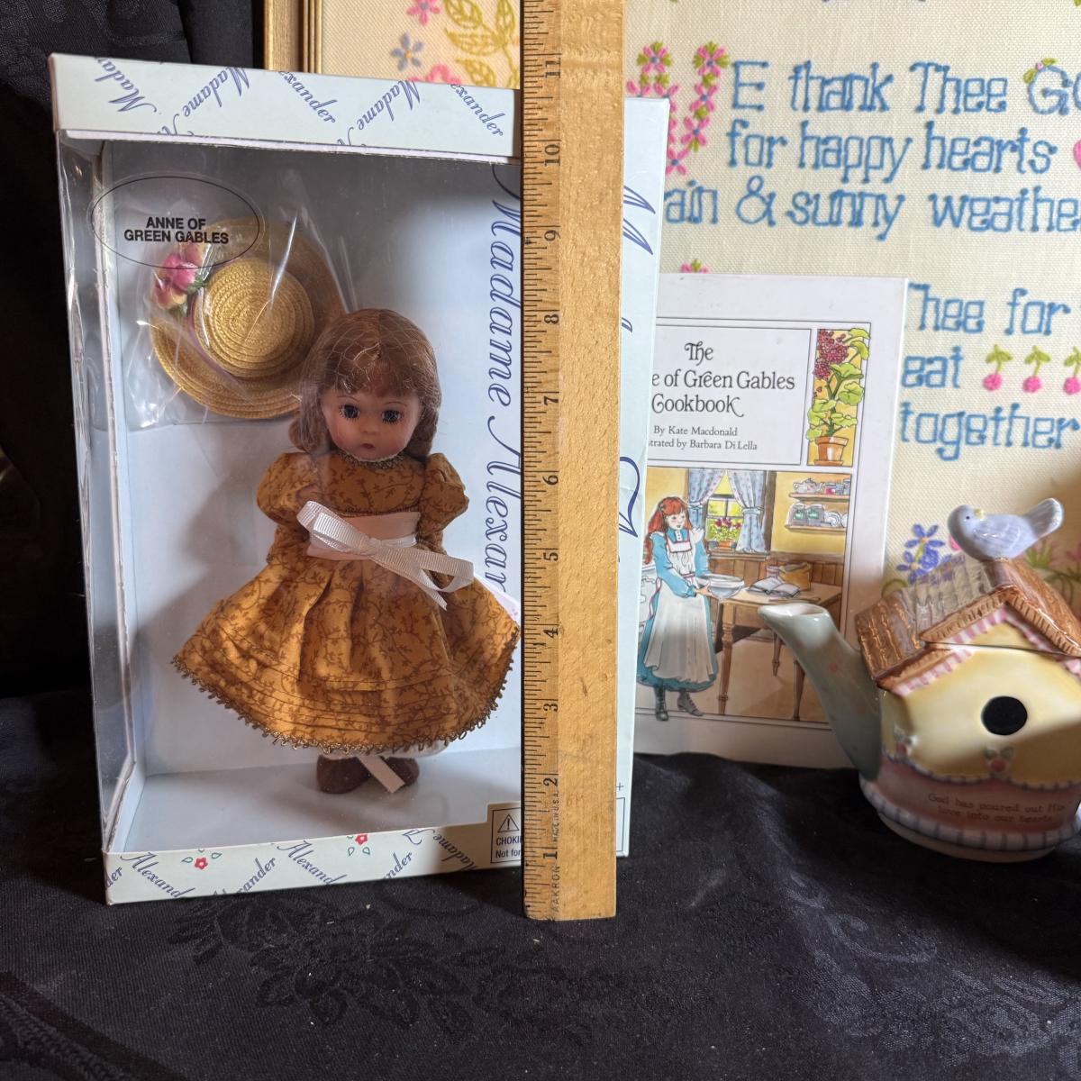 LOT 45: Vintage Framed Cross Stitch, Anne of Green Gables Madam Alexandra Doll and Cookbook, Ceramic Birdhouse and Birdhouse Tea Pot and Cup