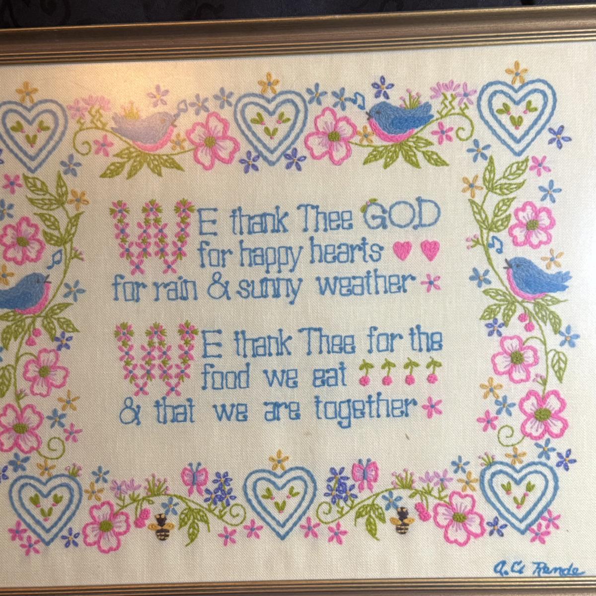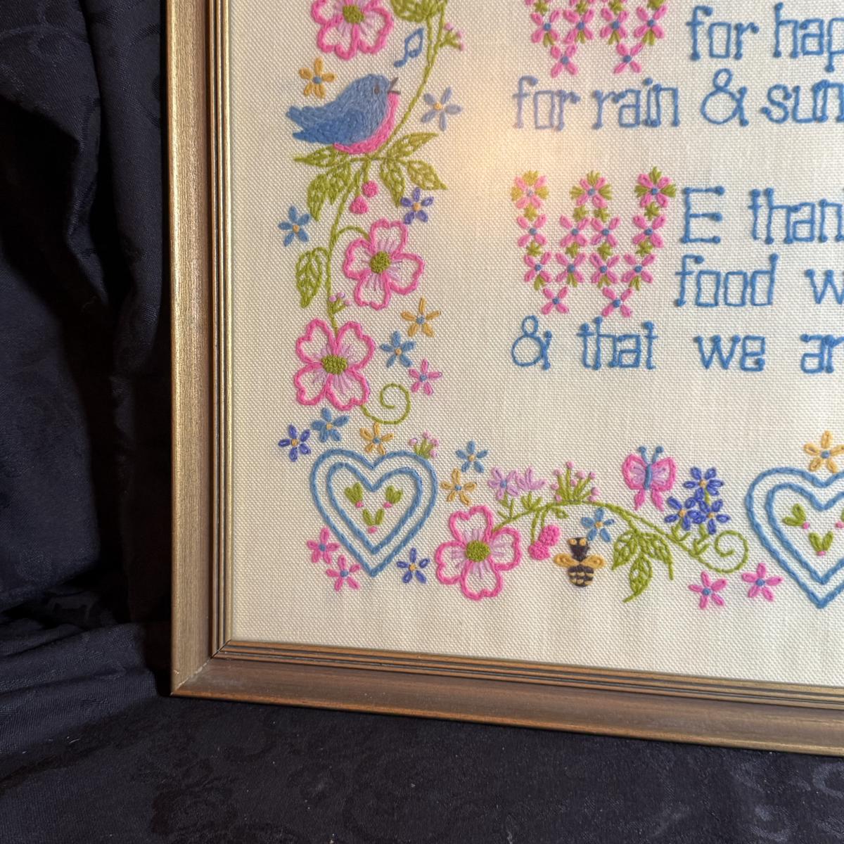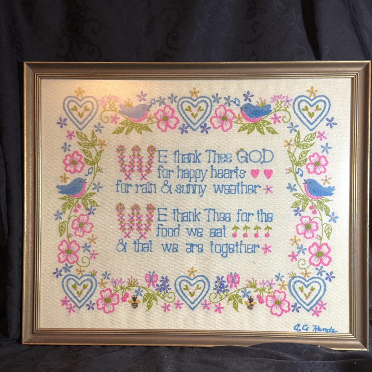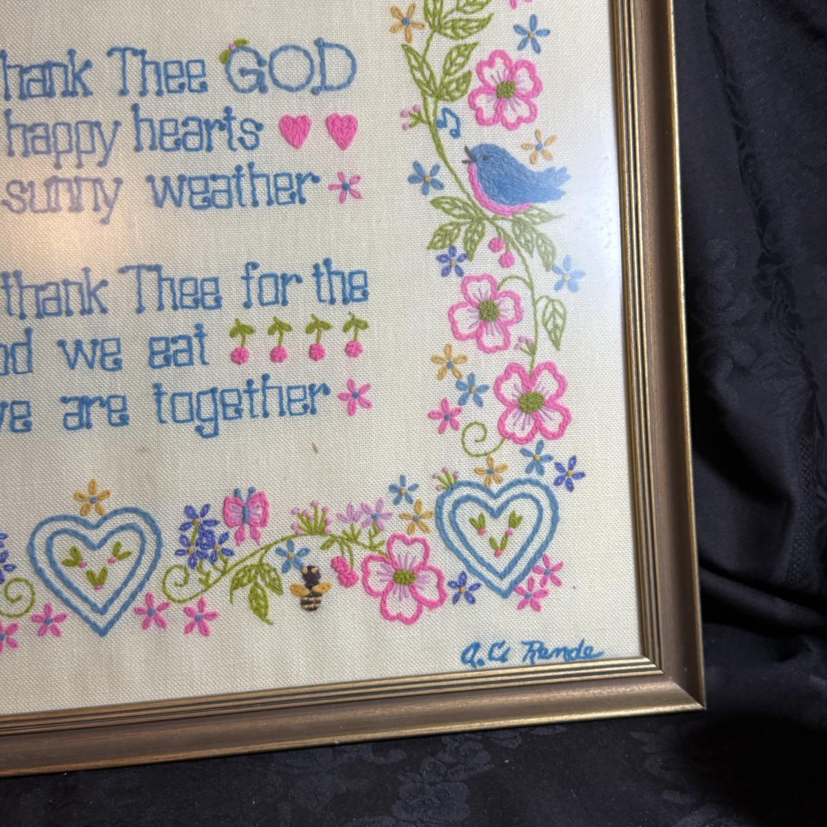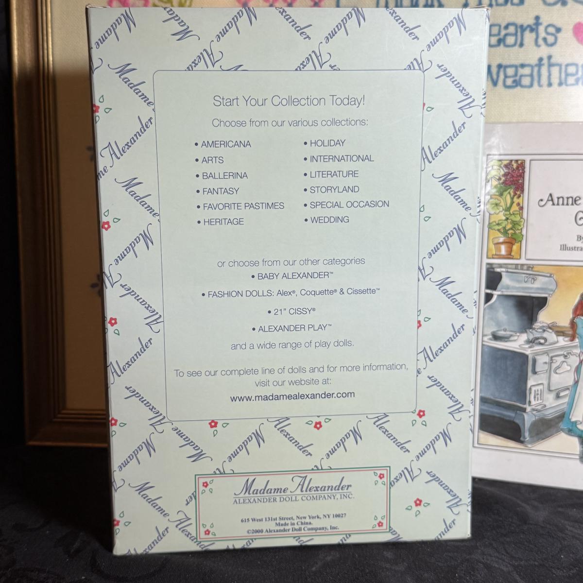 LOT 45: Vintage Framed Cross Stitch, Anne of Green Gables Madam Alexandra Doll and Cookbook, Ceramic Birdhouse and Birdhouse Tea Pot and Cup