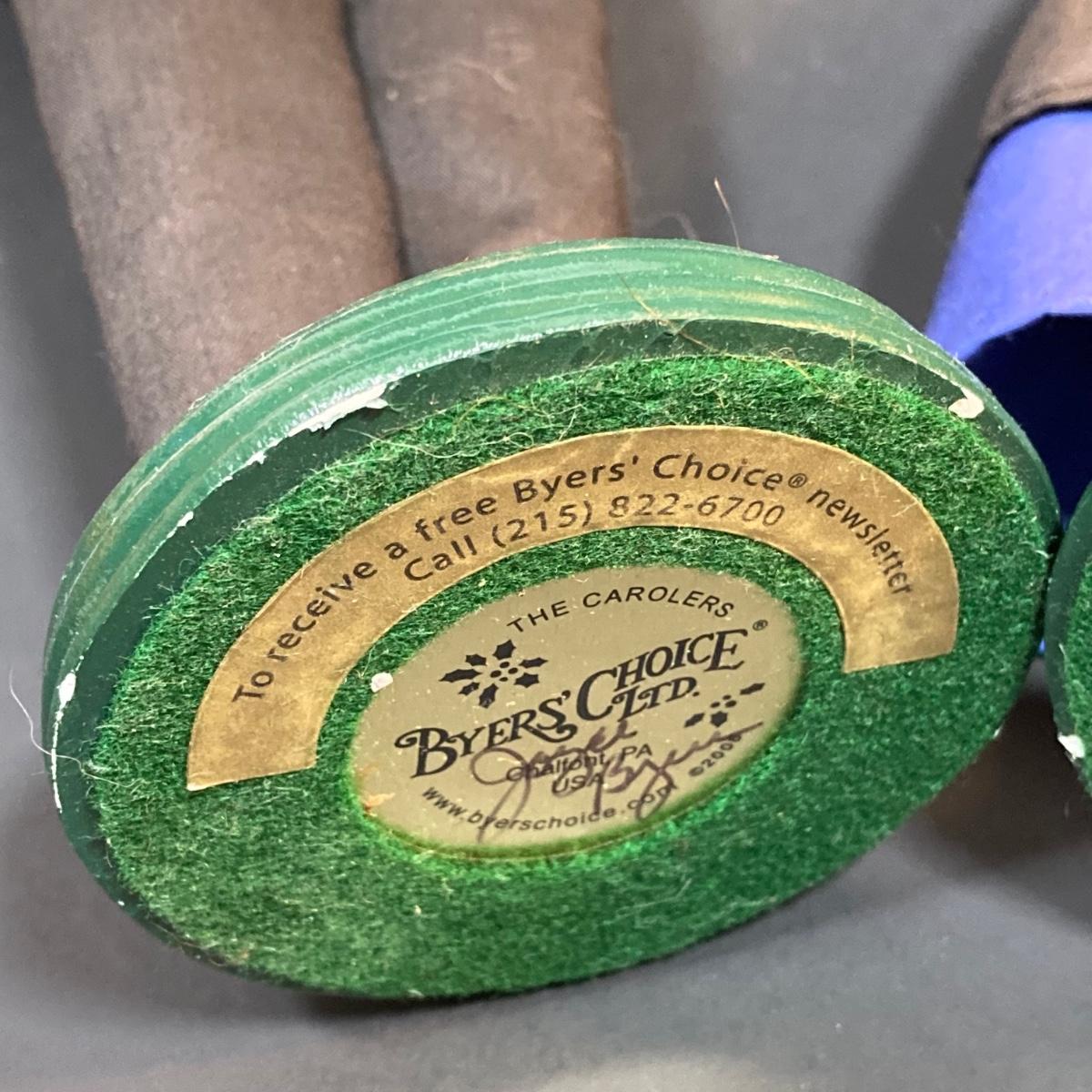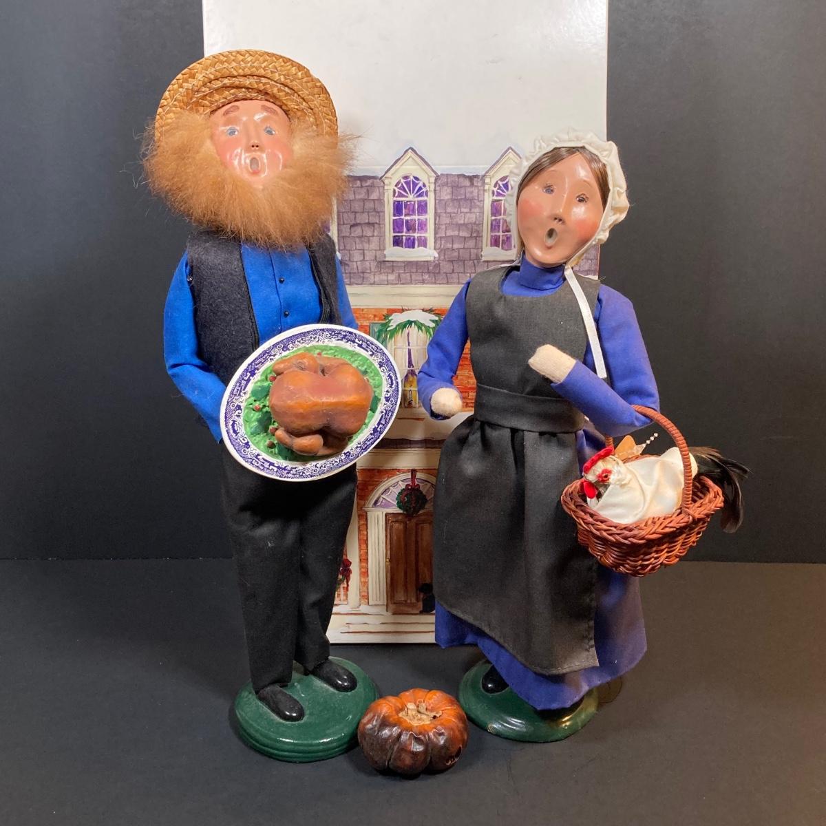 LOT 78: Byers' Choice Ltd. The Carolers Signed by Joyce Byers - Amish Man Holding Turkey, Amish Woman Holding Basket with Hen and Box