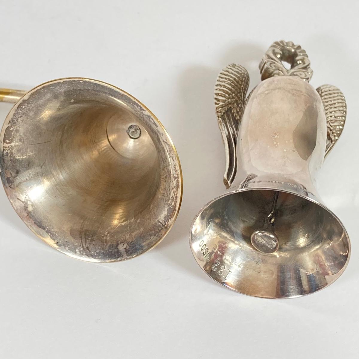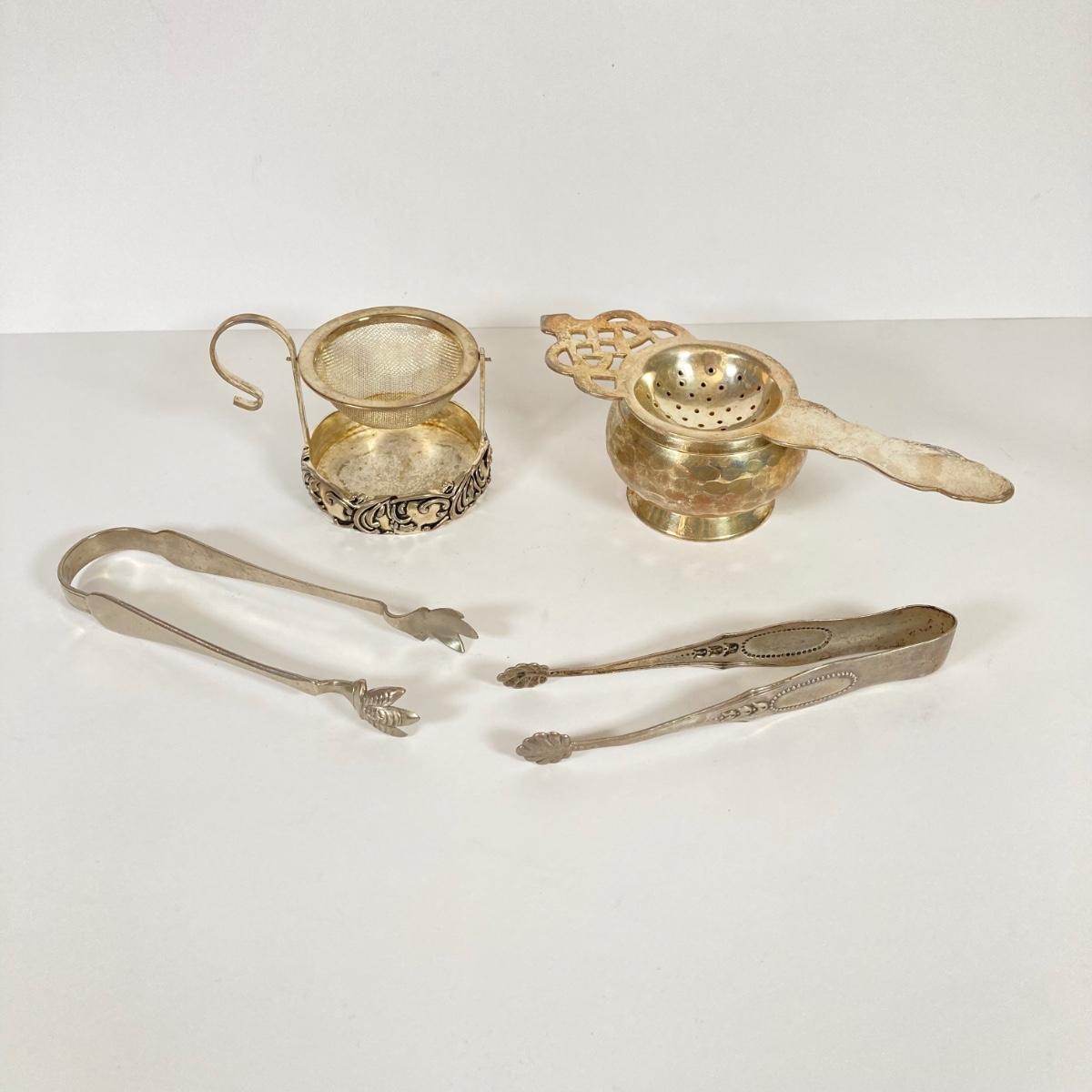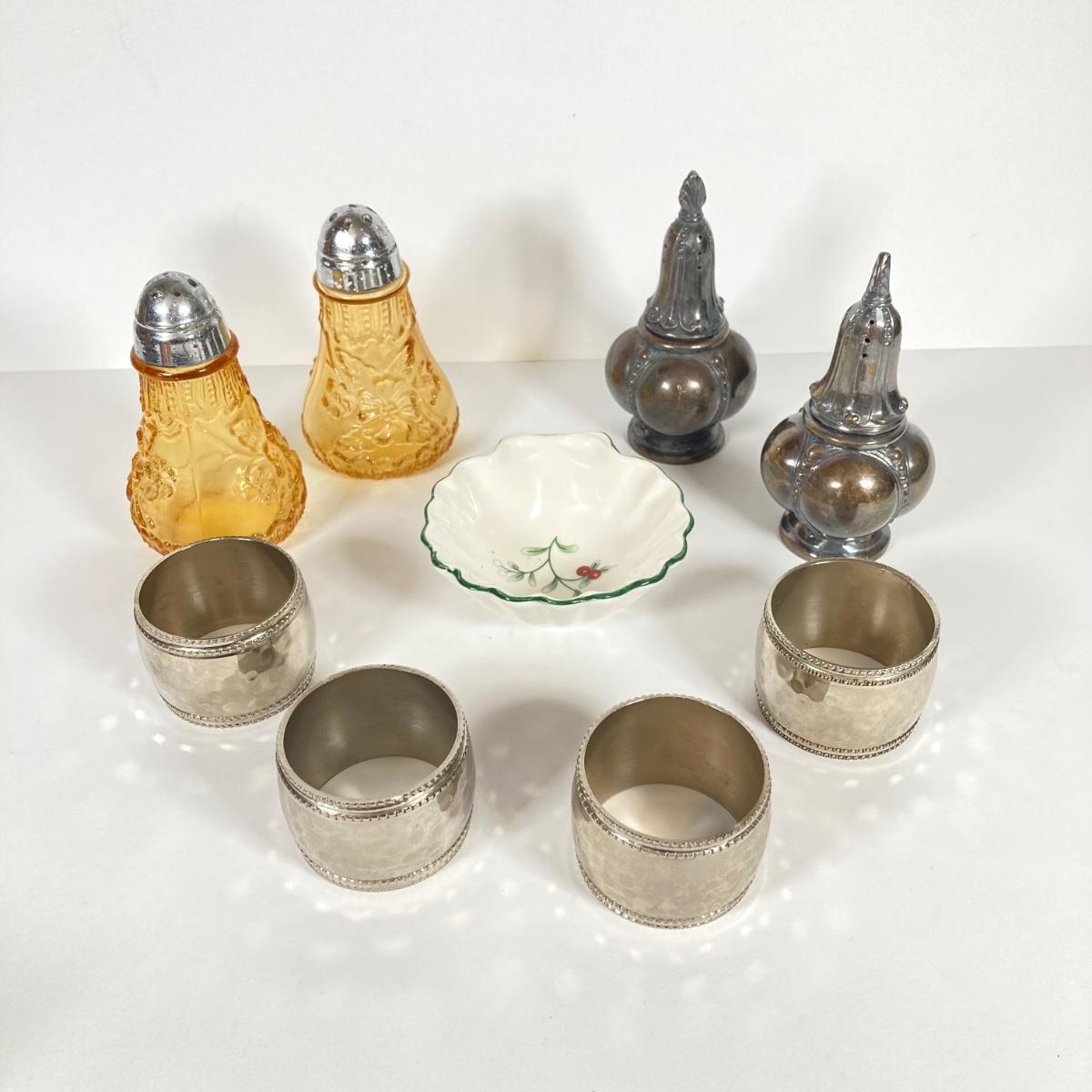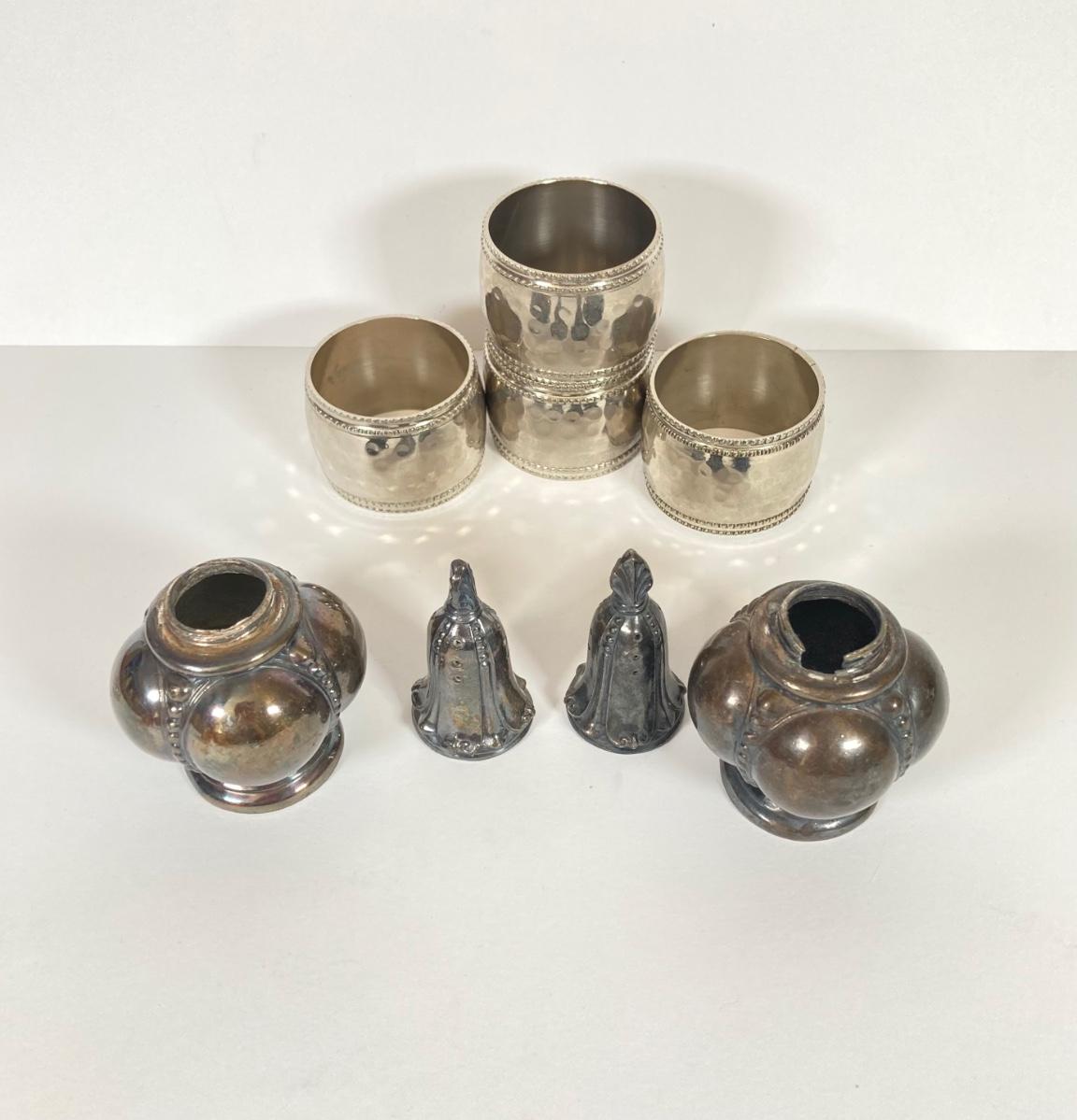 LOT 81: Vintage Serving Collection - Wilton Pewter Bowl, 800 Silver Tongs, Kopparsmedjan Copper Miniature Mugs, Silver Plated Salt and Pepper Shakers, Tea Bag Holders, Angel Bell and More