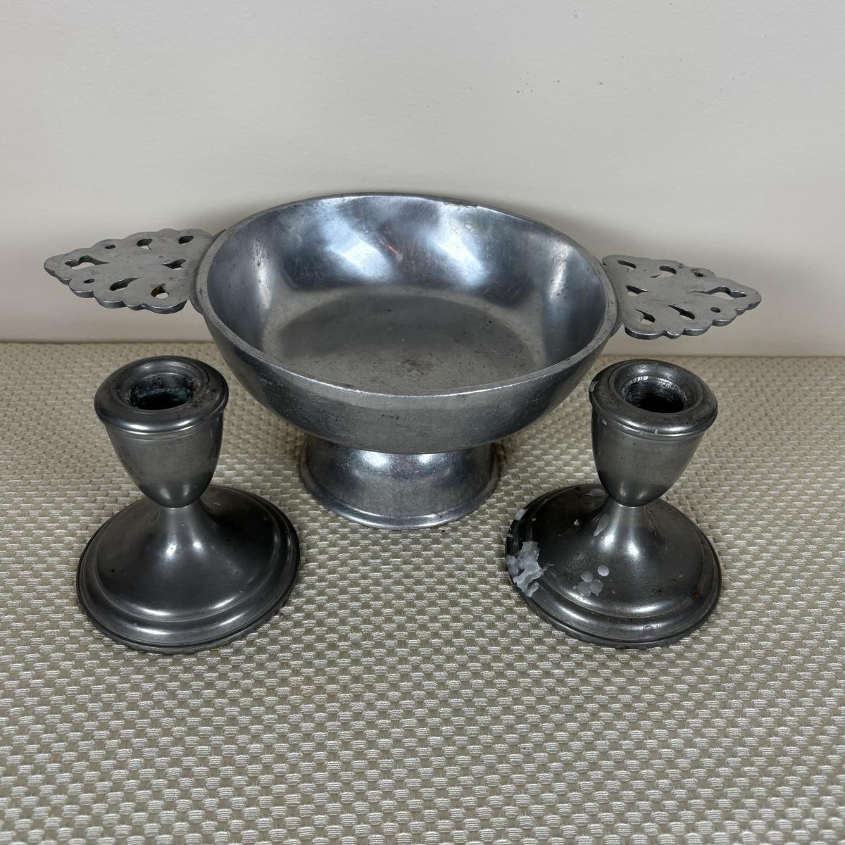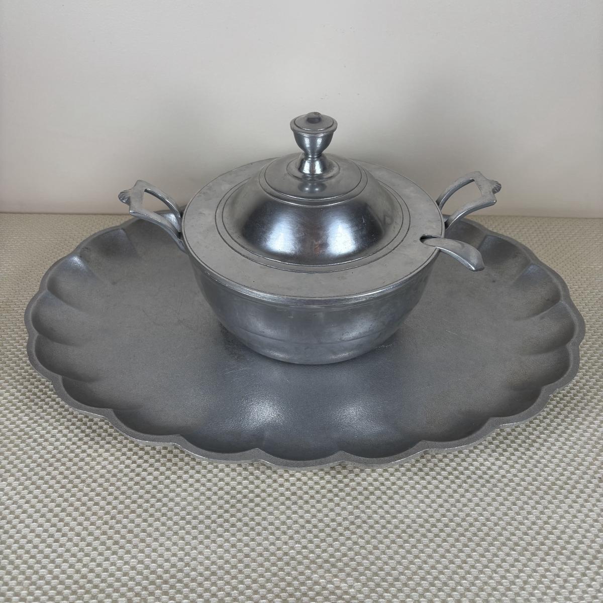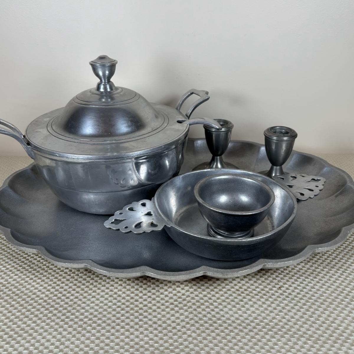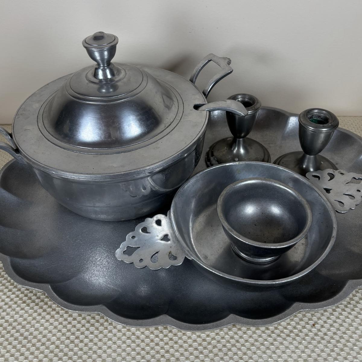 LOT 92: Empire Pewter Weighted Candle Sticks, Wilton Armetale Plough Tavern Soup Tureen w/Lid & Ladle. Wilton Armetale Pewter Serving Platter and More