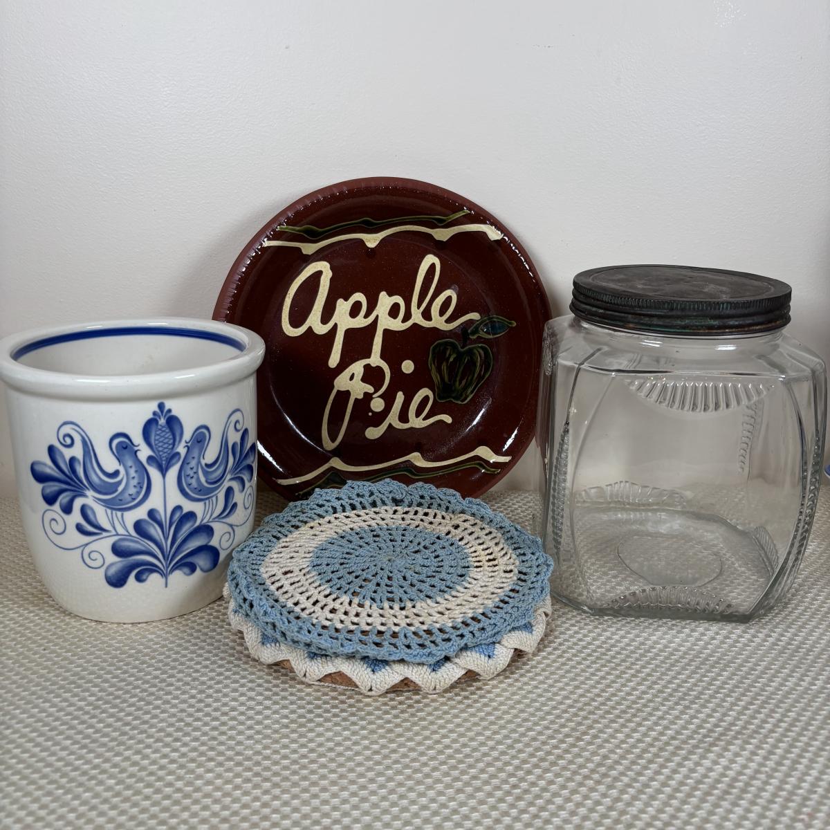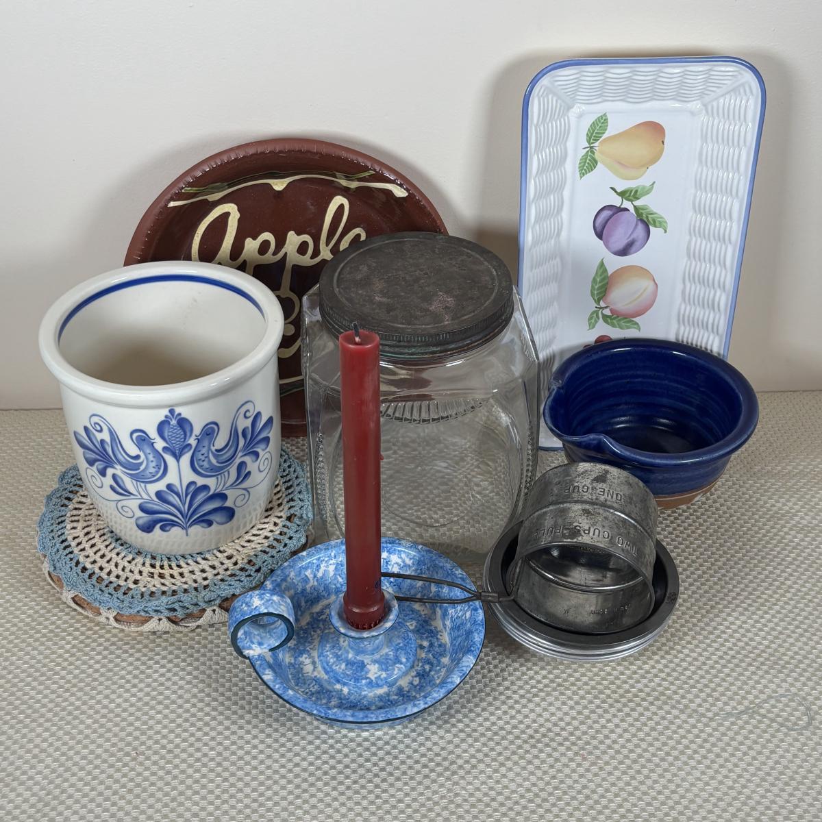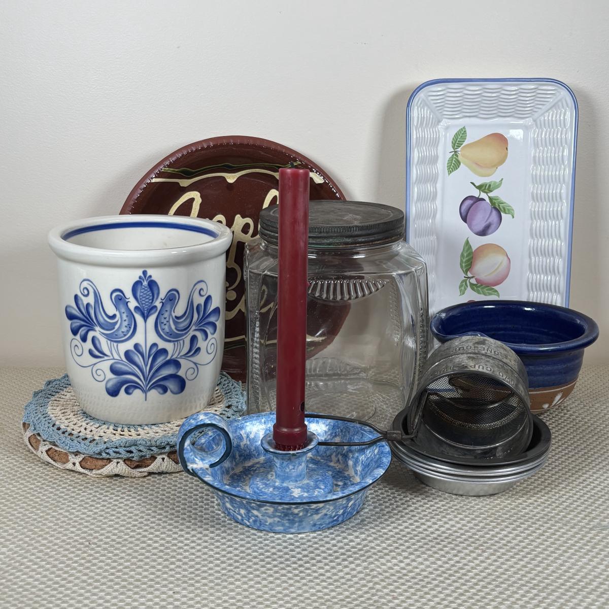 LOT 100: Tamashausky Red Earthen Ware "Apple Pie Plate", DDR Pottery Stoneware Crock, Stangl Spongeware Candle Stick & More