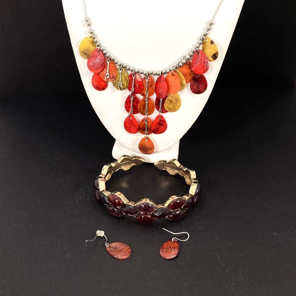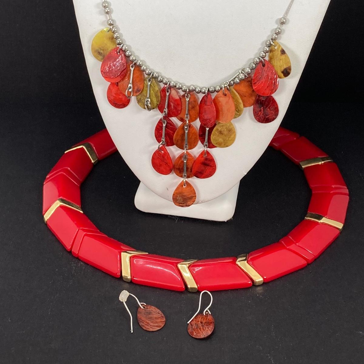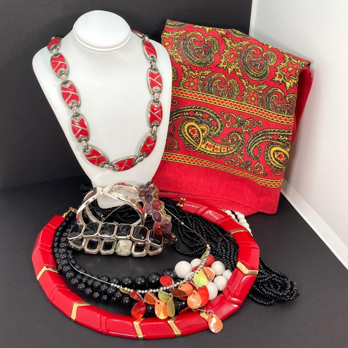 LOT 115: Red, Black and Orange Themed Fashion Jewelry with Paisley Print Scarf