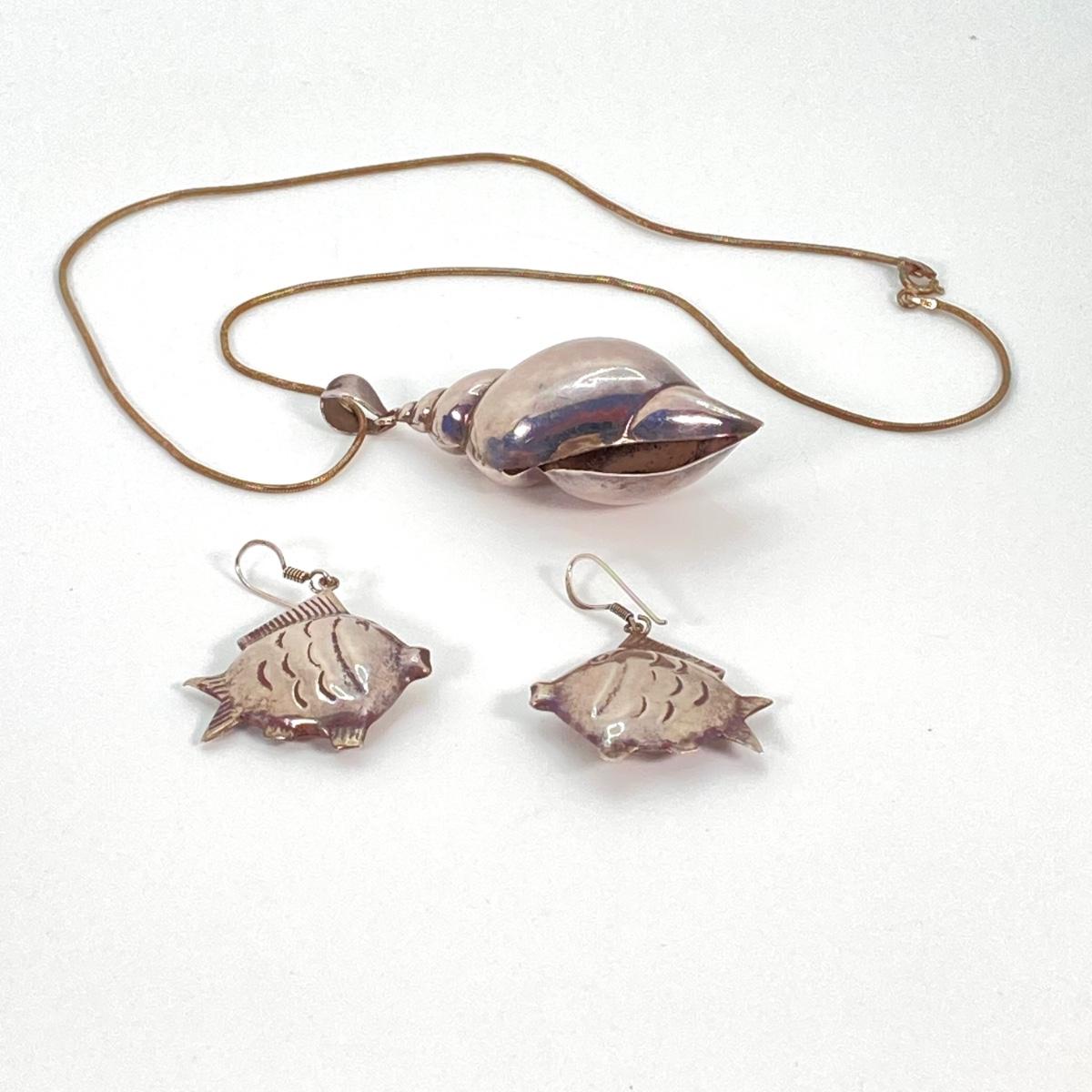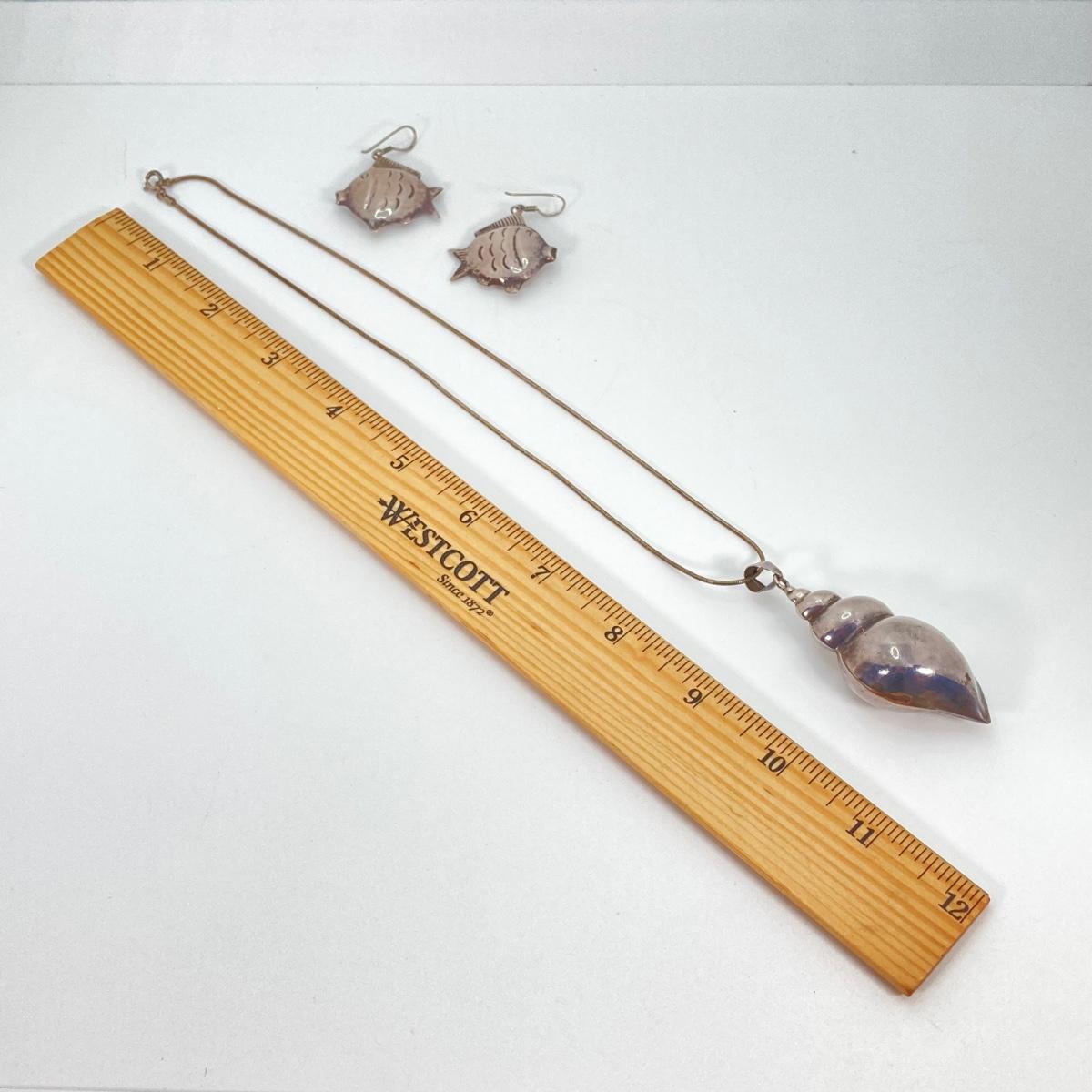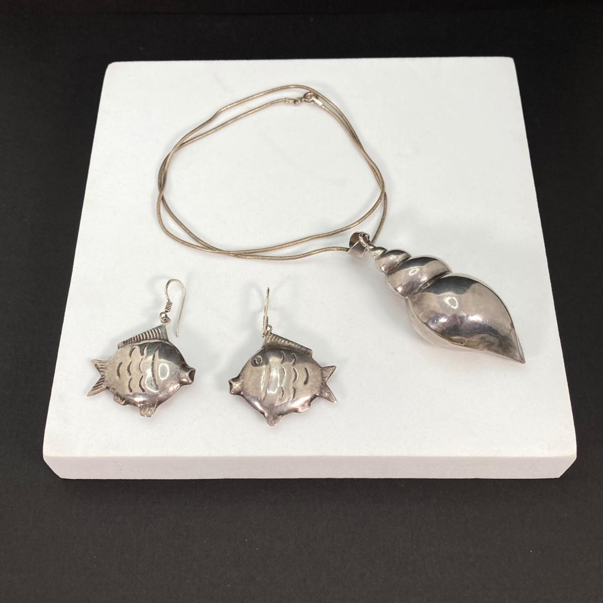 LOT 118: Sterling Silver Jewelry - Dangling Fish Earrings and Shell Pendant Necklace