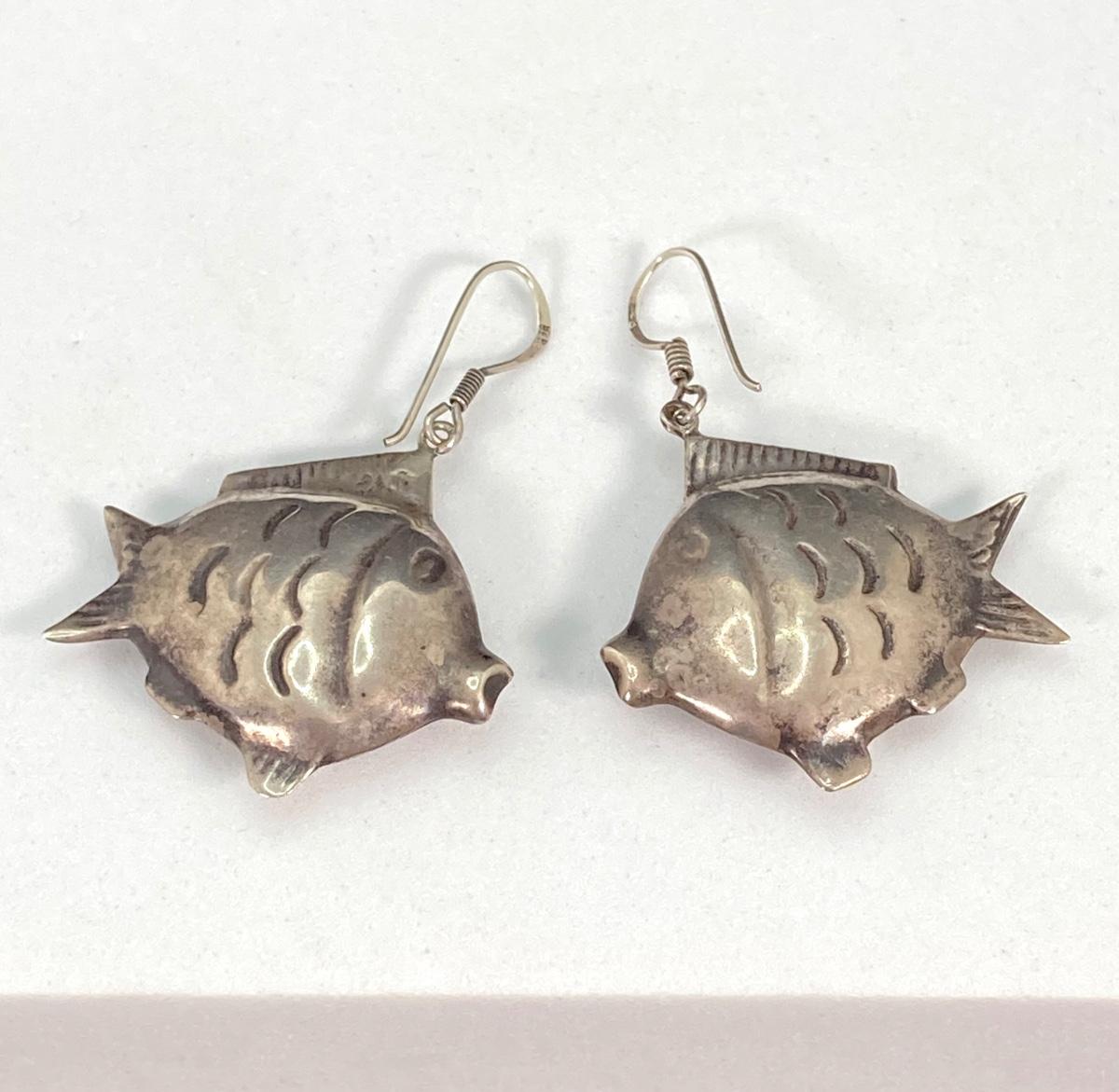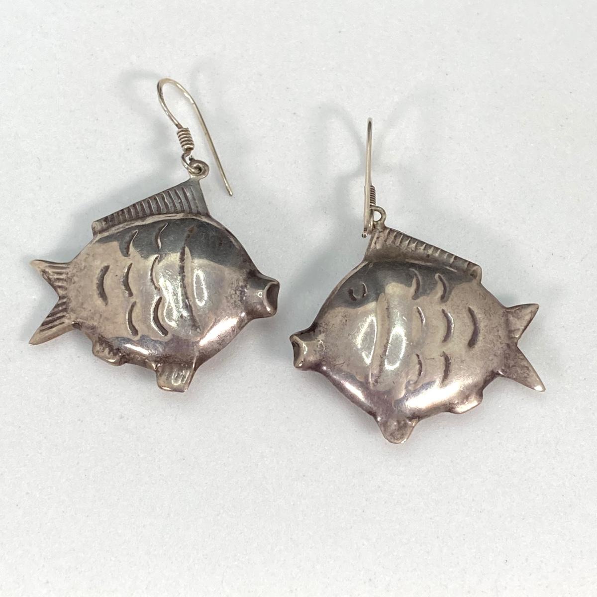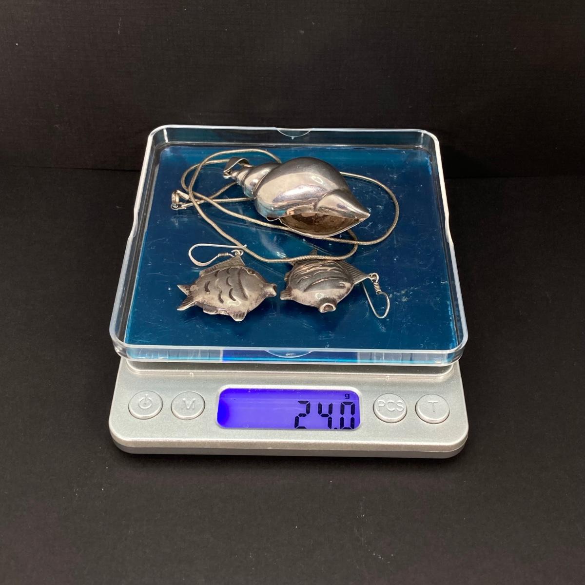 LOT 118: Sterling Silver Jewelry - Dangling Fish Earrings and Shell Pendant Necklace