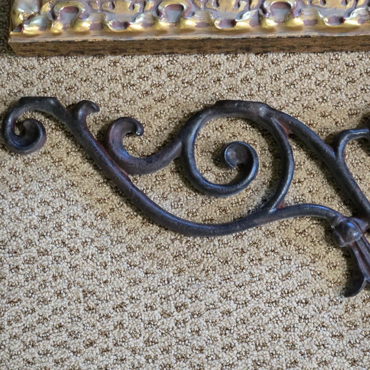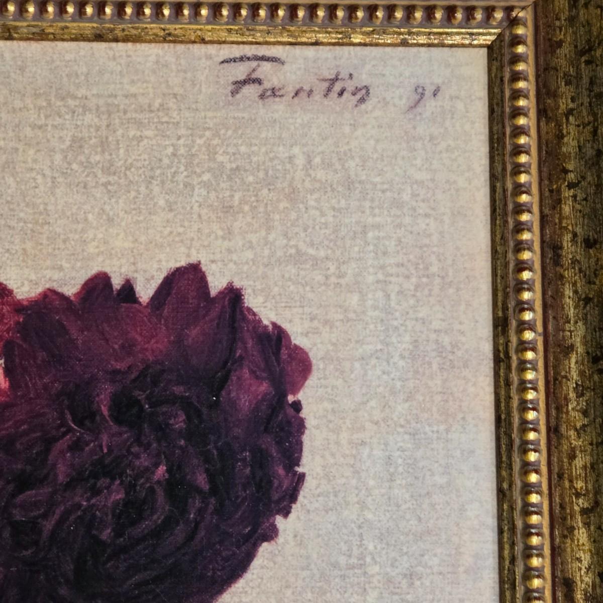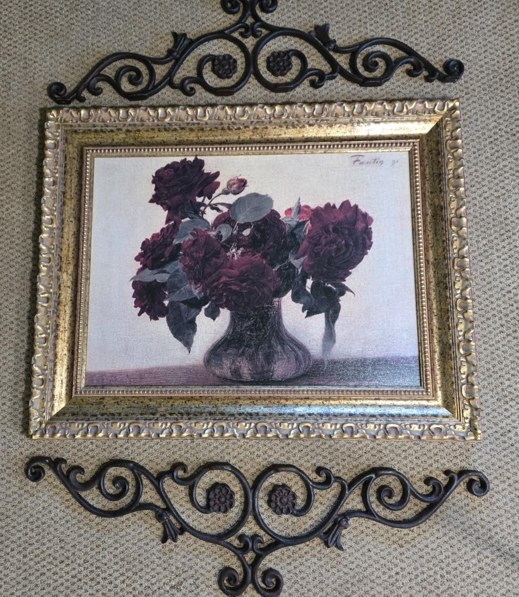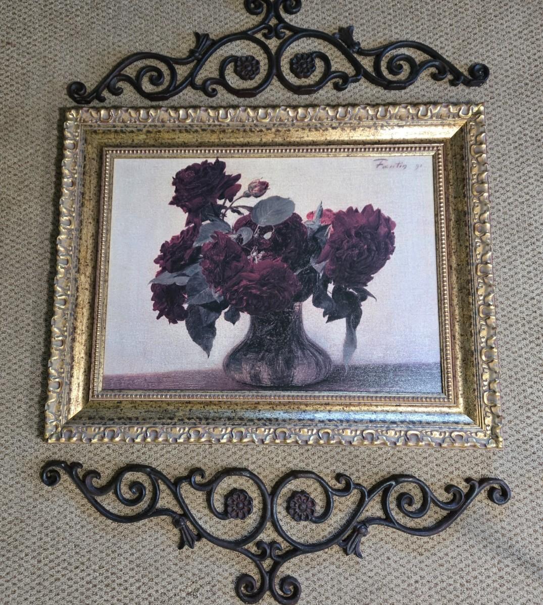LOT 161Y: Dark Roses by the French Artist Henri Fantin-Latou Reproduction and Two Metal Scroll Work Wall Hangings
