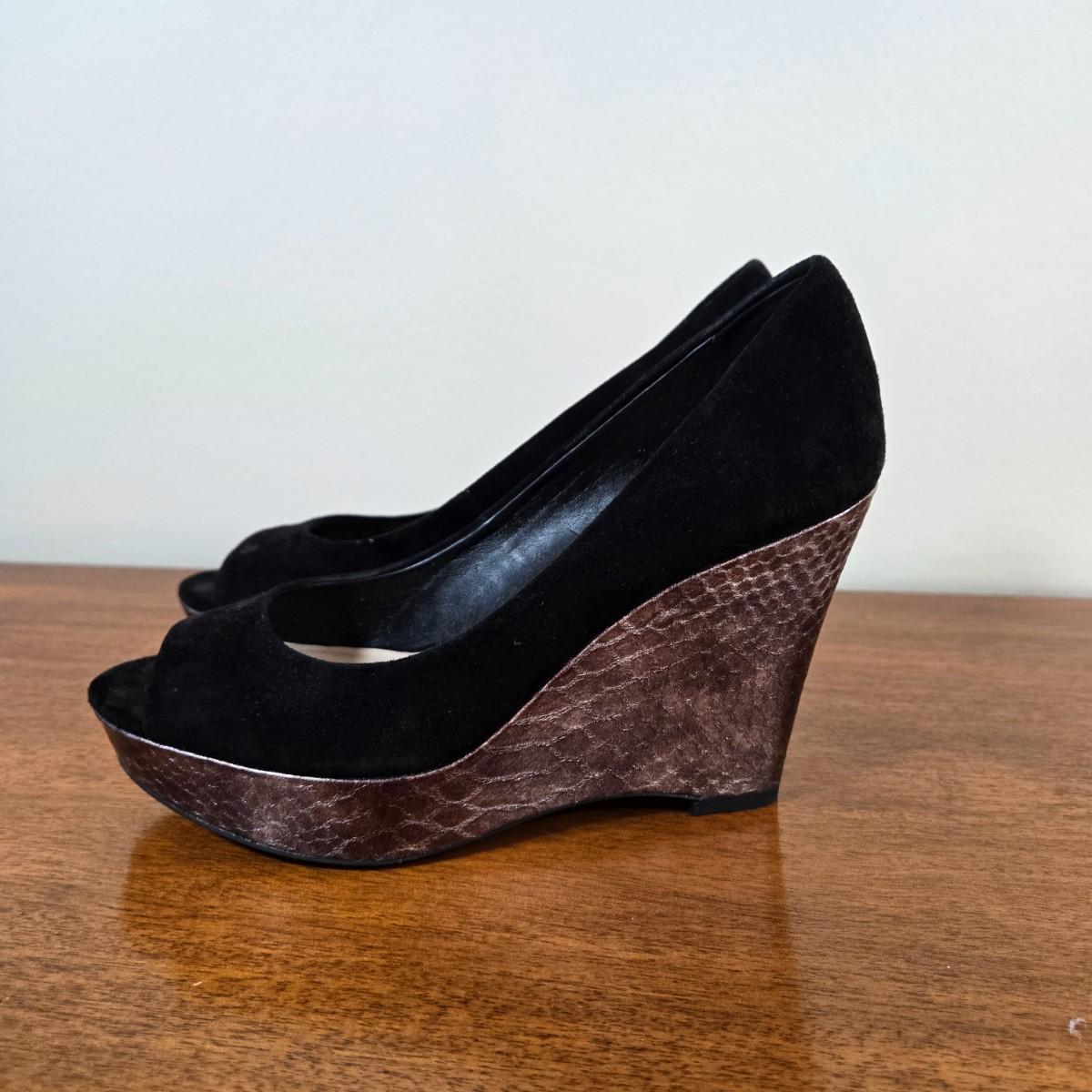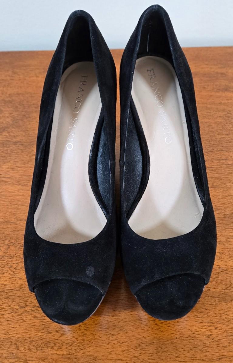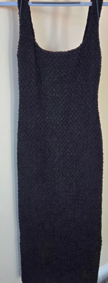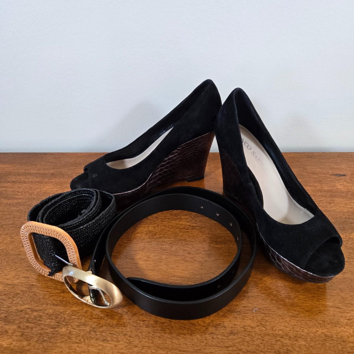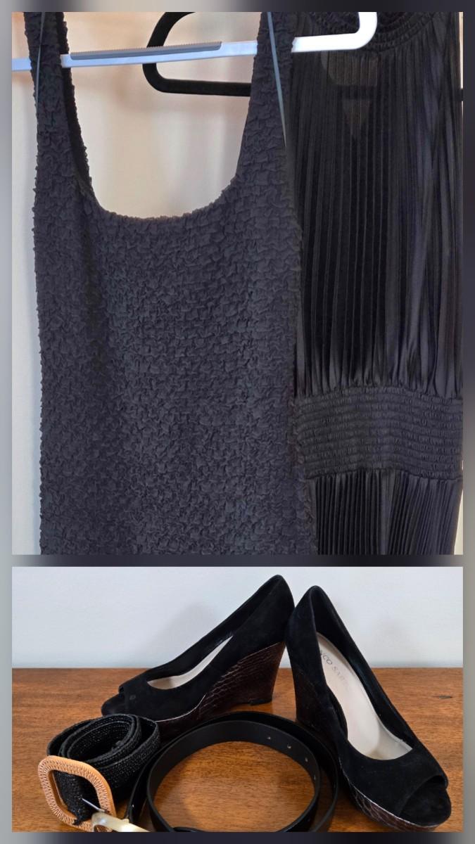 LOT 213W: Two Black Dresses, Wedge Open Toed Shoes, and Two Black Belts
