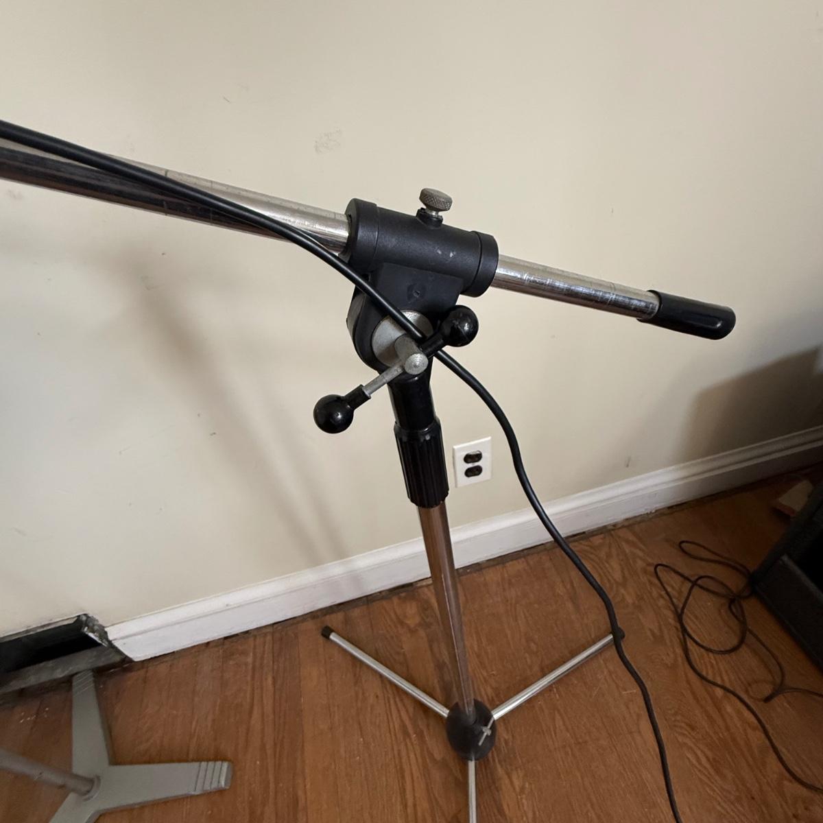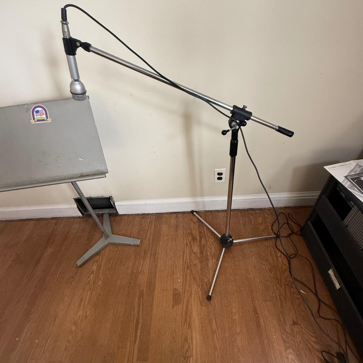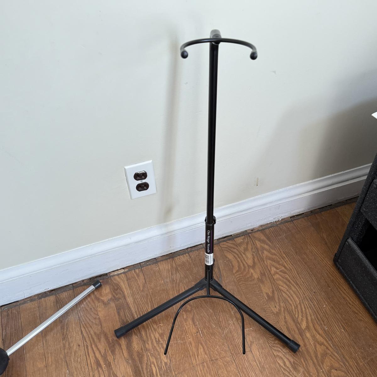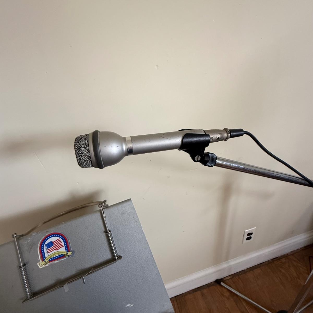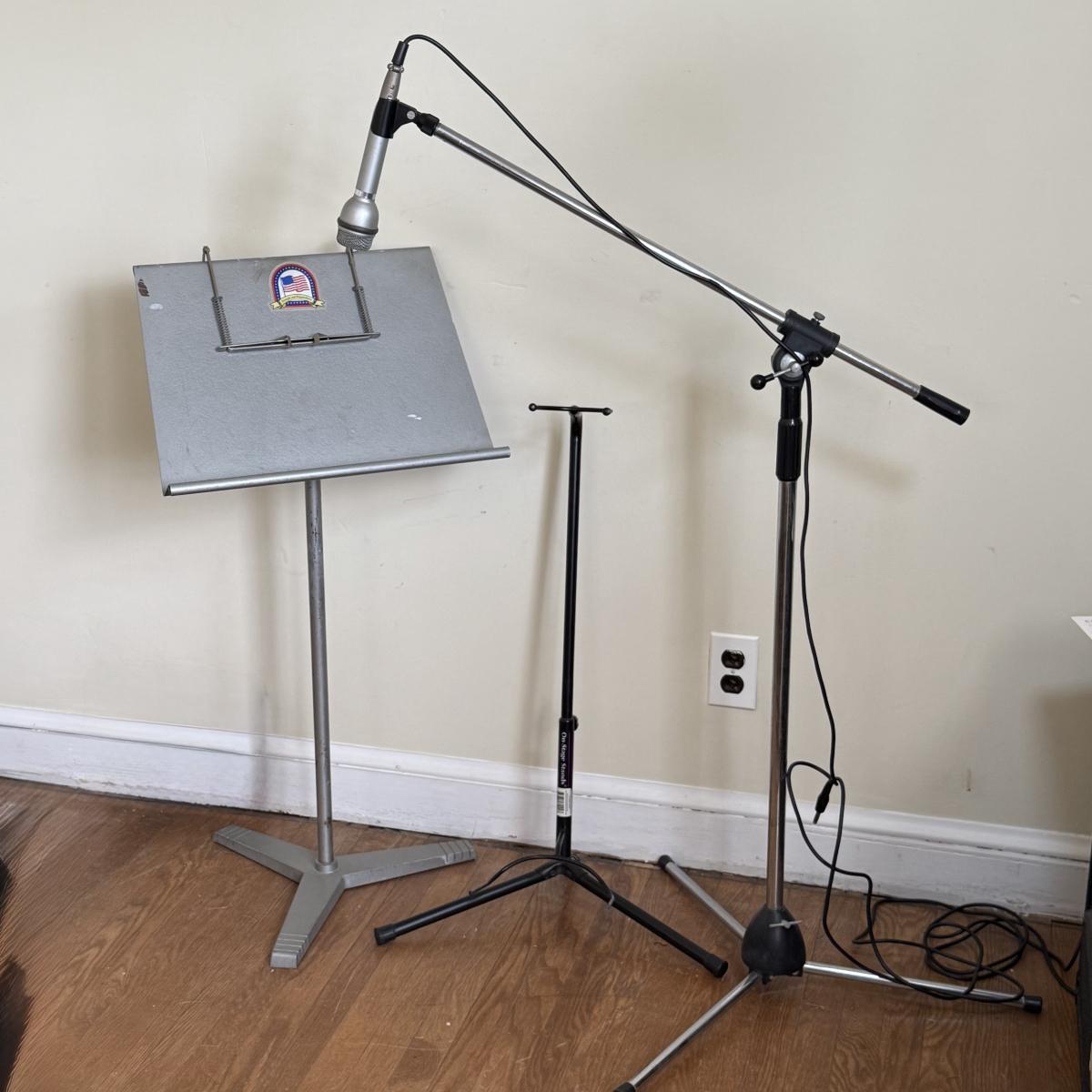 LOT 38: Vintage Wenger Metal Sheet Music Stand, Microphone Stand with Vintage Microphone and One Stage Guitar Stand