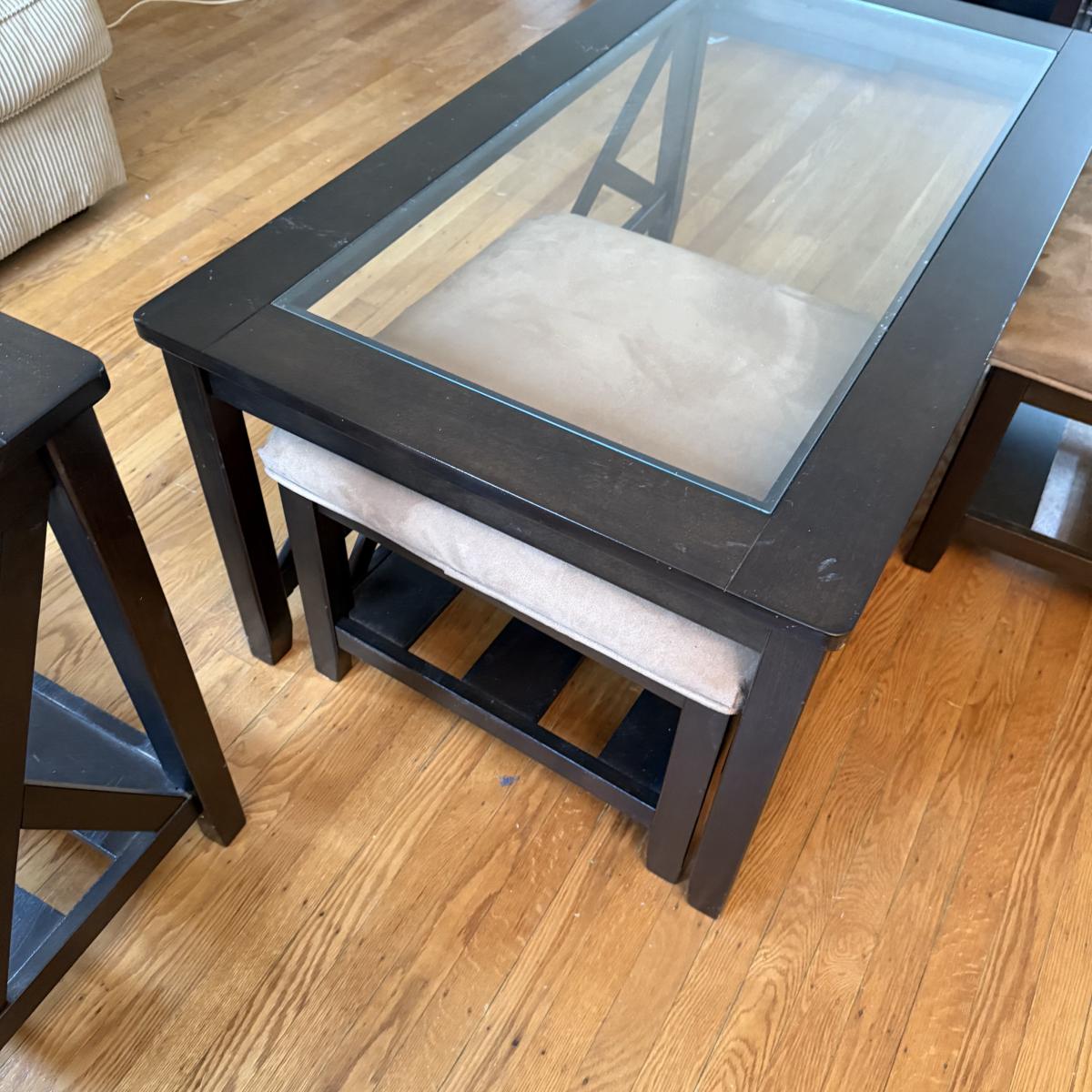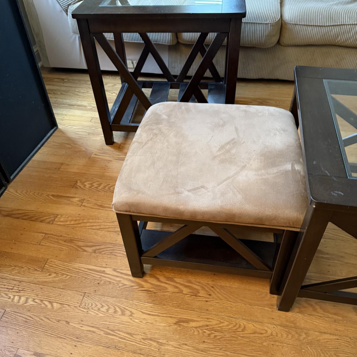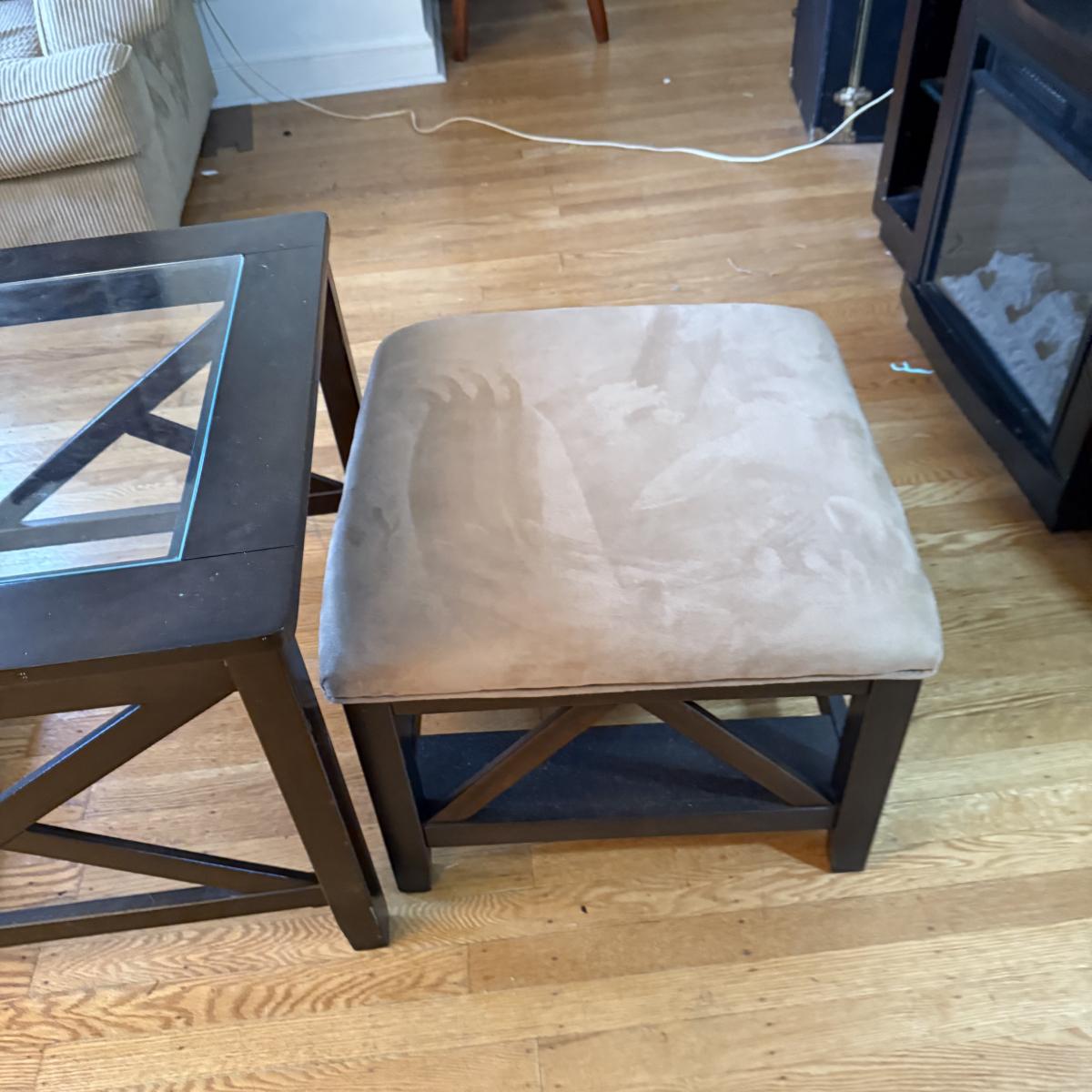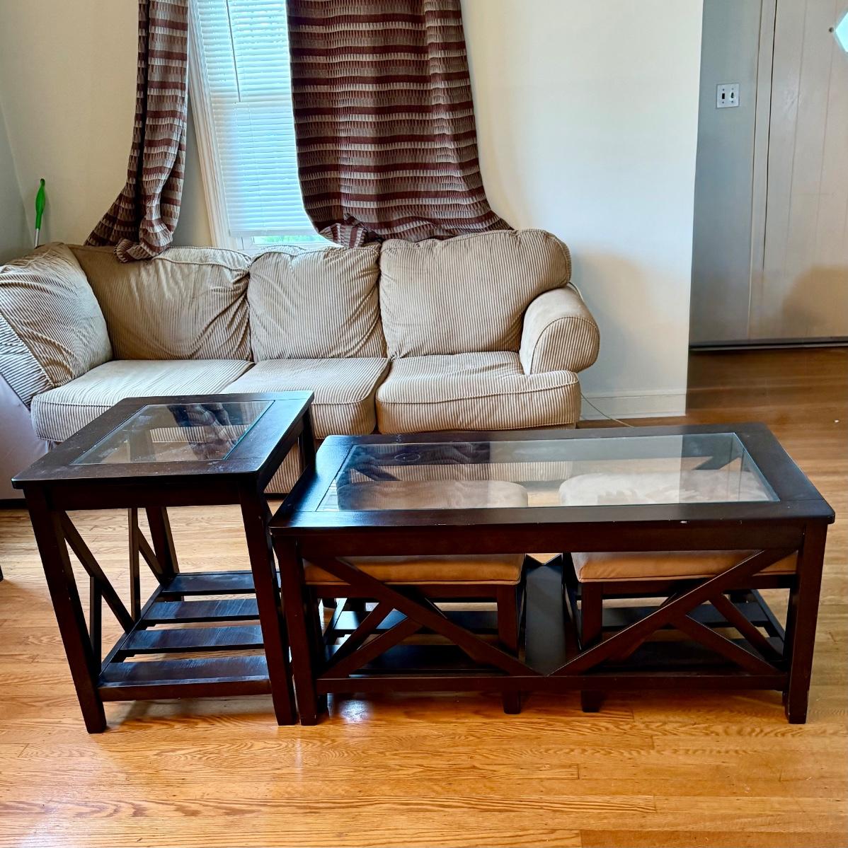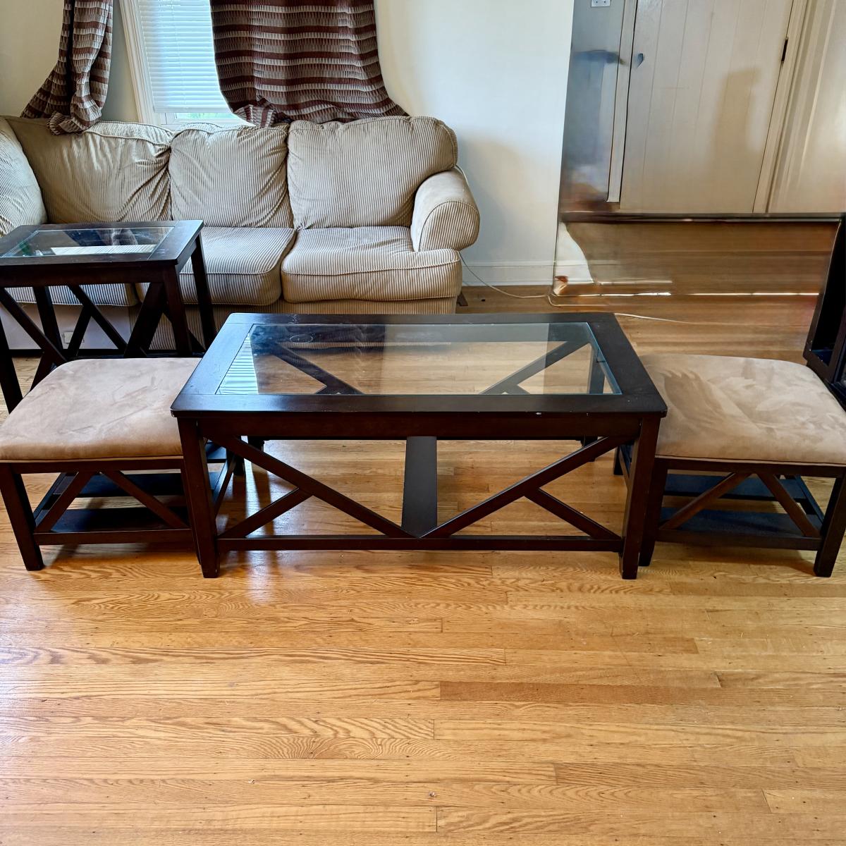 LOT 48: Glass Top Side Table and Coffee Table with Stowaway Ottomans