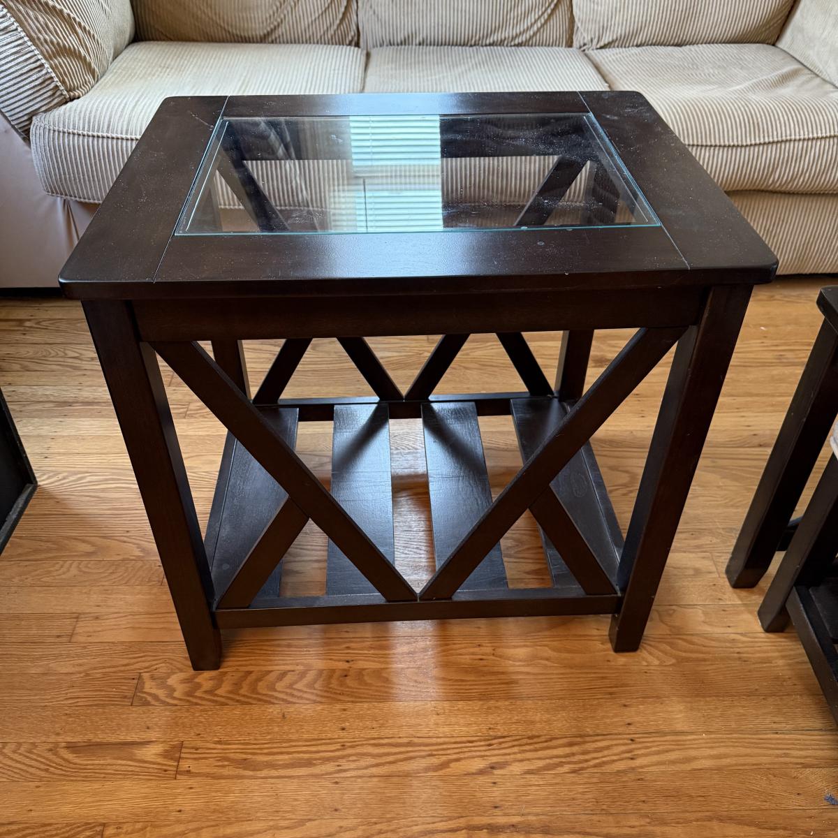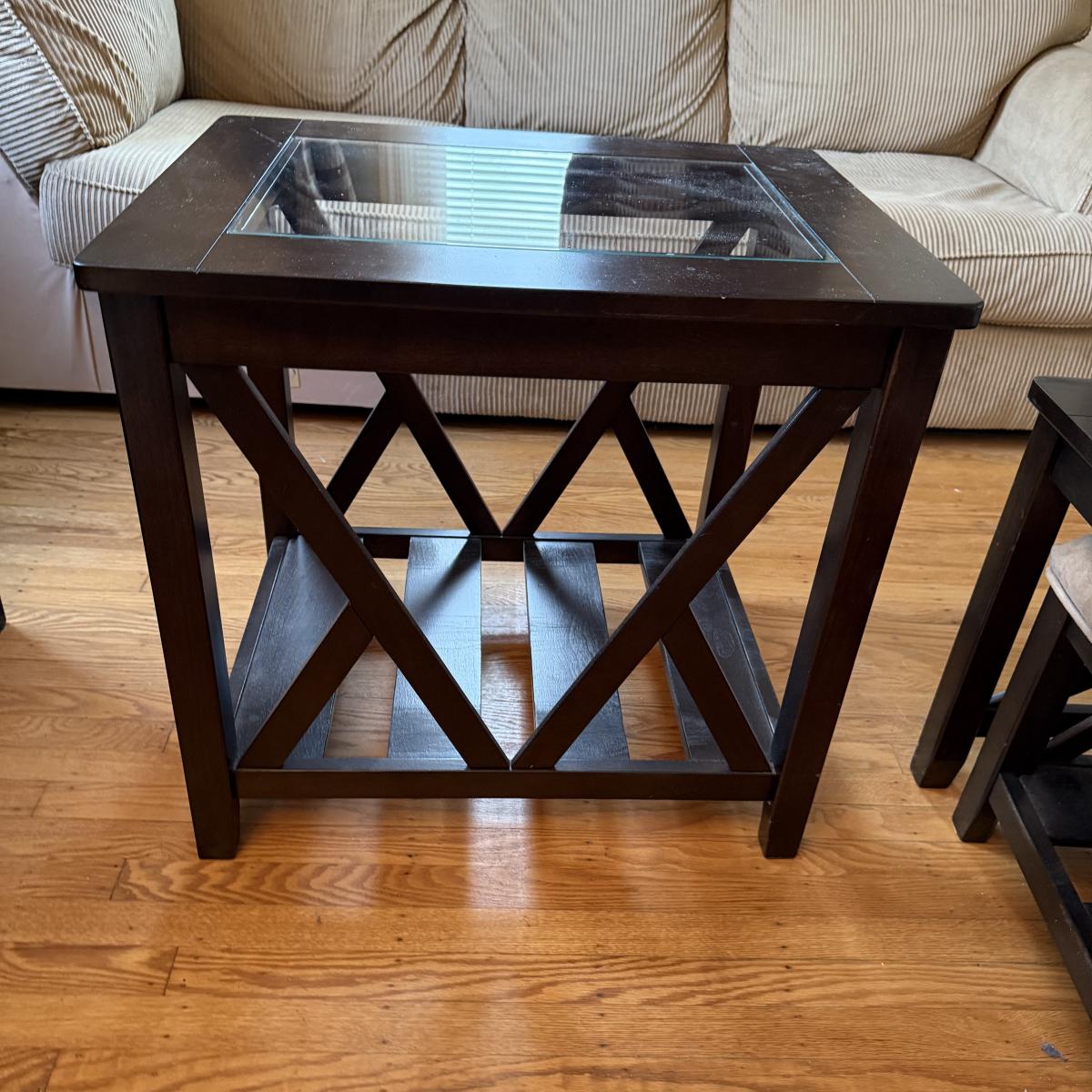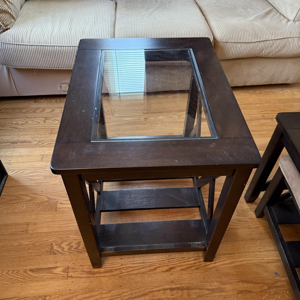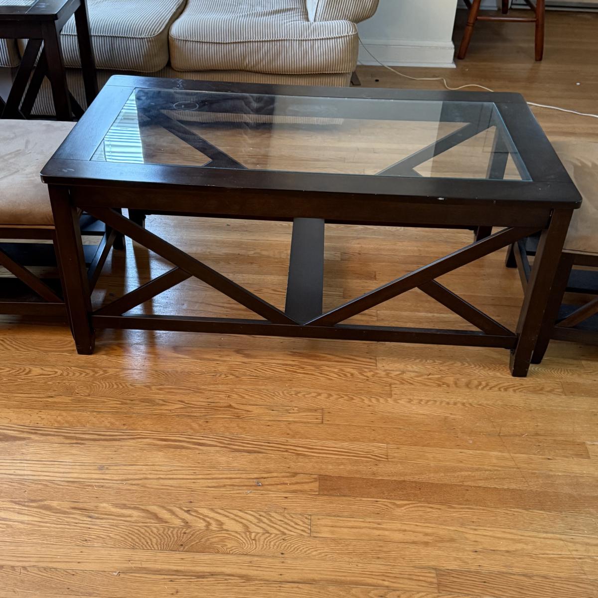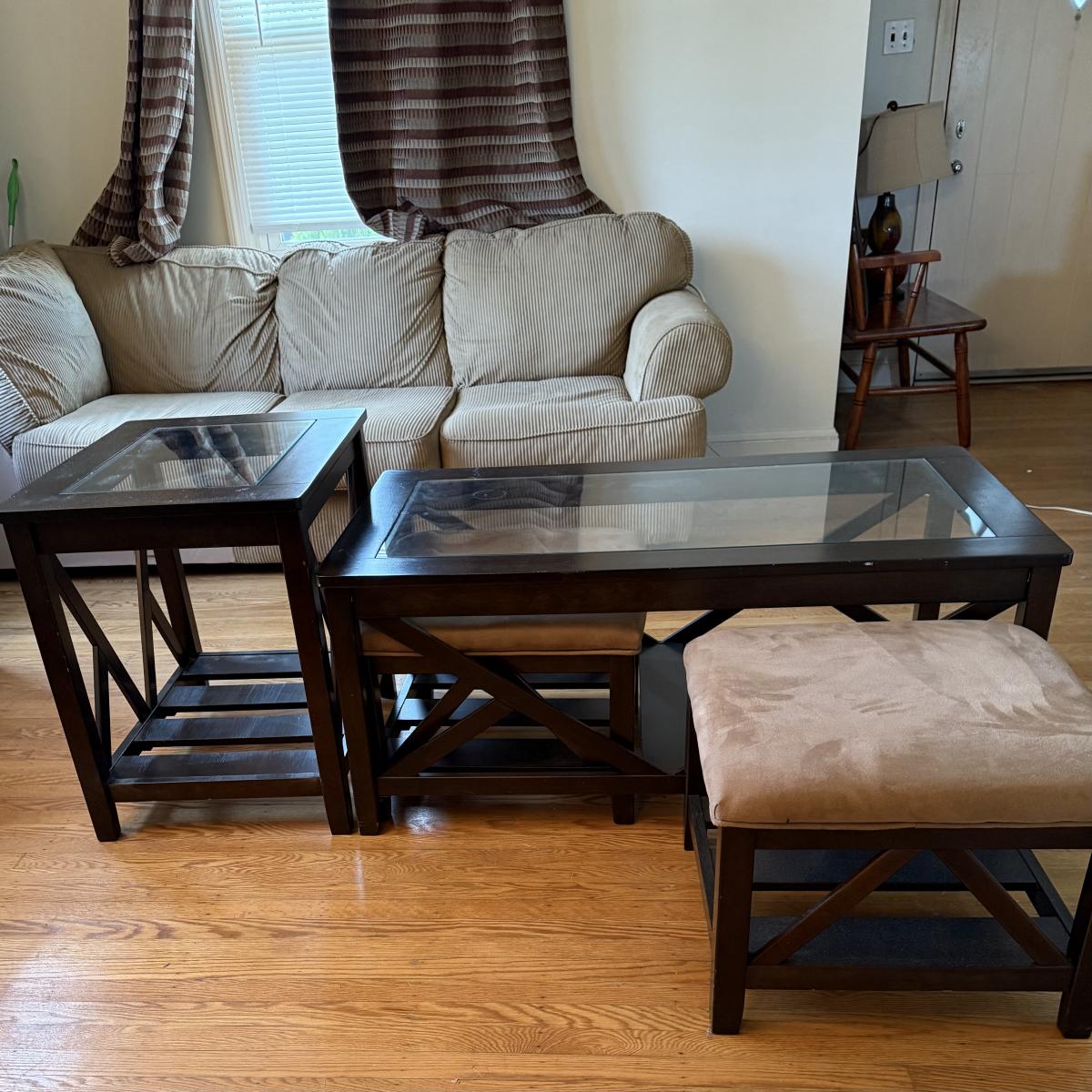 LOT 48: Glass Top Side Table and Coffee Table with Stowaway Ottomans