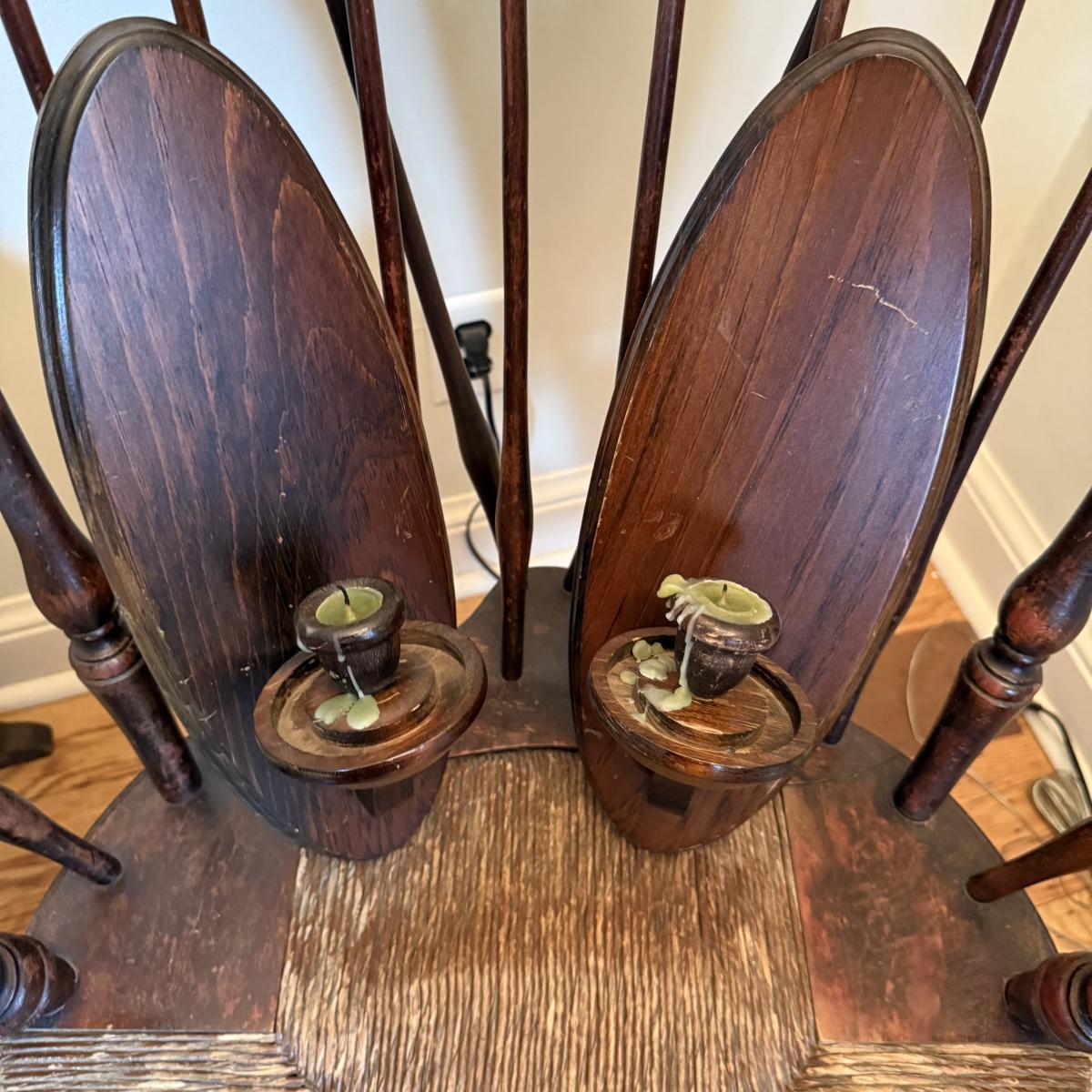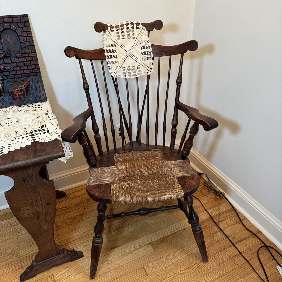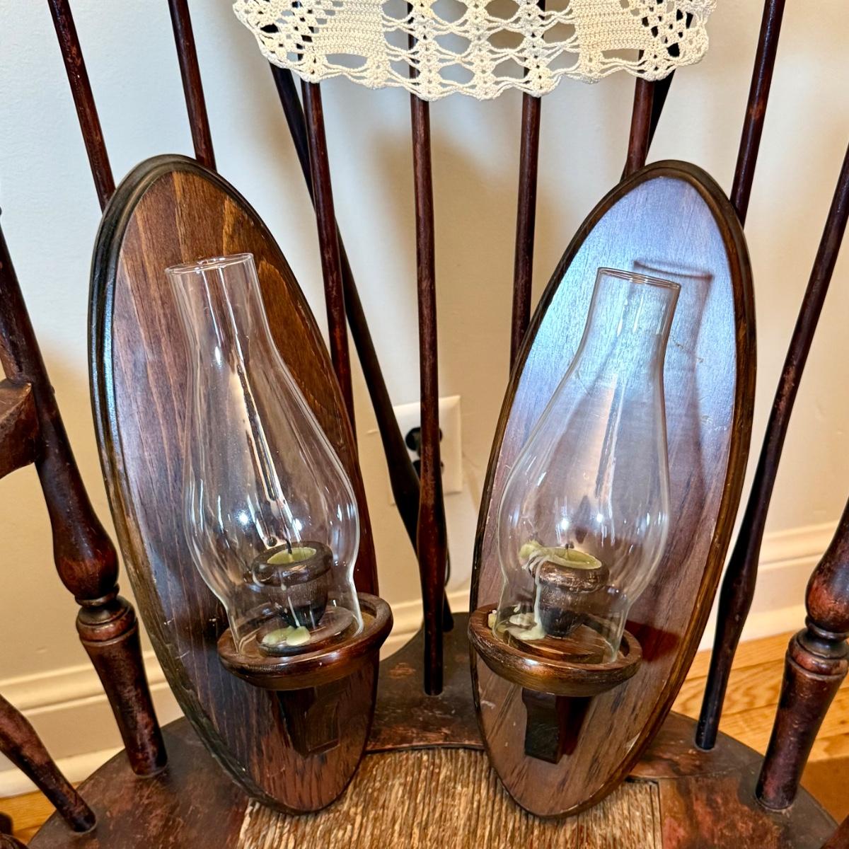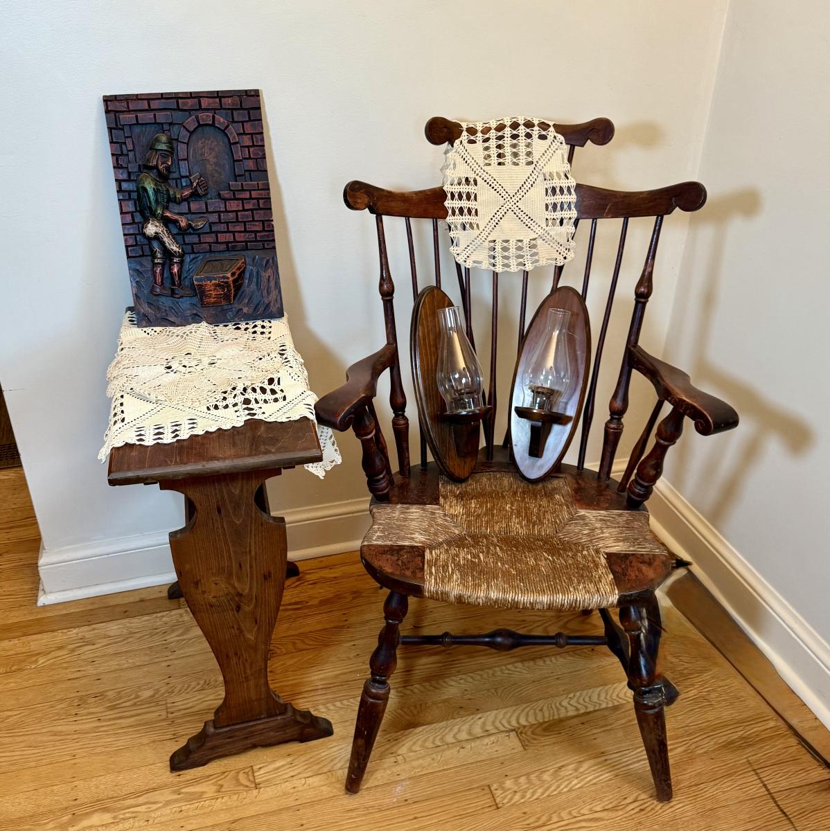 LOT 49: Vintage/Antique Chair with Cane Seat, Wooden Wall Scones, Side Table Lace Doilies and Wall Art
