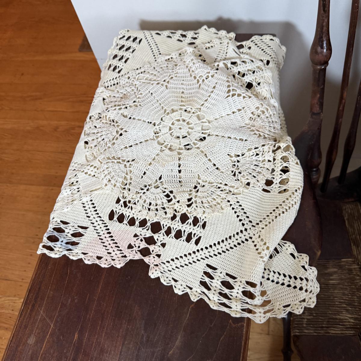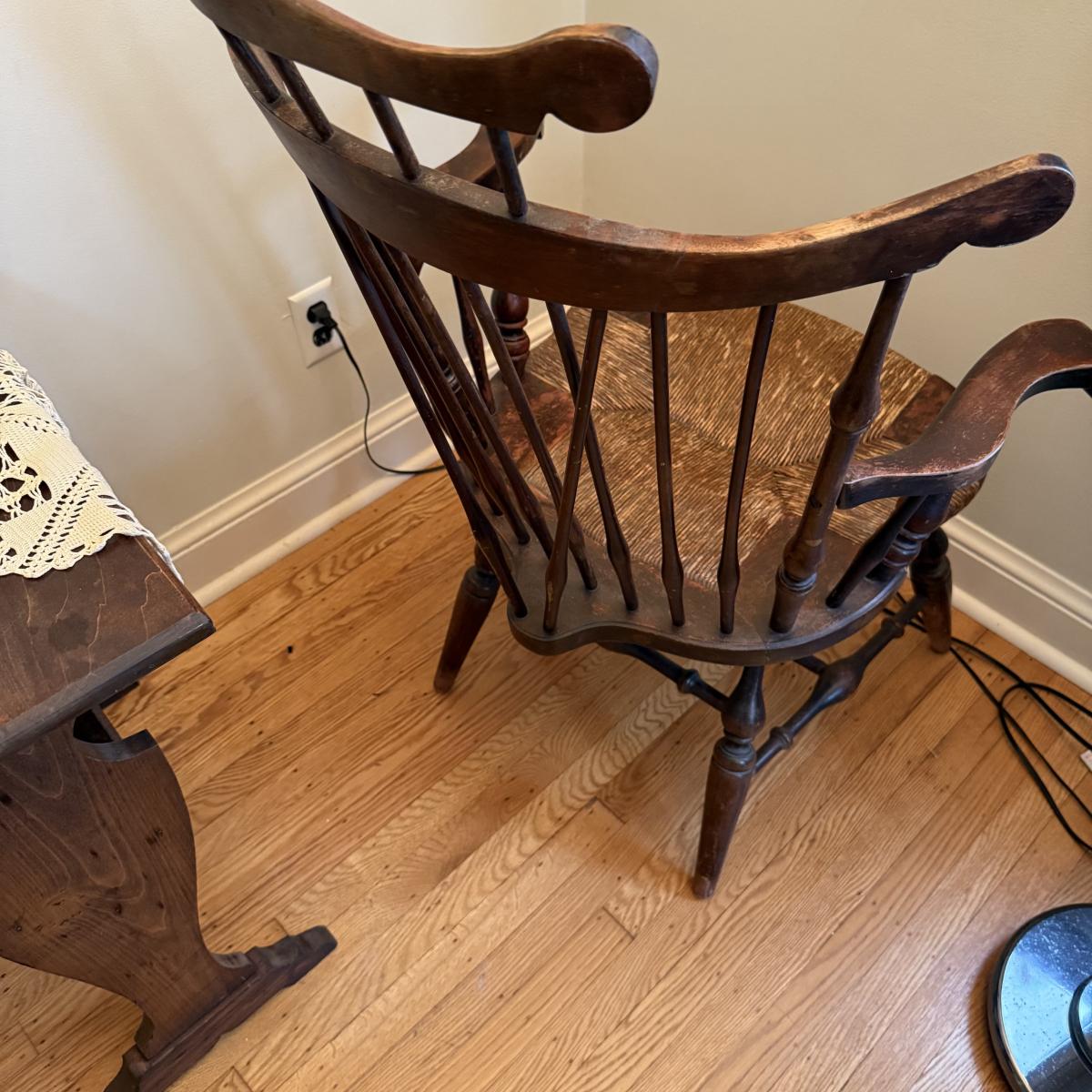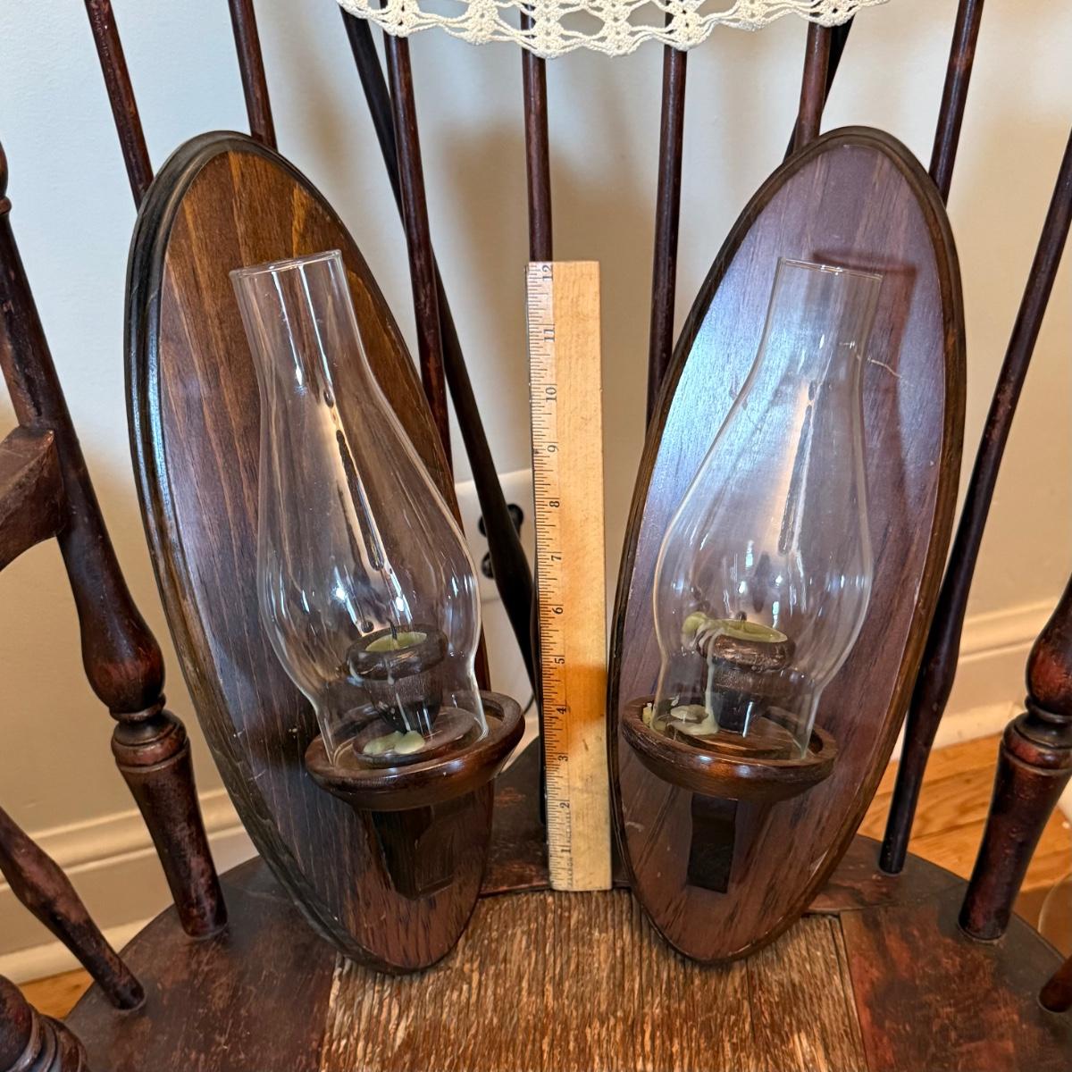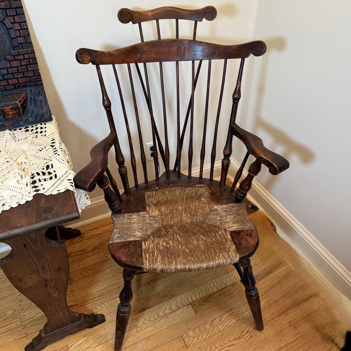 LOT 49: Vintage/Antique Chair with Cane Seat, Wooden Wall Scones, Side Table Lace Doilies and Wall Art