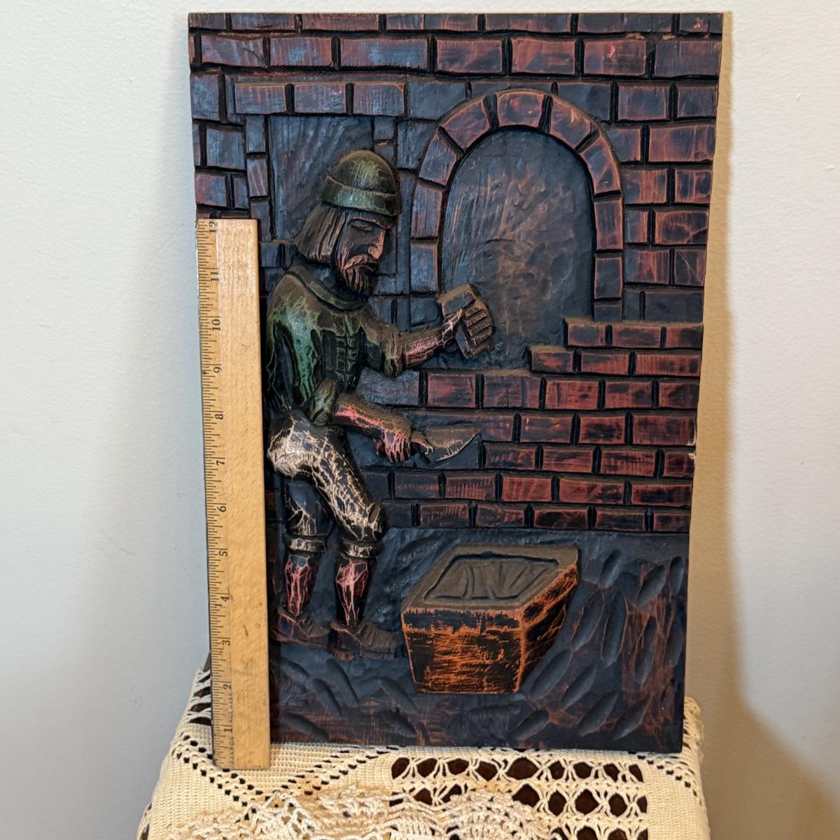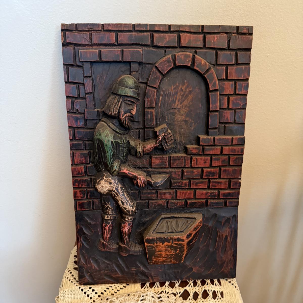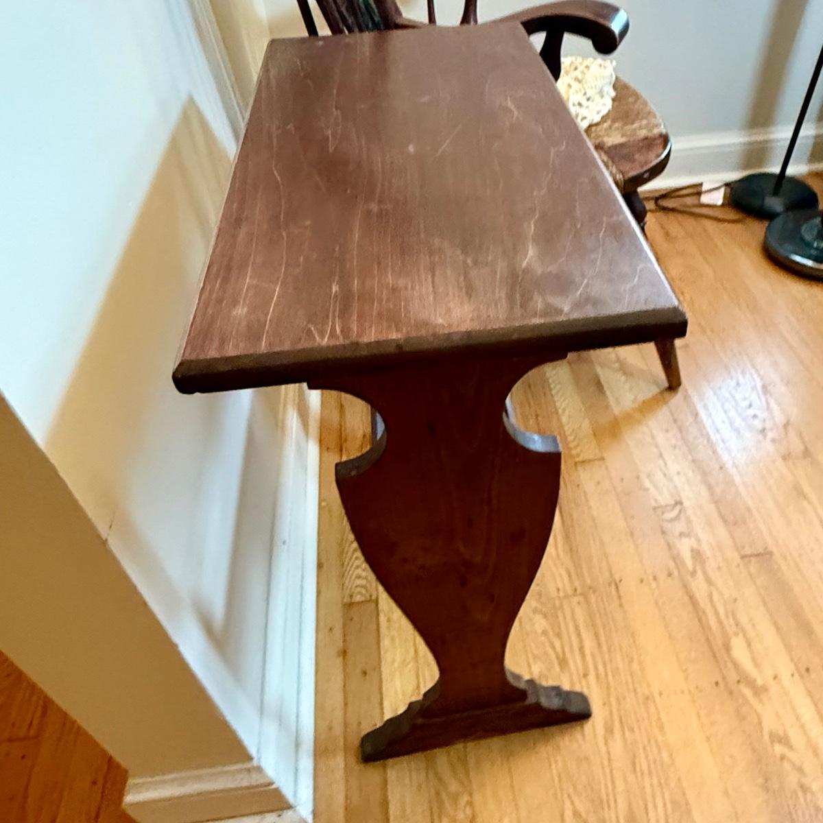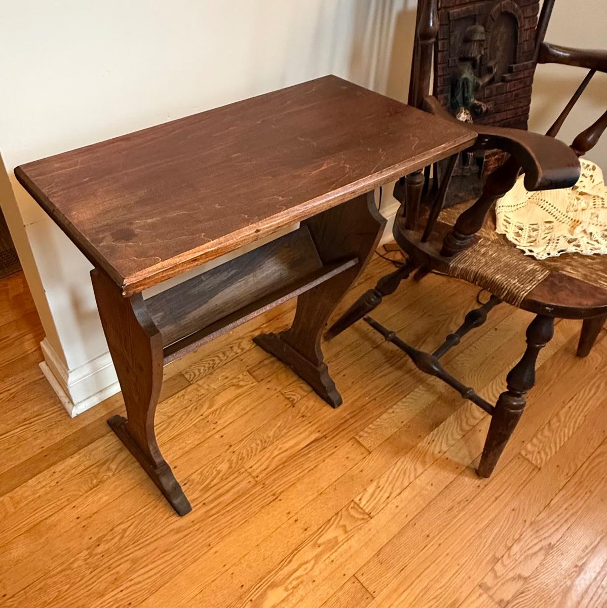 LOT 49: Vintage/Antique Chair with Cane Seat, Wooden Wall Scones, Side Table Lace Doilies and Wall Art