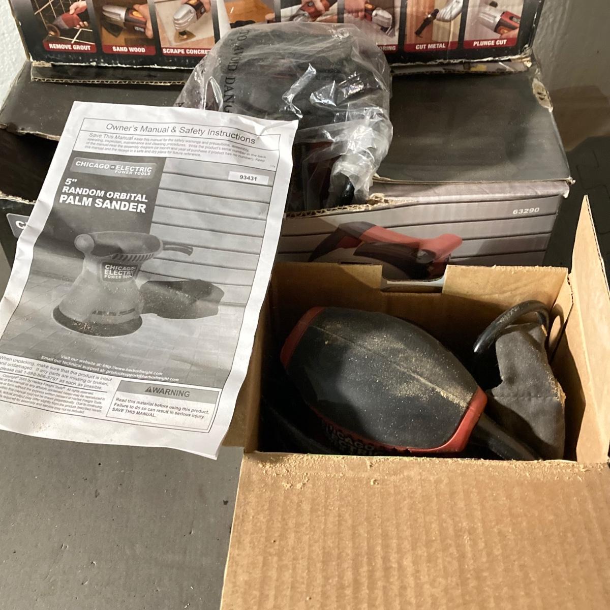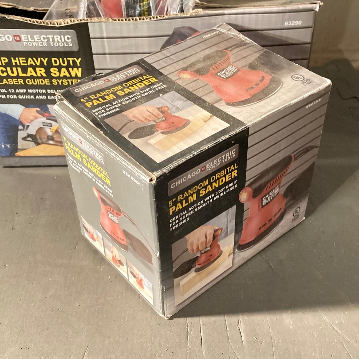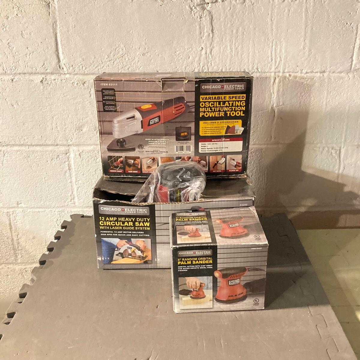 LOT 59: Chicago Electric Power Tools Collection - Multi Function Power Tool, Circular Saw and Orbital Palm Sander in Original Boxes